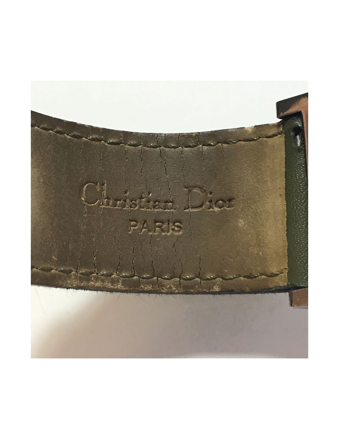Shows DIOR man square steel and khaki leather strap. The dial color: gold. Quartz movement. Silver folding loop.