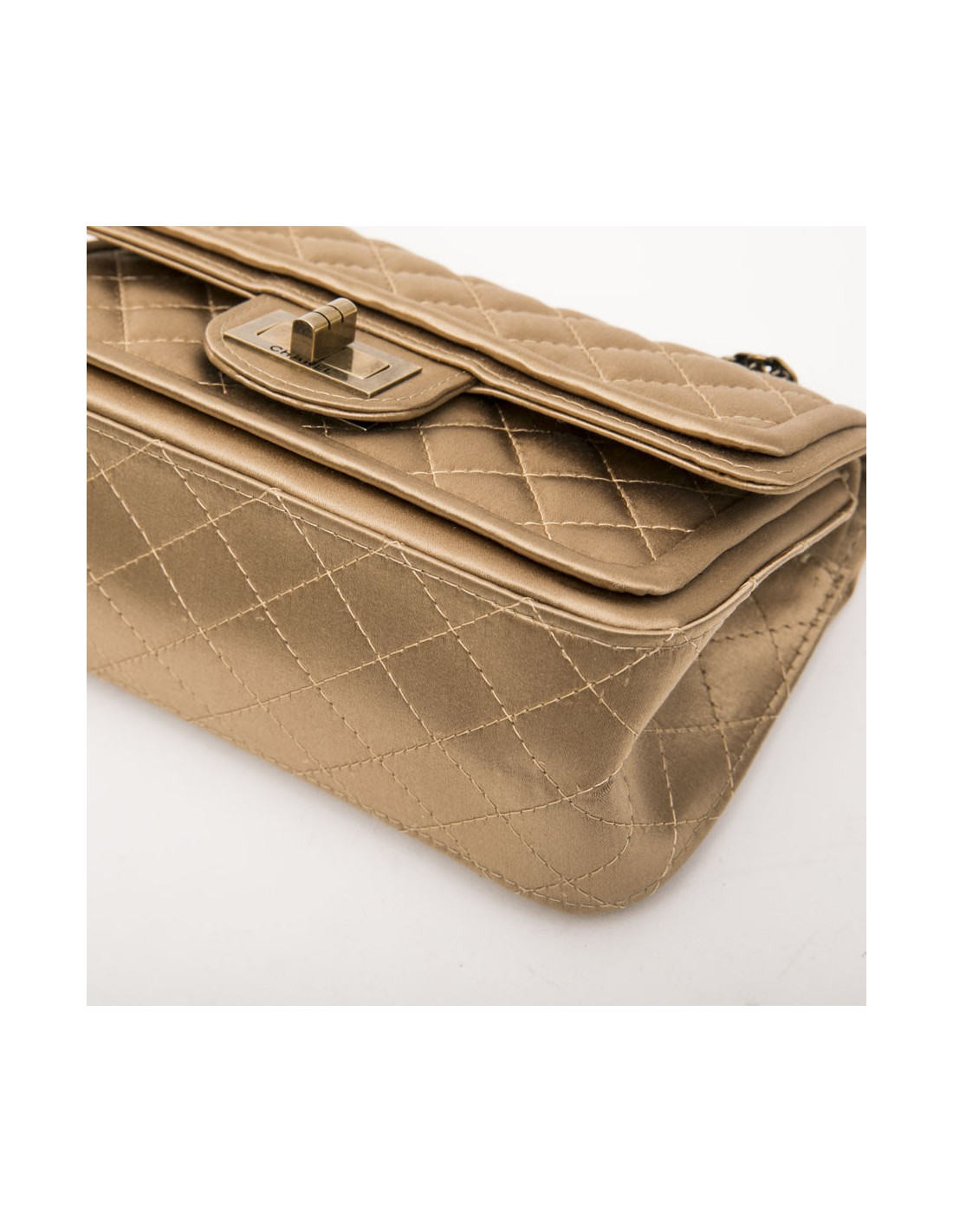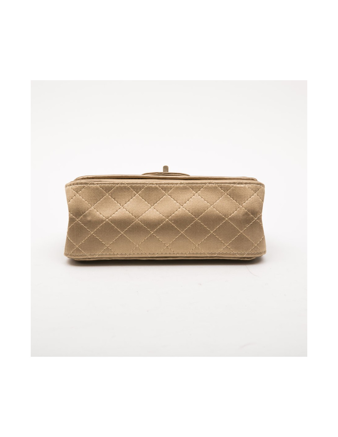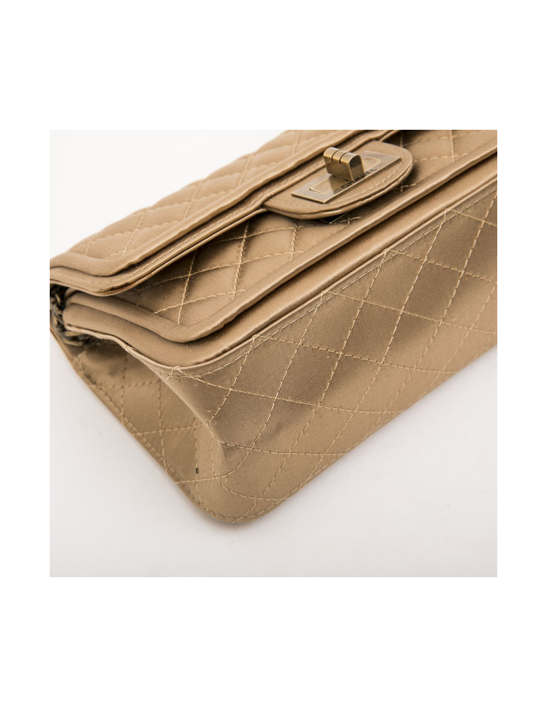 Sac Chanel "Paris-Shanghai" en satin duchesse doré. Bijouterie dorée mate vieillie. Fermoir 2.55. Collection Automne-Hiver 2013. Double rabat.