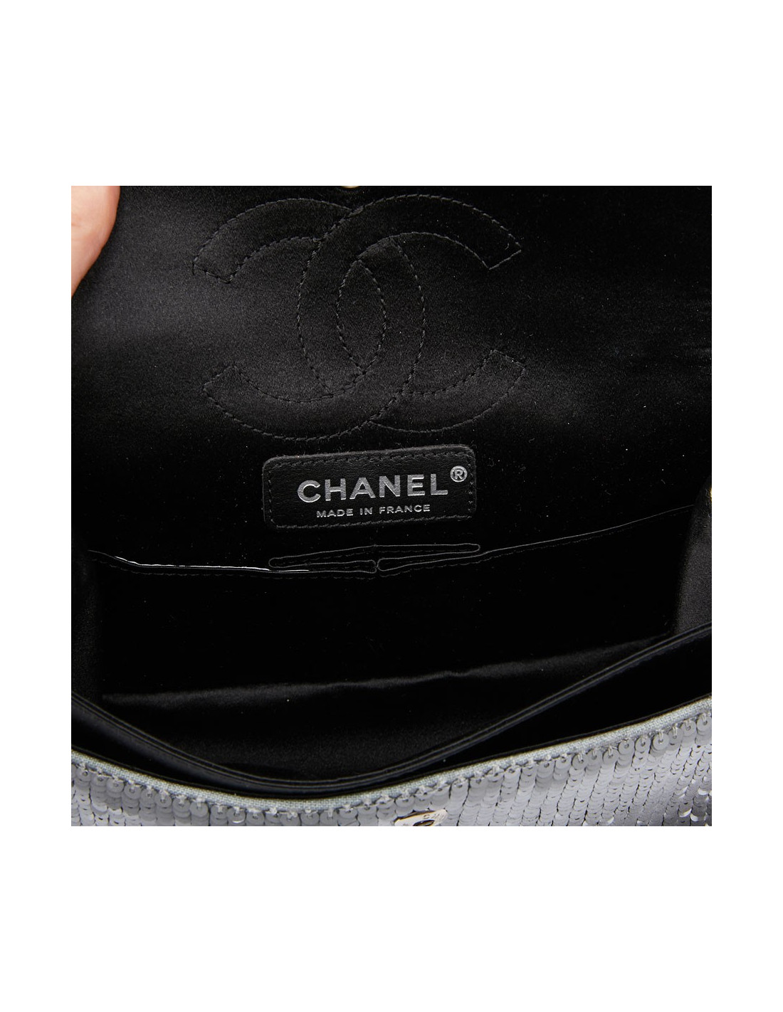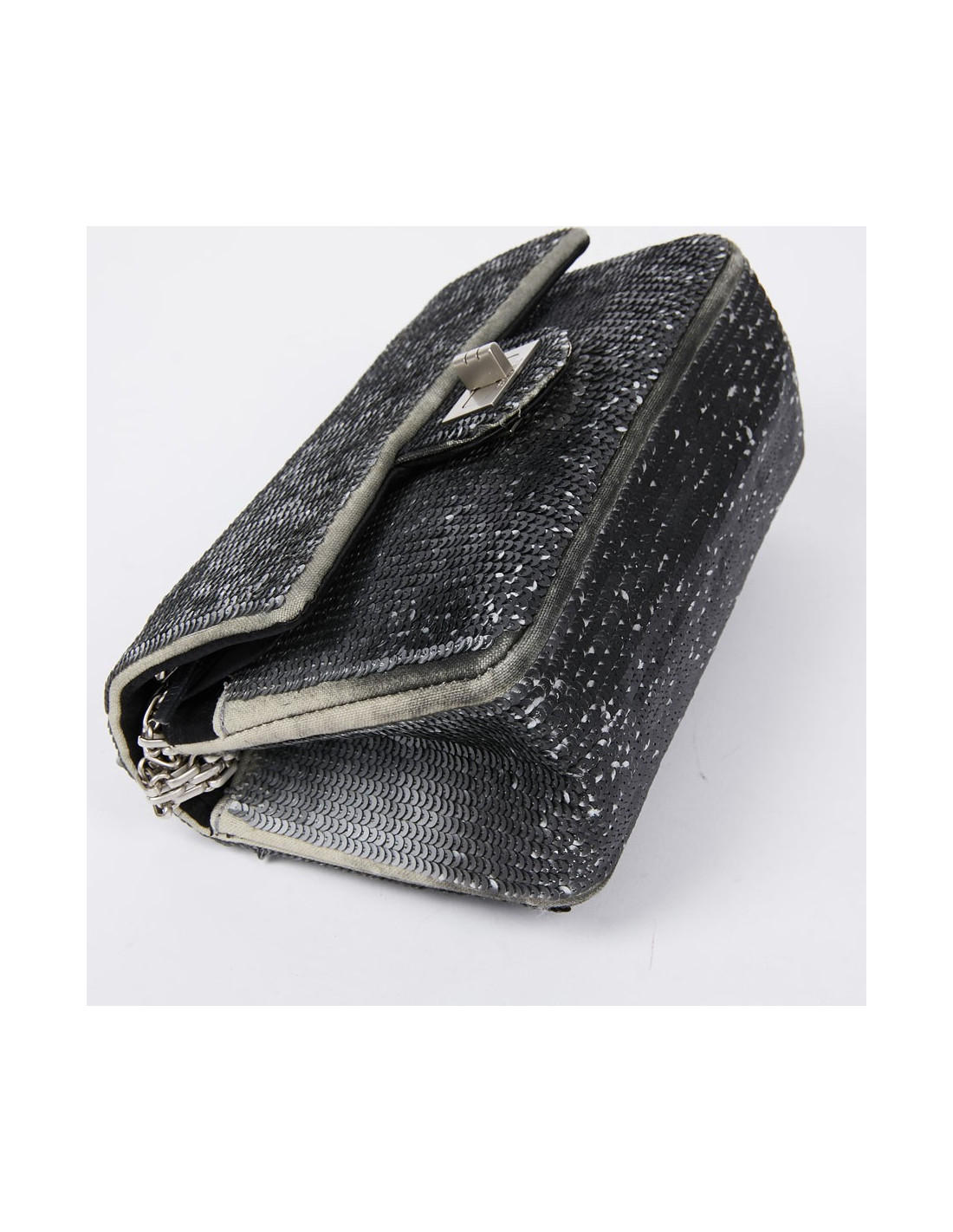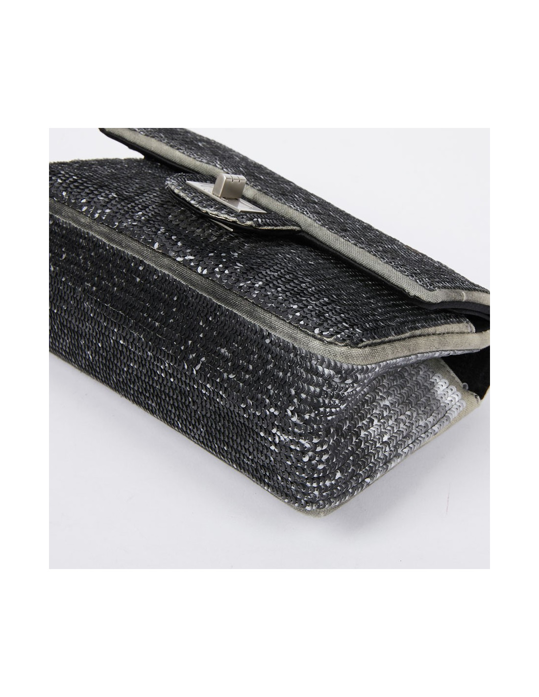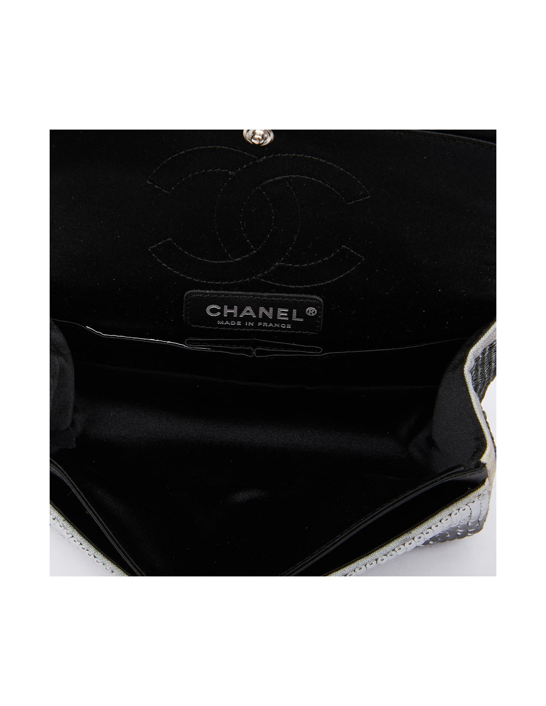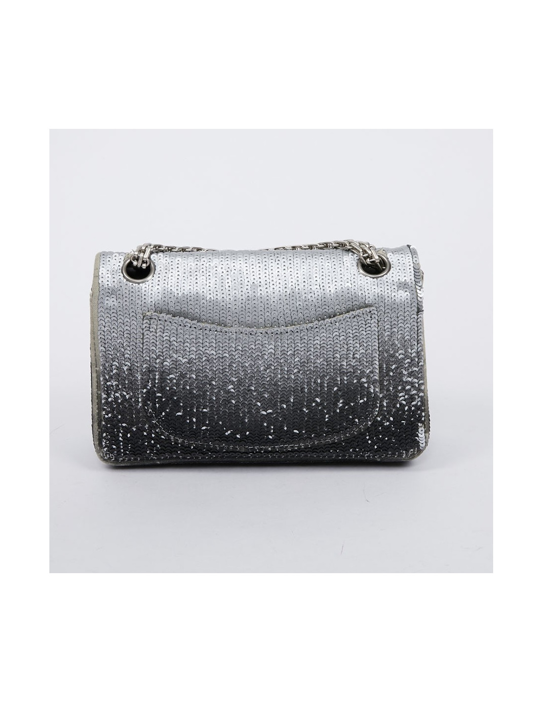 Ravissant sac de jour comme du soir de la Maison CHANEL en toile brodée de sequins avec un dégradé noir et argent. Double rabat. L'intérieur est en satin duchesse noir avec 3 poches fente. La bijouterie est en métal argenté mat.