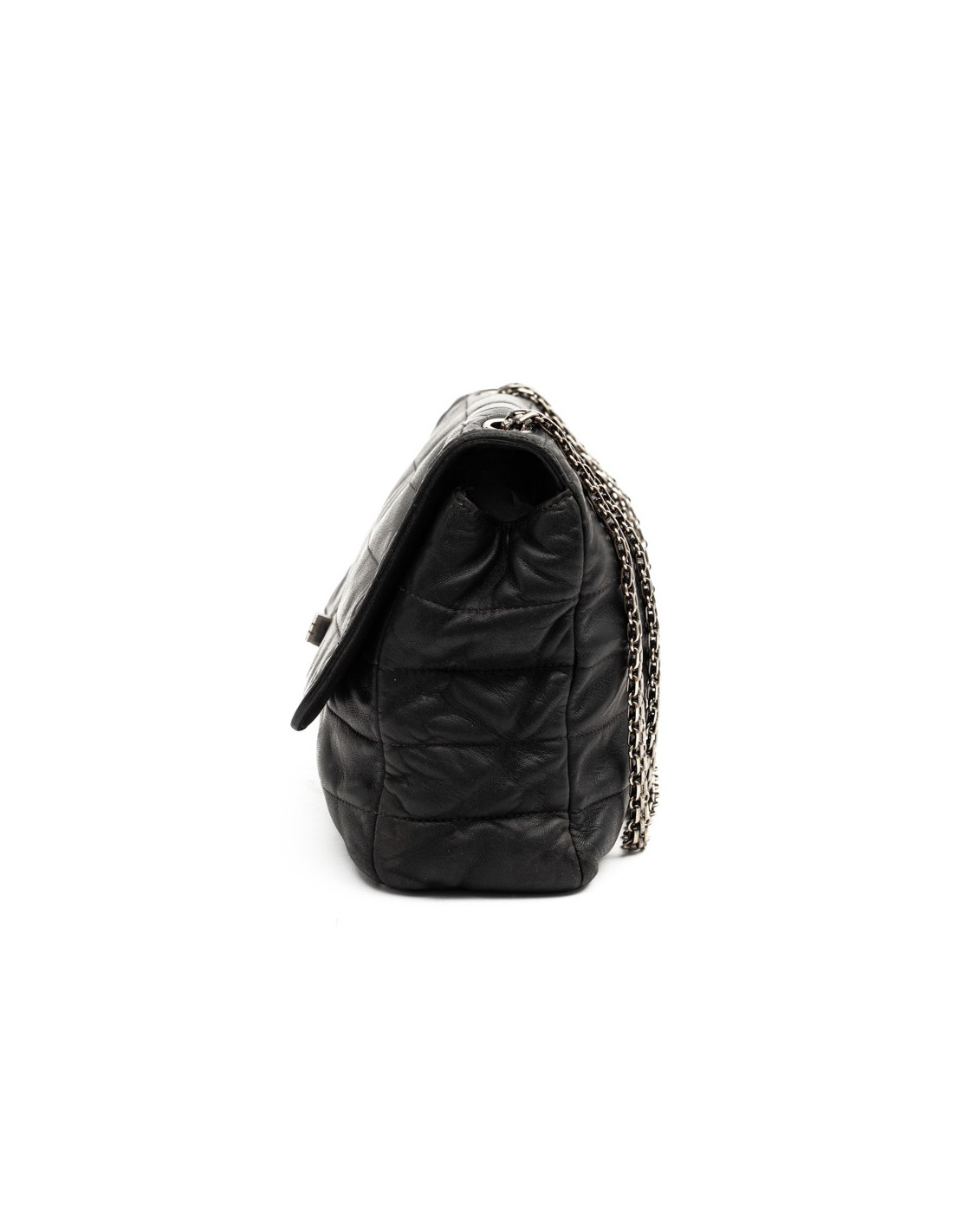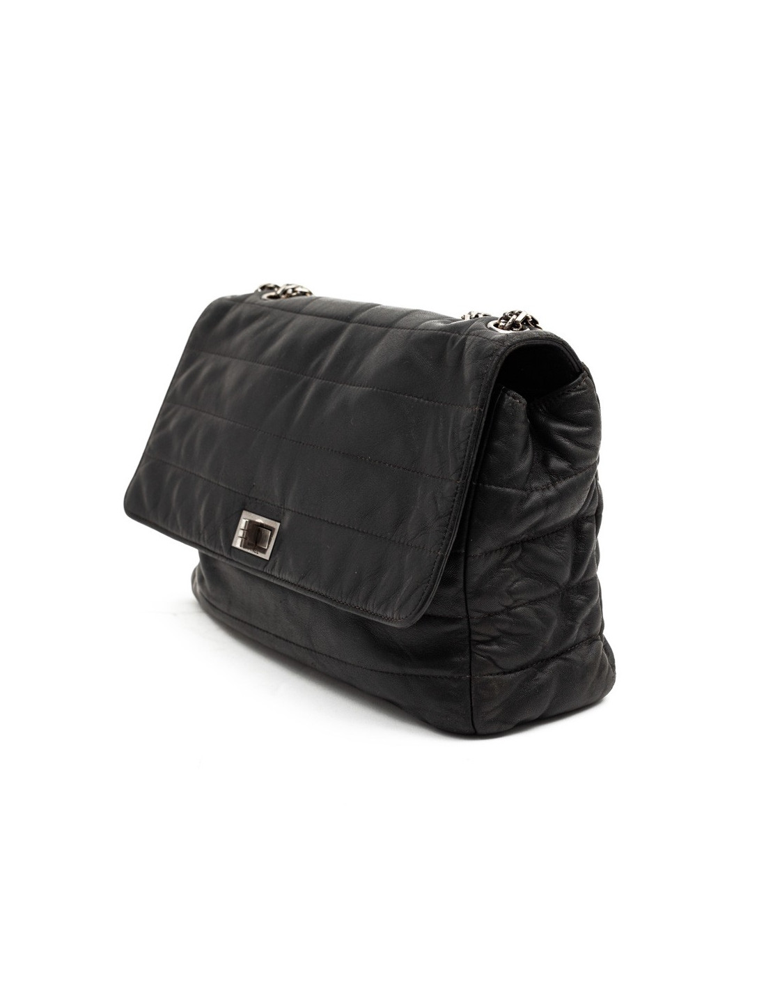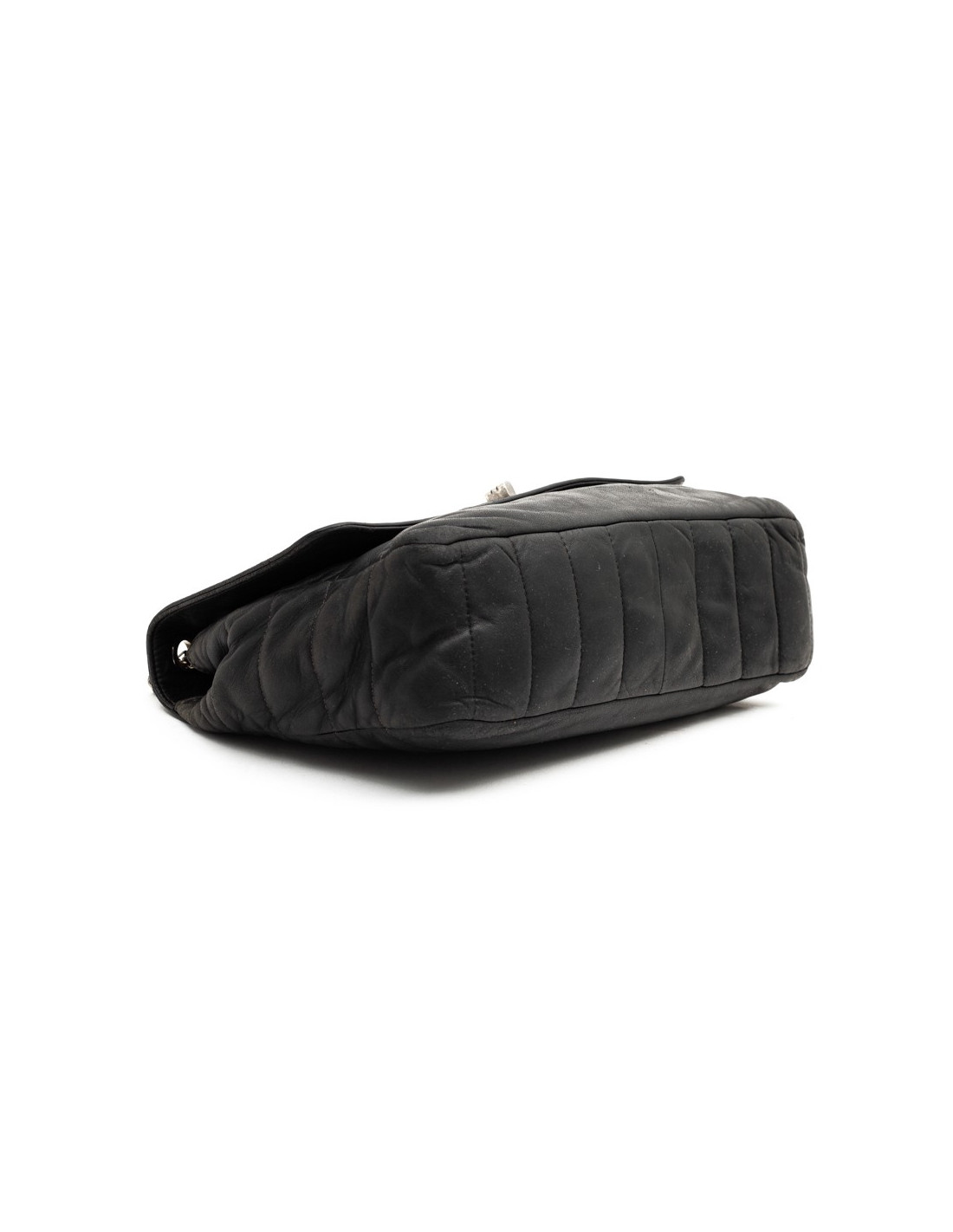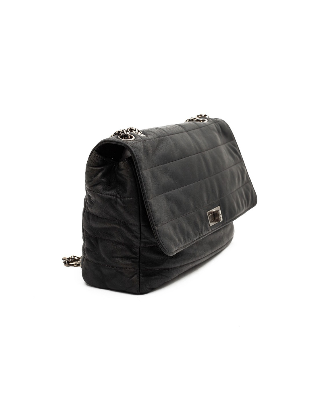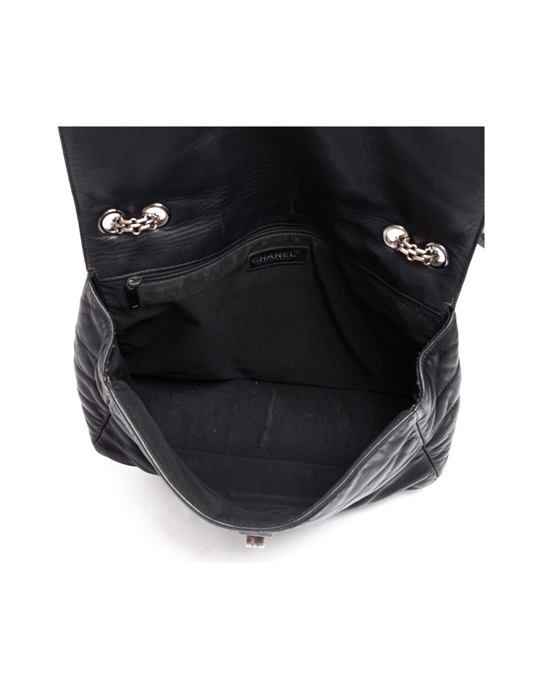 De grande légèreté, ce sac avec boucle 2.55, en cuir d'agneau lisse noir. Il est en bon état d'usage. Il se porte à l'épaule ou croisé. Les attributs sont en métal argent vieilli (micro rayures). L'intérieur est doublé en toile noire par endroits elle est légèrement marquée par l'utilisation du sac., avec une poche zippée.