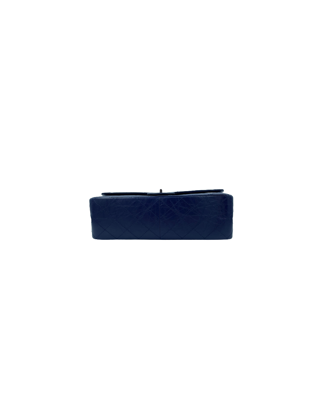 Pensé en Février 1955, ce sac à depuis été réinventé à chaque saison en différentes tailles, couleurs et matières. Ce sac Chanel est en cuir froissé encre et a une bijouterie en métal argent vieilli. Il est très bon état, pratiquement jamais servi.