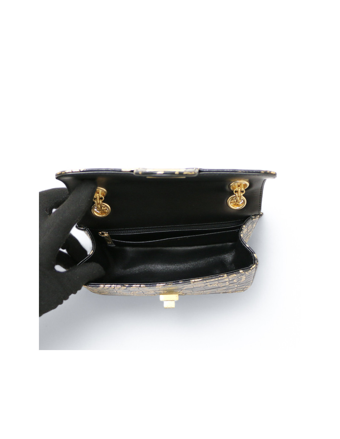 Détails : Sac de la dernière collection de Karl Lagerfeld pour Chanel, Métiers d'Arts Paris-New York, imprégné de l'inspiration égyptienne. Fabriqué en cuir de veau à l'aspect reptilien, ce sac est agrémenté de dessins et d'écritures qui évoquent un style graffiti. Une poche zippée à l'intérieur.