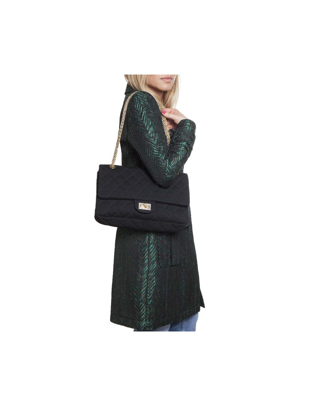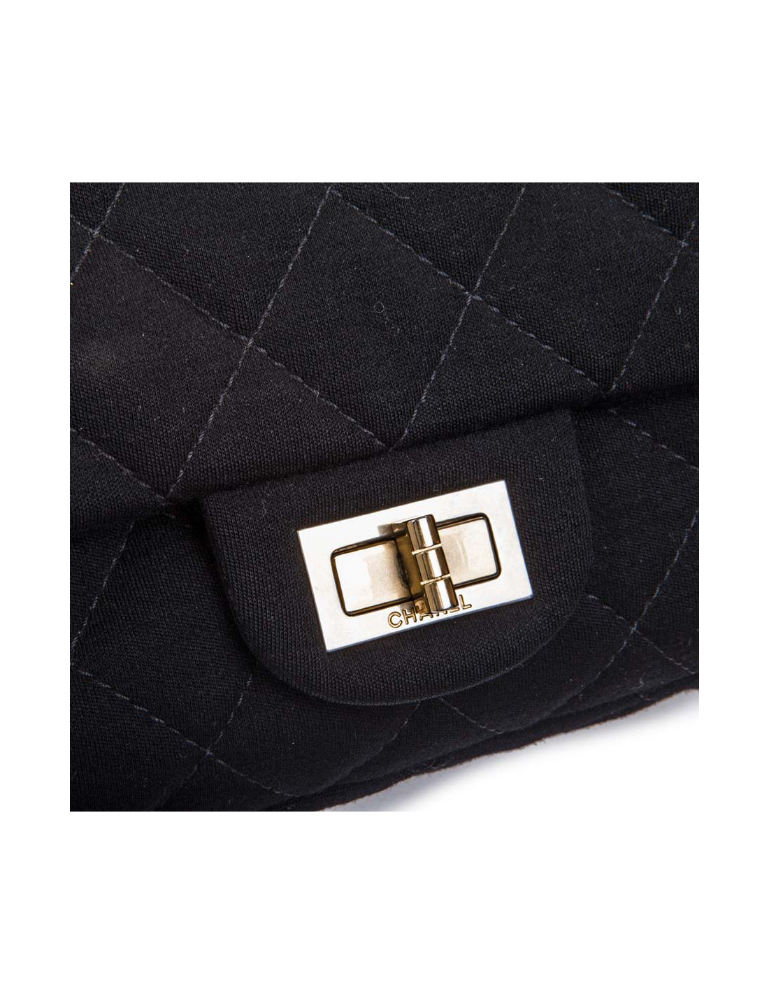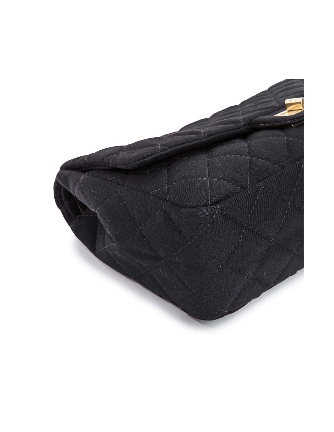 Sac 2.55 Jumbo en jersey noir de la Maison Chanel. L'accastillage est en métal doré vieilli. Double rabat. L'intérieur est en cuir noir. Porté épaule et en crossover. Hologramme: 1382...(2009 à 2010), pas de carte d'authenticité.