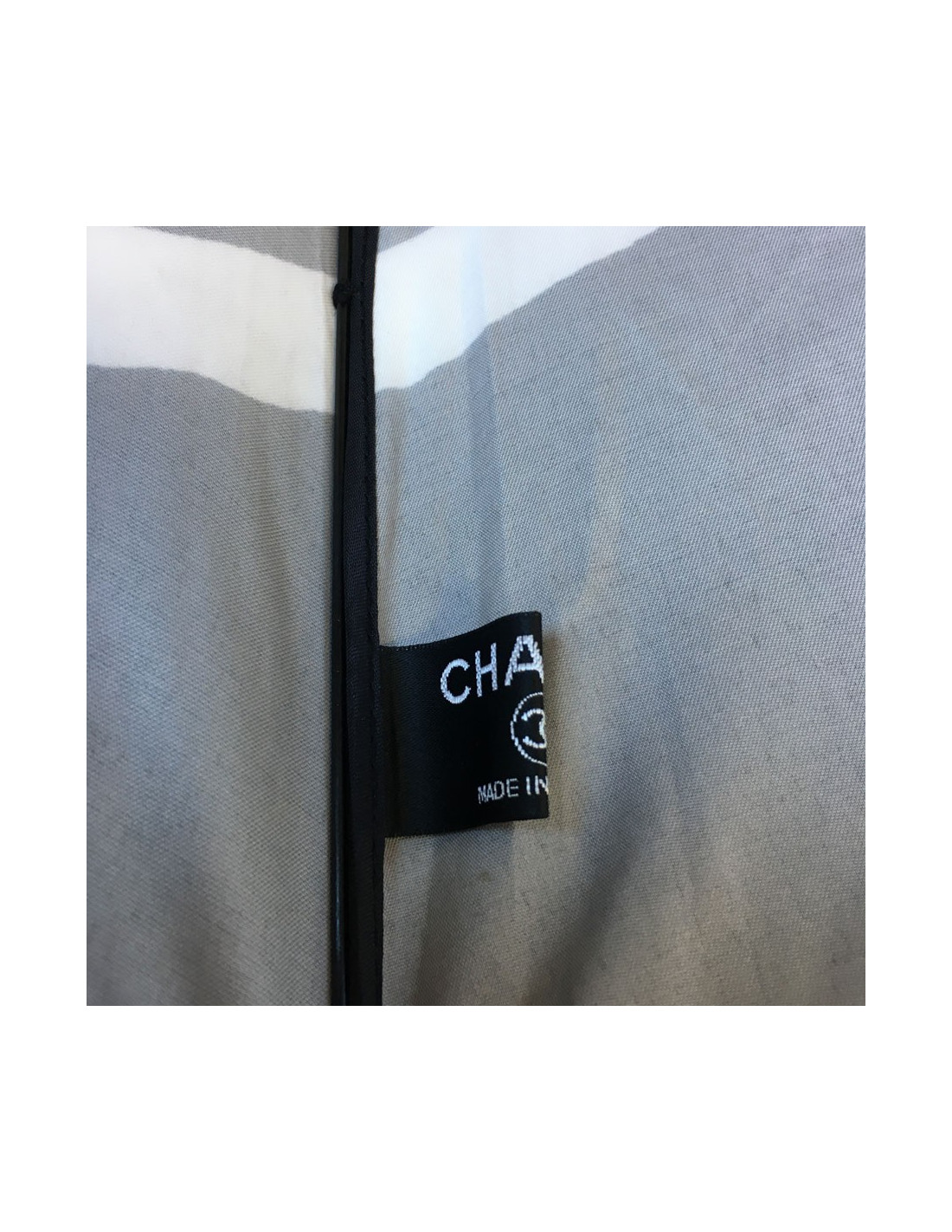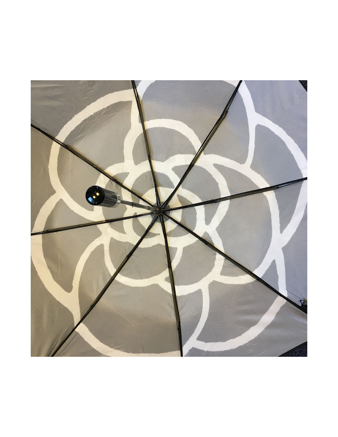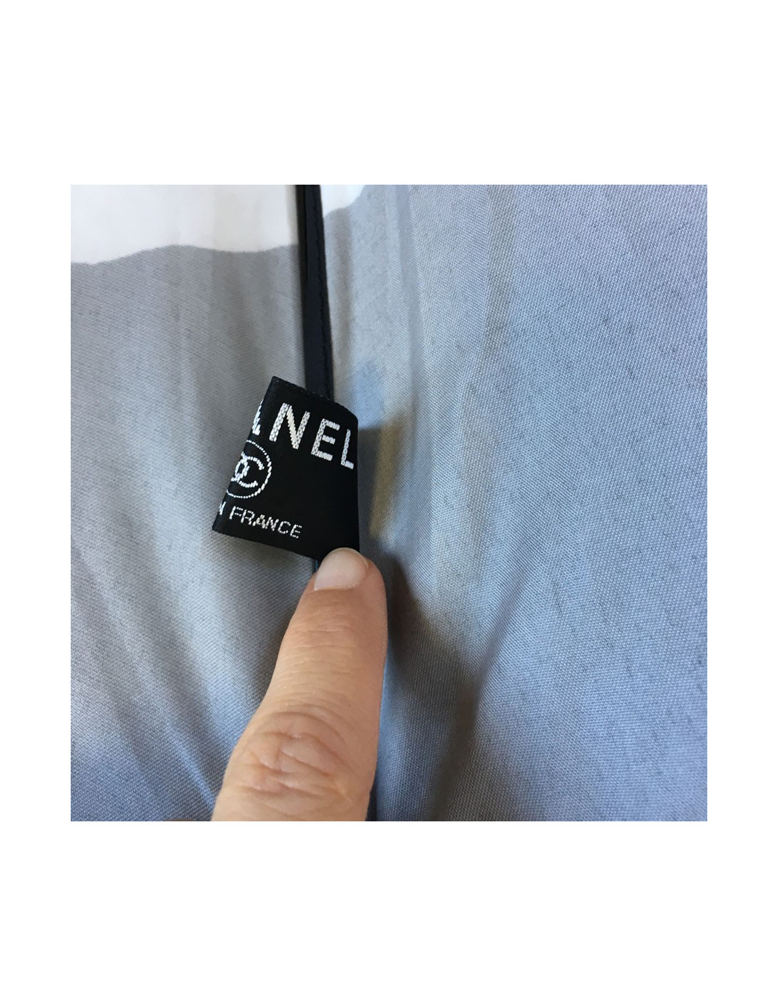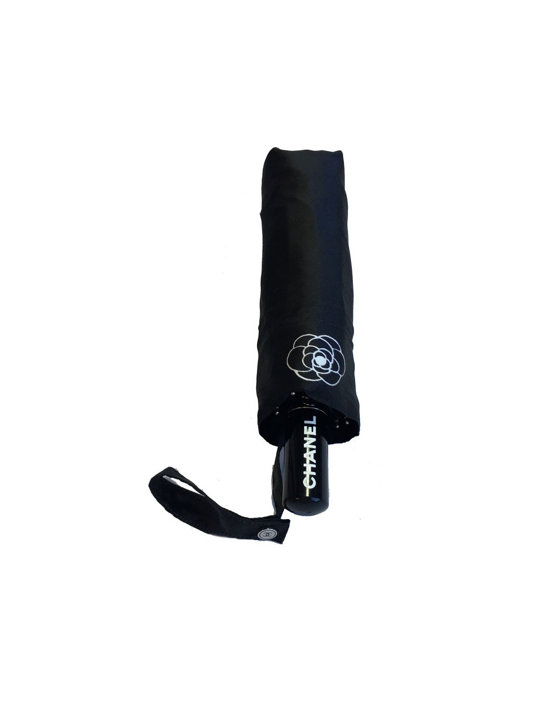 Parapluie CHANEL noir et blanc. Dessin d'un camélia blanc sur fond noir lorsqu'il est ouvert.