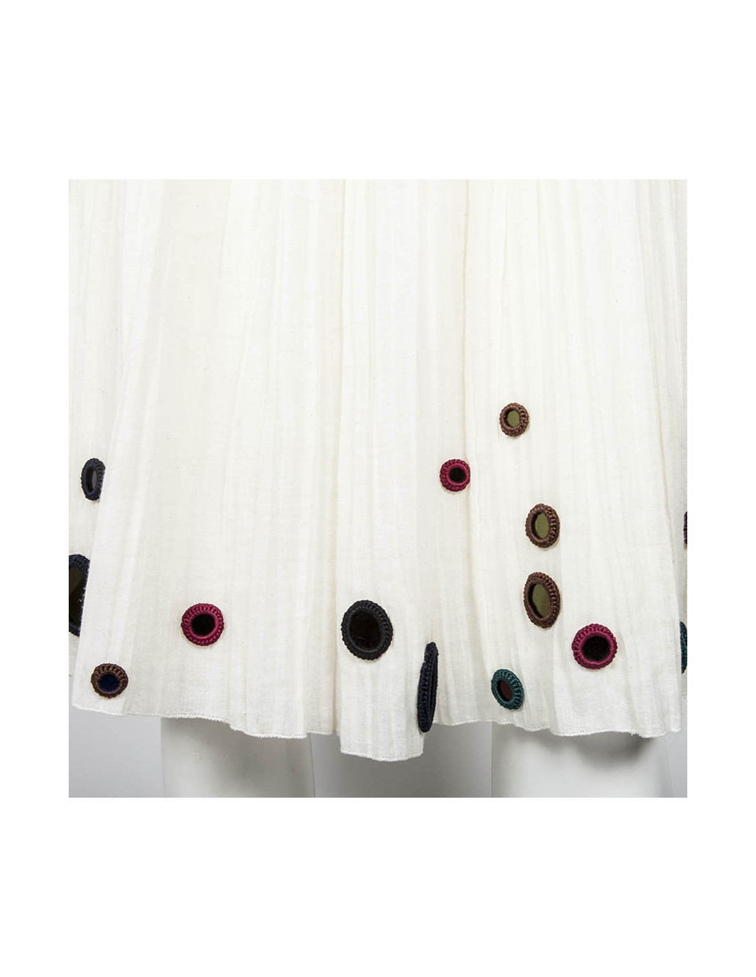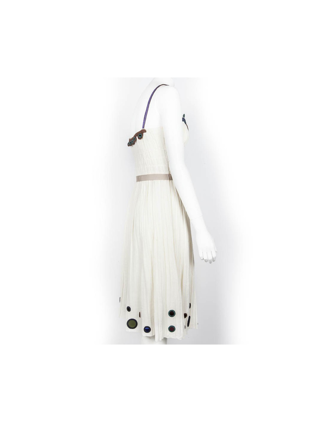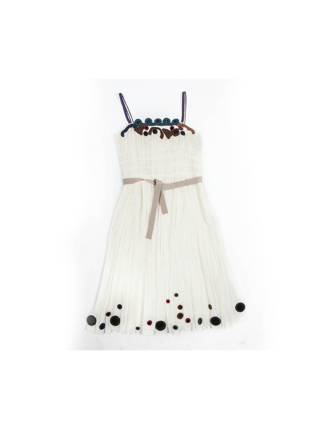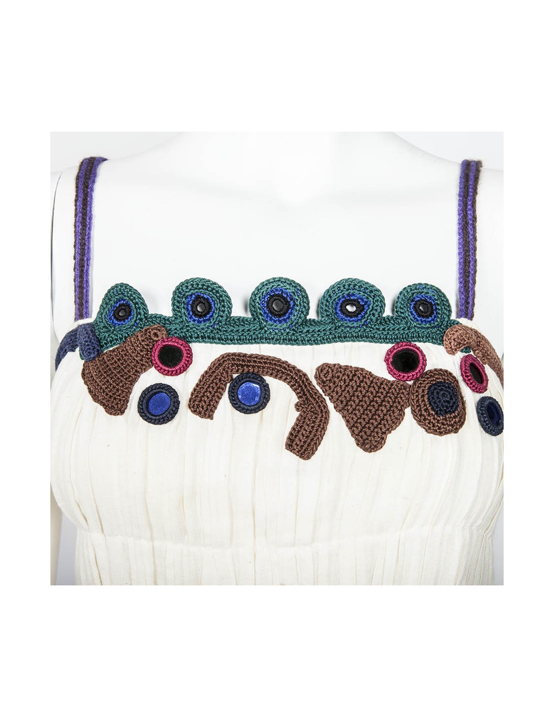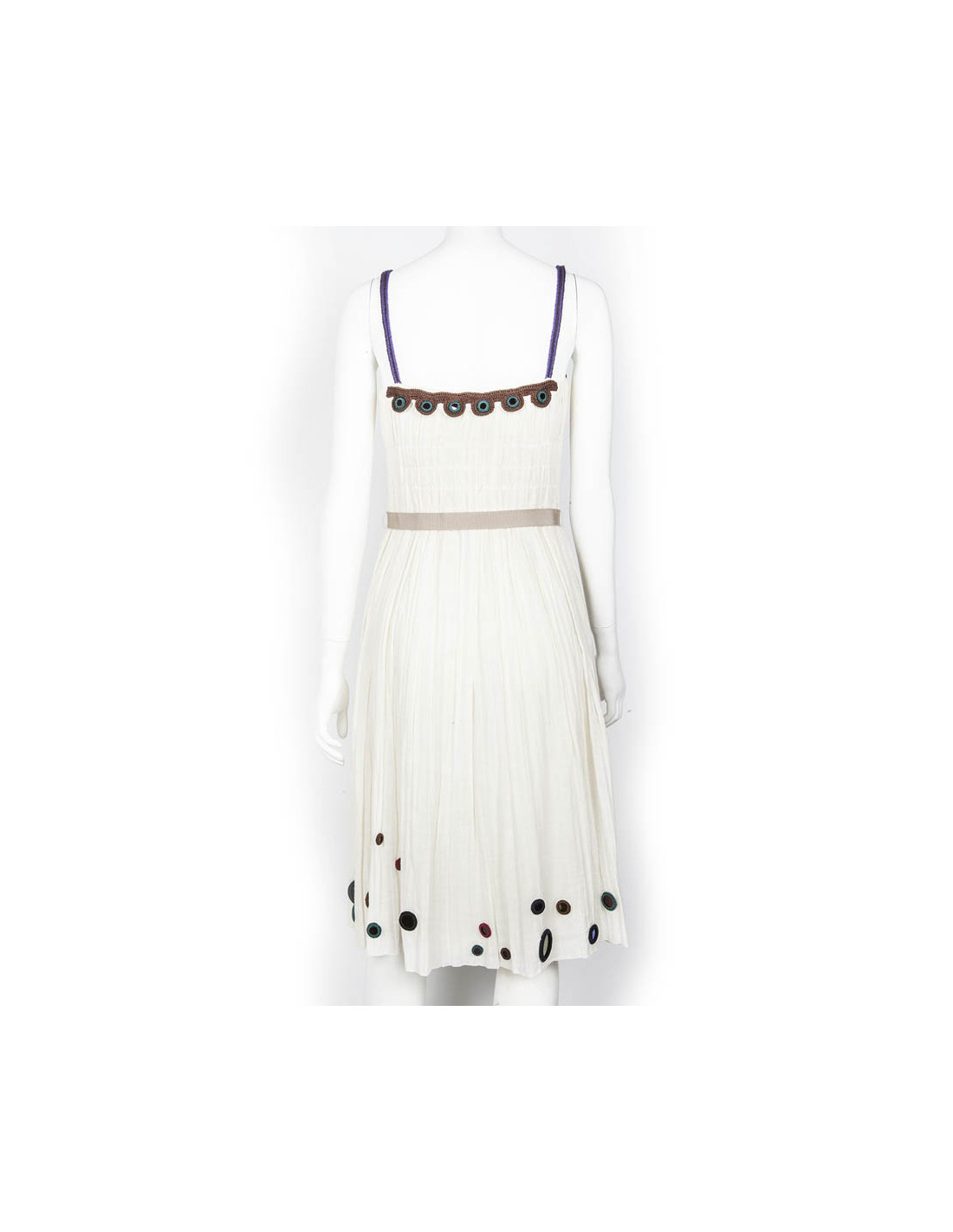 Robe à bretelles Prada en coton blanc pur. taille 42 italien (38 FR). Les bretelles ainsi que le buste et le bas de la robe sont ornés de crochet coloré. La robe est renforcée au niveau du buste, fermée grâce à un zip.