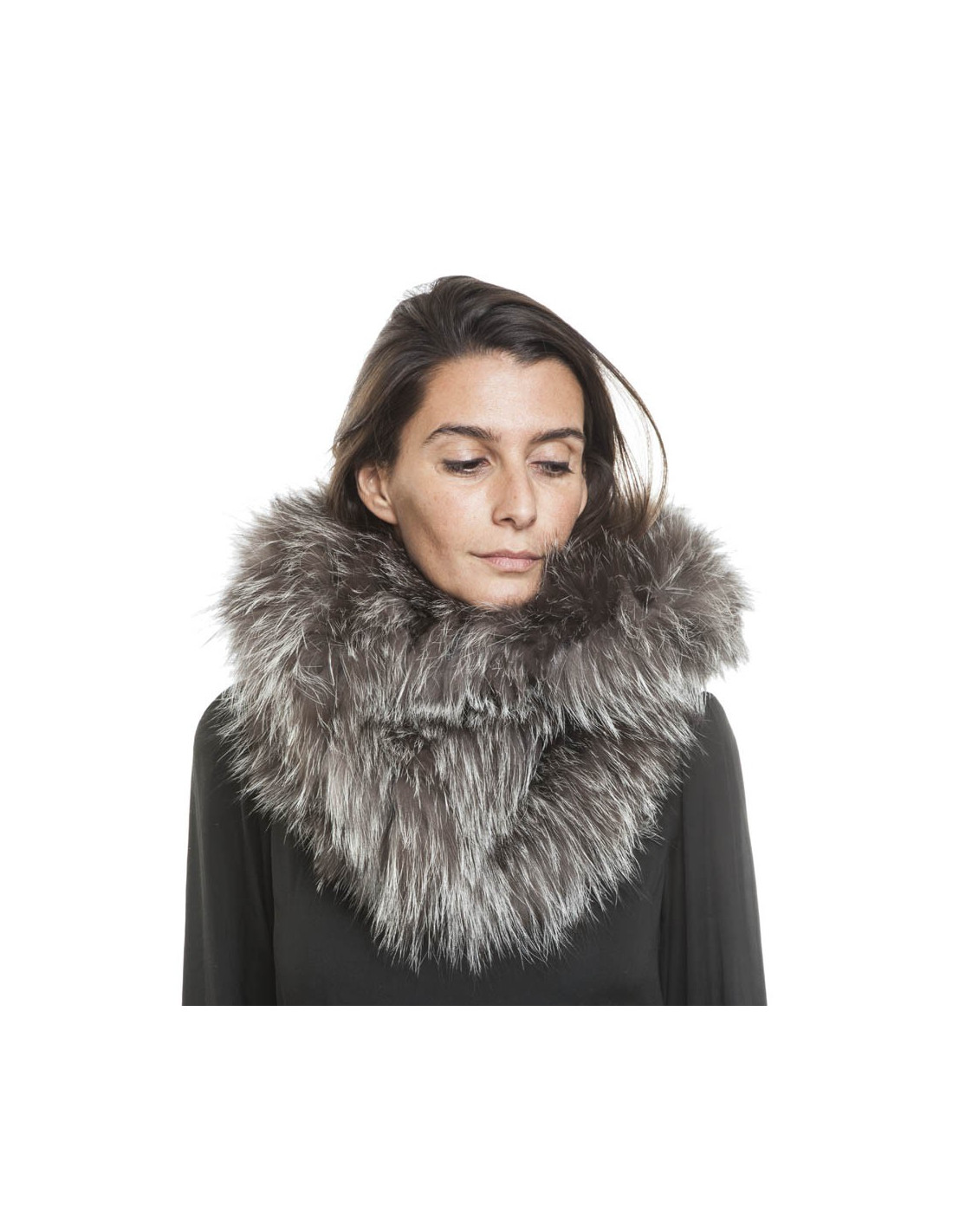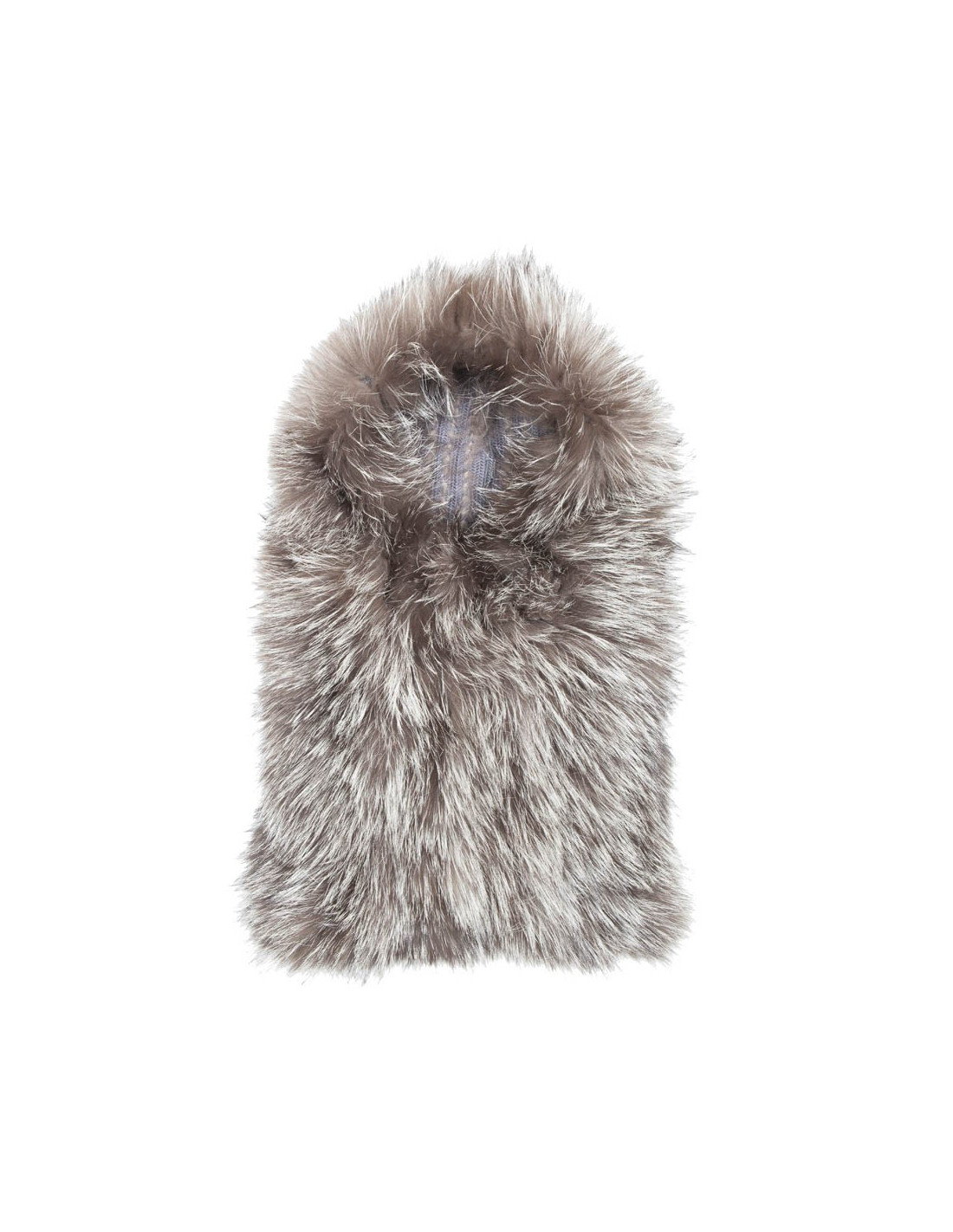 Cagoule de la Maison Révillon en renard argenté. Il se porte de deux façons : en cagoule et recouvre le cou. Taille unique. En très bon état.