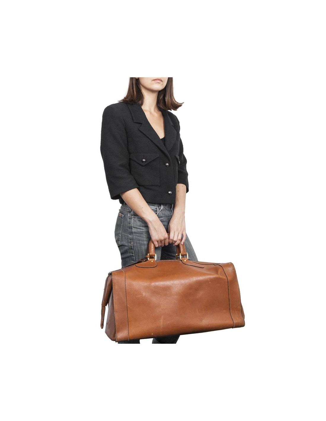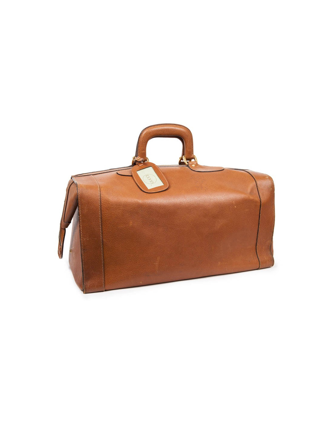 La structure et le cuir sont rigides, permettant au sac de garder sa forme initiale, pratique et élégante. Idéal pour partir en weekend. L'intérieur est en tissu or avec un poche zippée et quelques marques d'usage. La fermeture zippée est verrouillée par un système de serrure. L'amarrage est en laiton doré. Il y a sur la poignée un porte-nom, pas de clé.