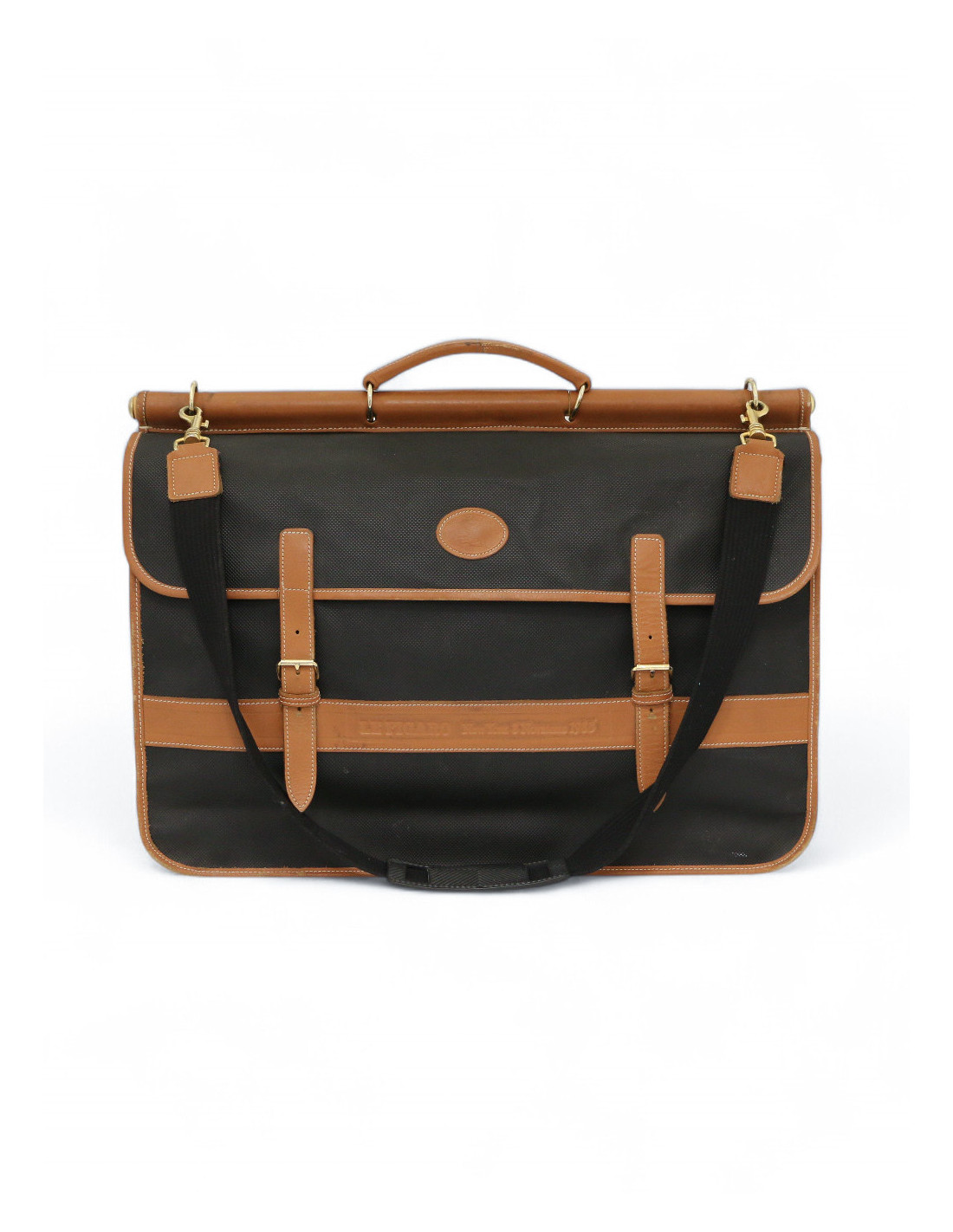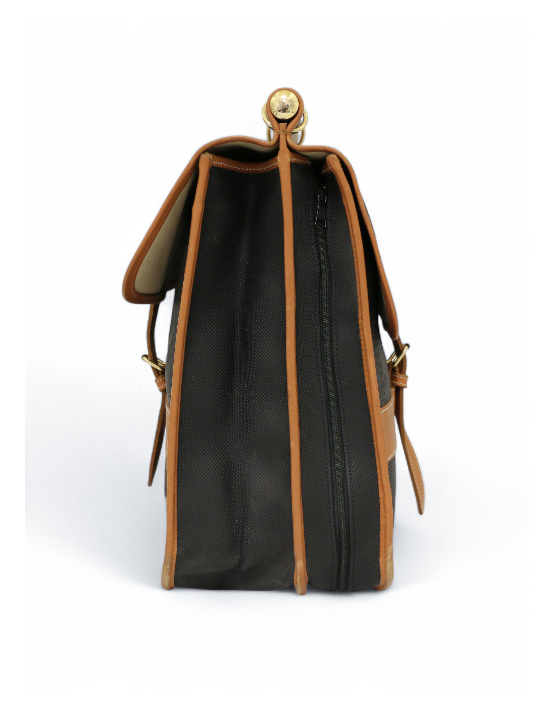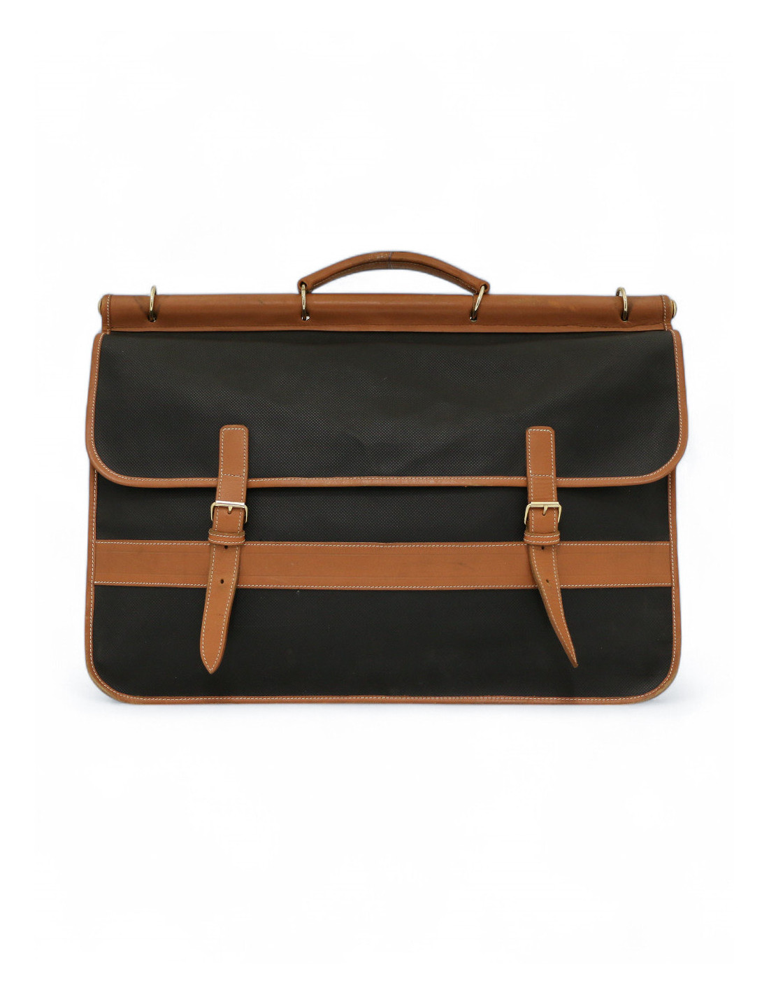 Détails : sac business de voyage, deux espaces de rangement distincts à rabat fermé avec double boucle ardillon et une grande poche zippée extérieure.