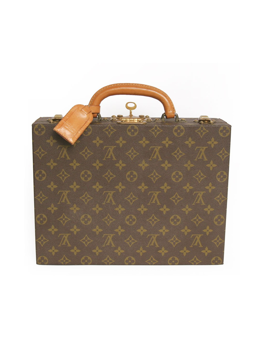 L'intérieur est en cuir et velours marron. Les pièces métalliques sont en laiton doré. Serrure S avec clé, renforcée de deux loquets complémentaires. Confortable poignée en cuir. Porte-adresse amovible en cuir.
