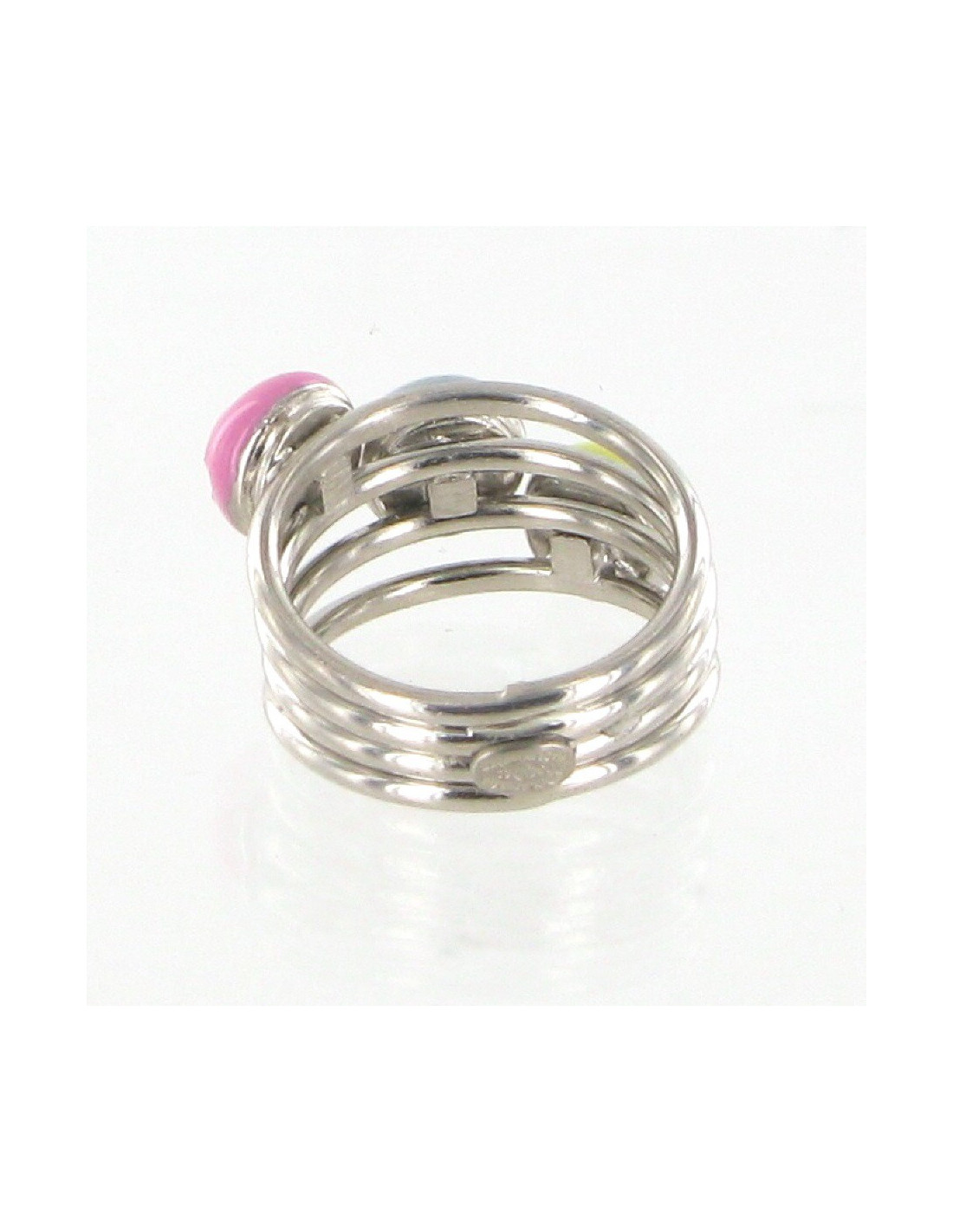 Ravissante bague CHANEL en métal argent palladié ornée de trois cabochons en émail rose, bleu et jaune siglés CC.
