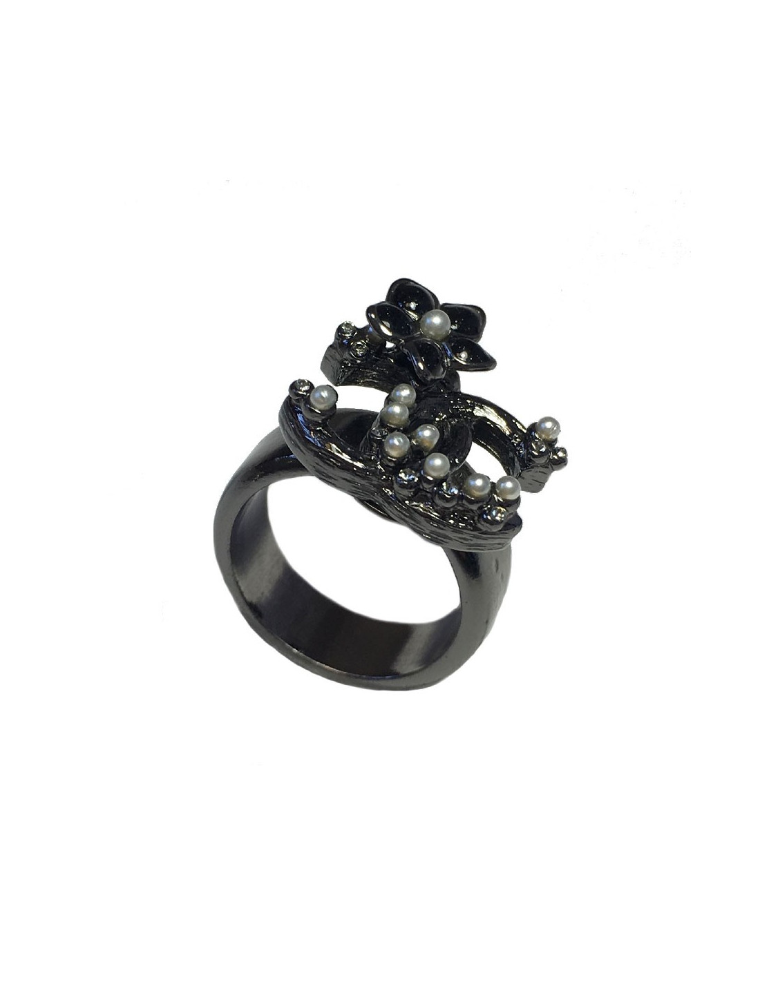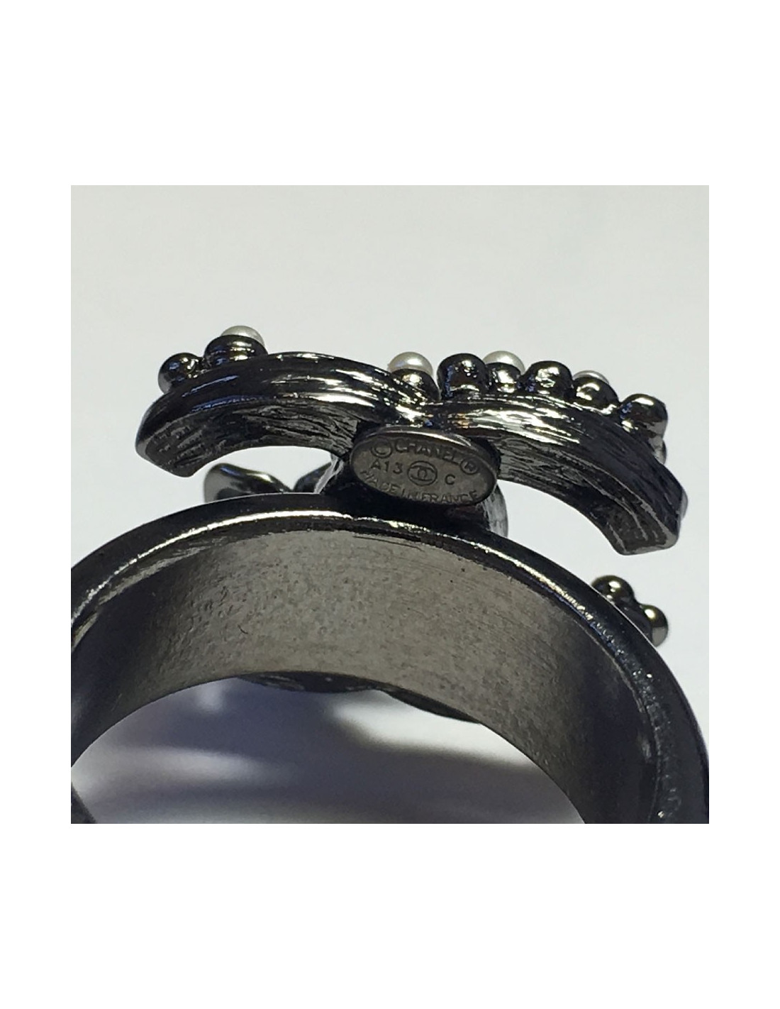Bague Chanel CC en métal ruthénium sertie de petites perles nacrées, brillants et émail noir.