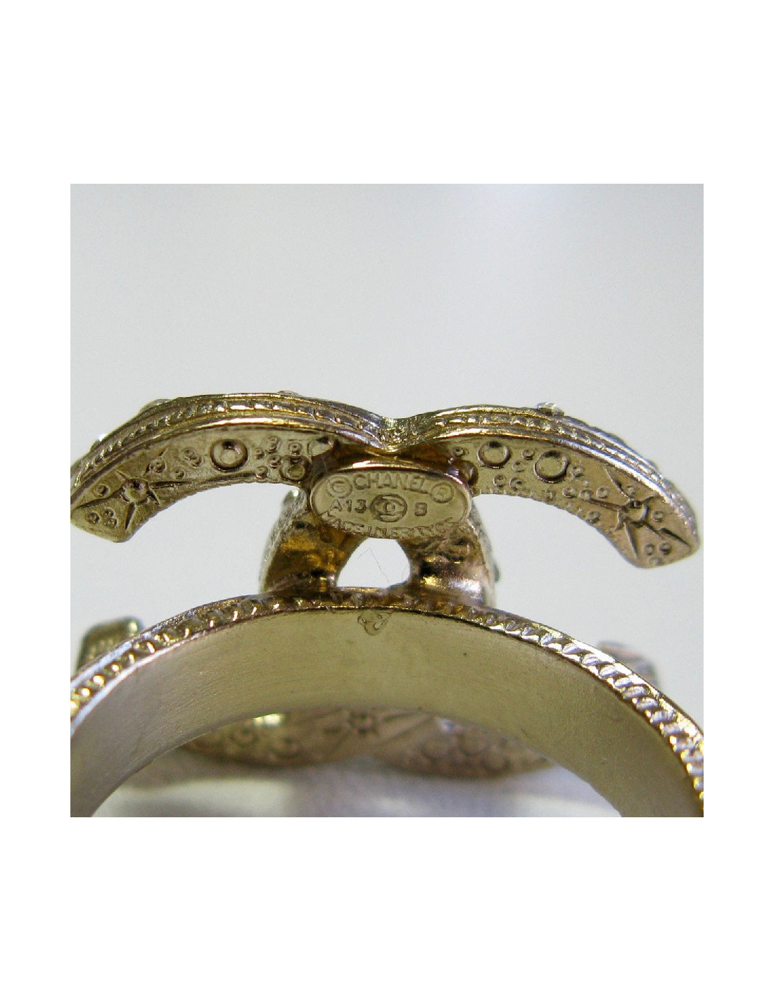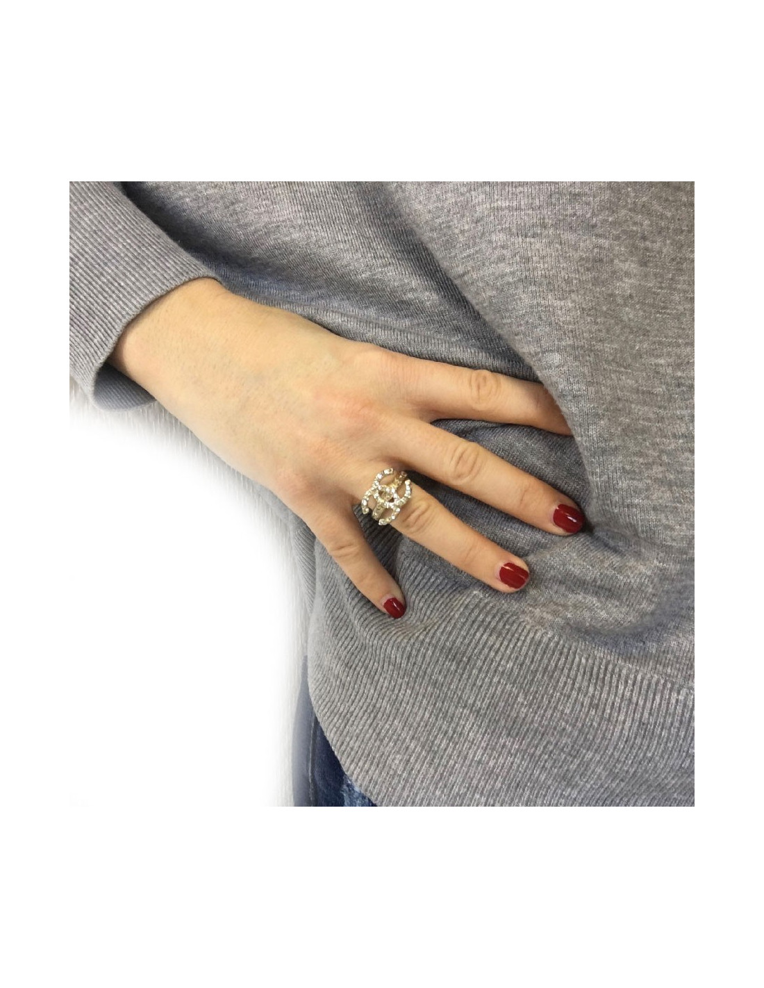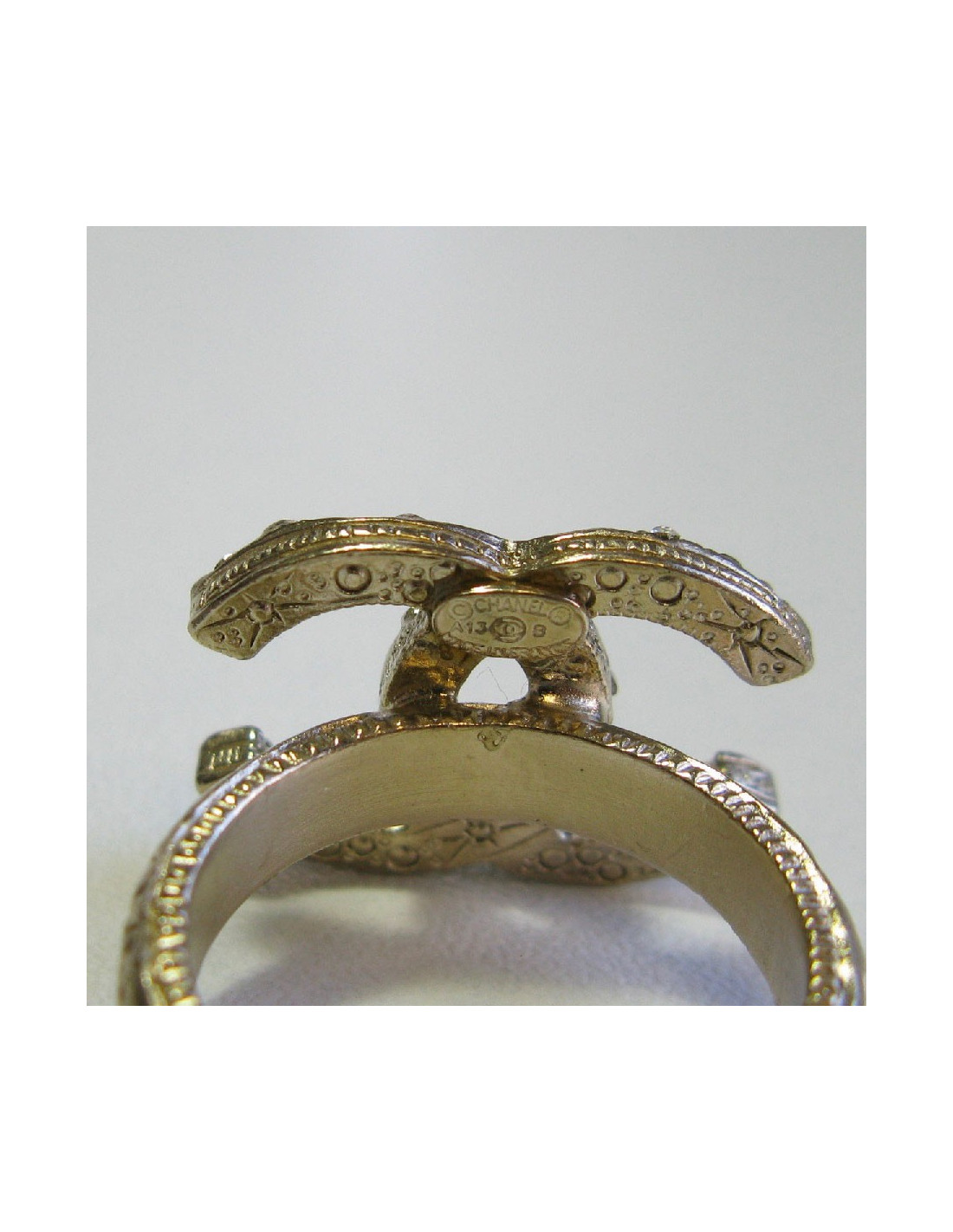 Bague Chanel CC en métal doré or pâle, sertie de petits strass blancs.