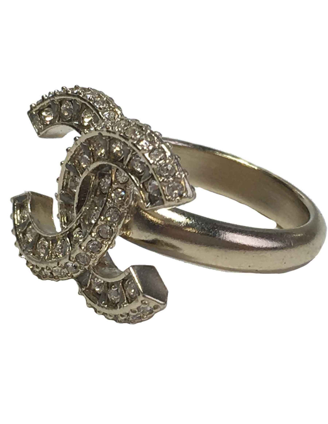 Très belle bague Chanel, esprit joaillerie, CC tout en strass et métal doré à l'or fin.