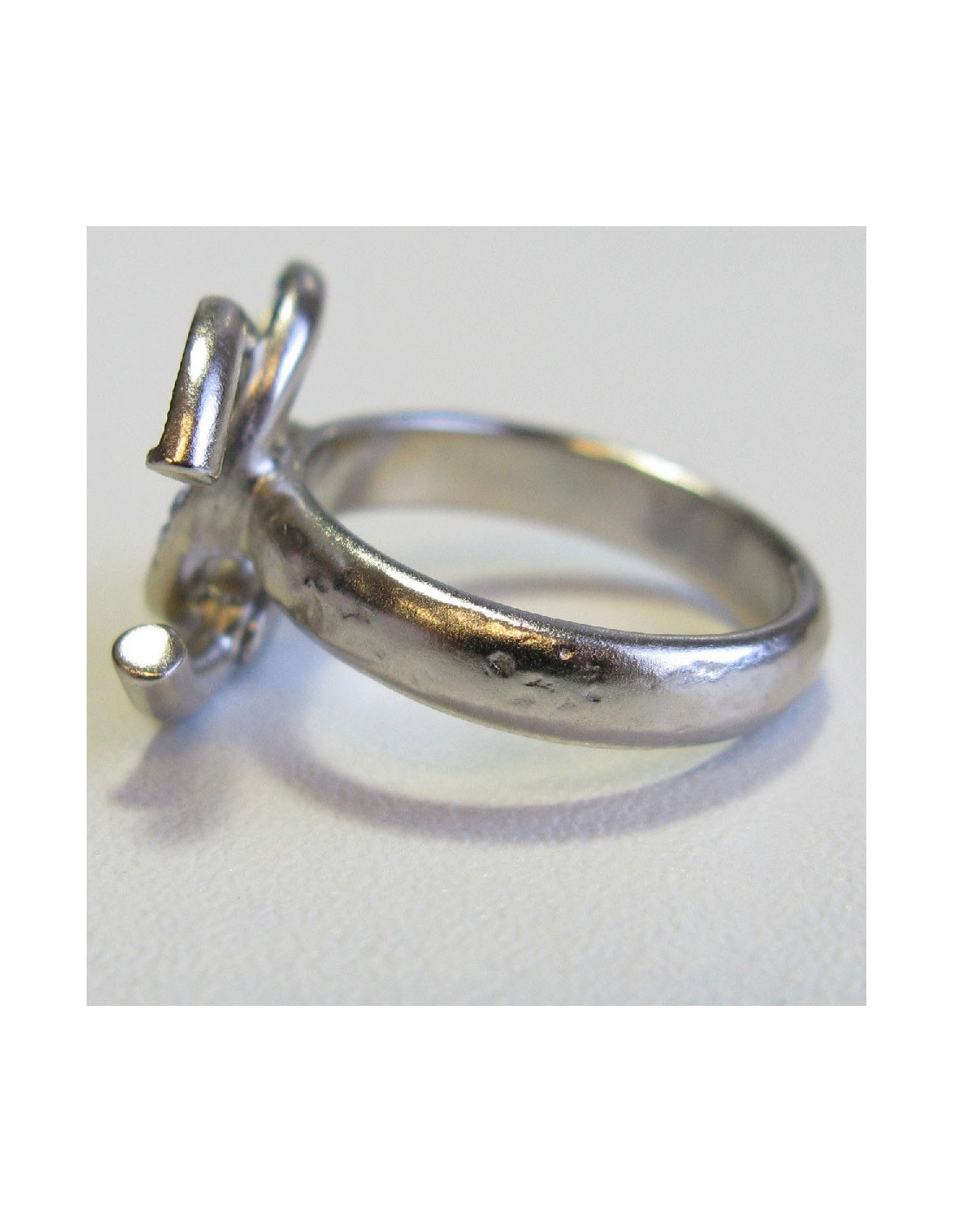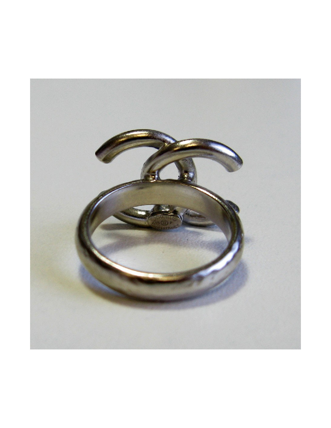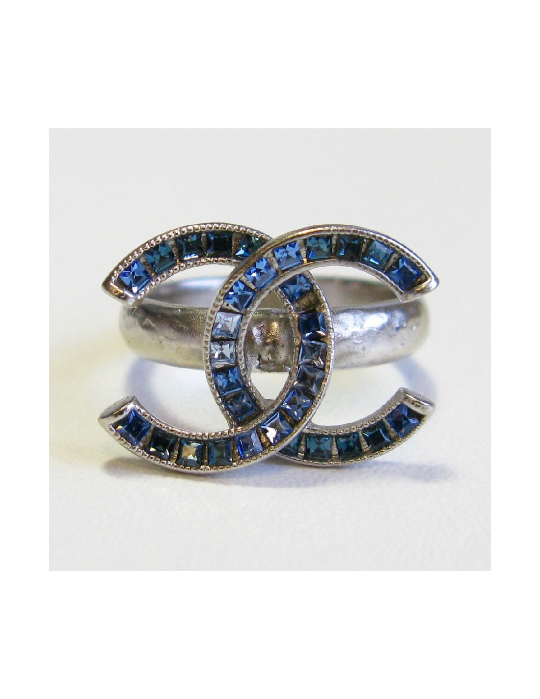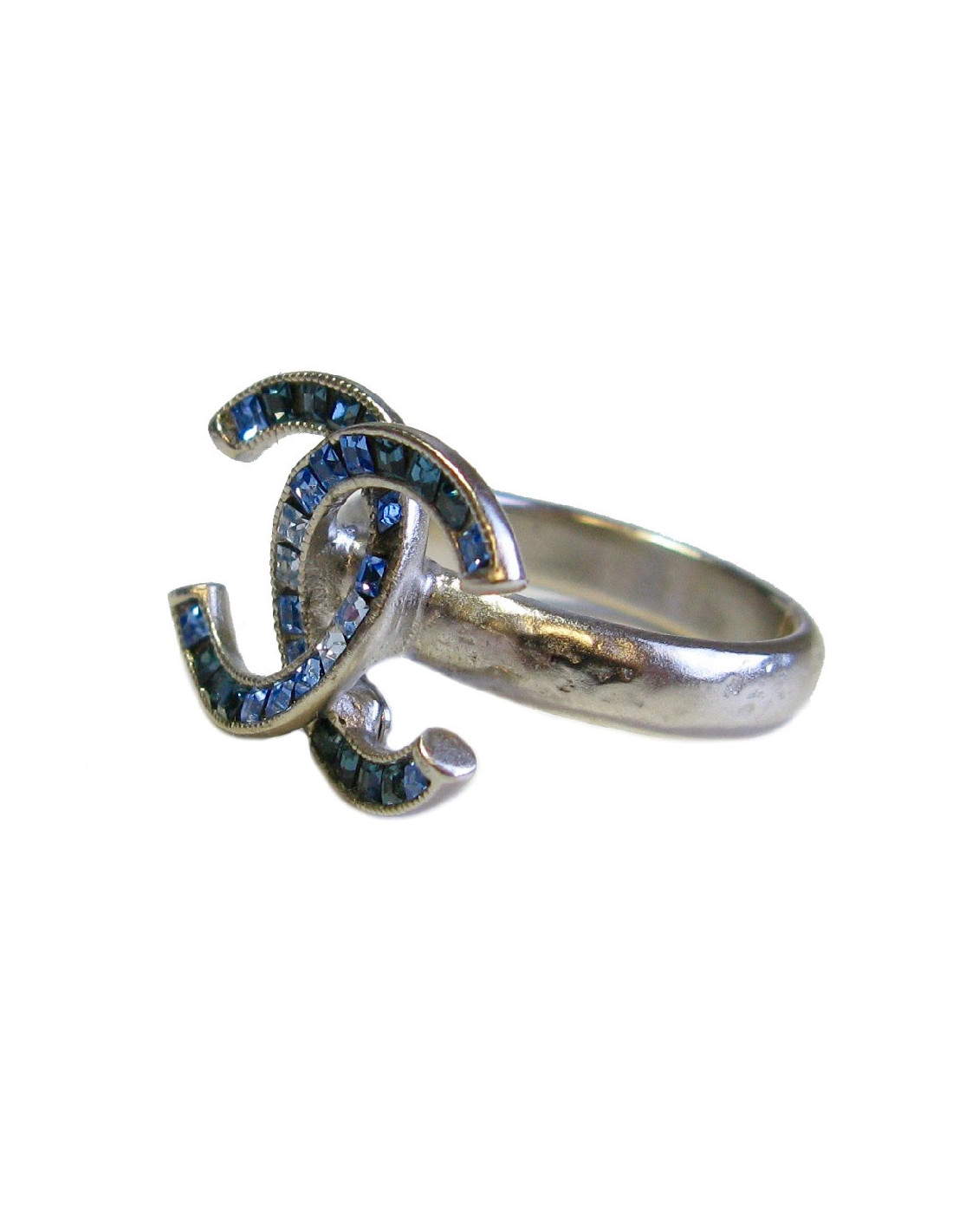 Bague Chanel CC en métal argenté sertie de strass carré bleu. Il y a un effet martelé sur l'anneau.