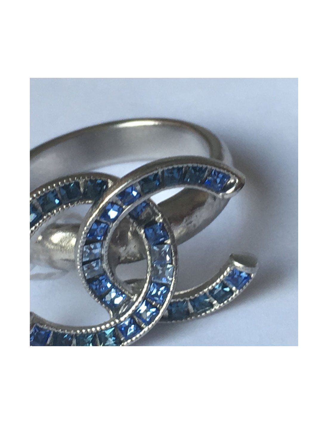 Bague CHANEL CC T53 en métal argenté et strass carré bleu