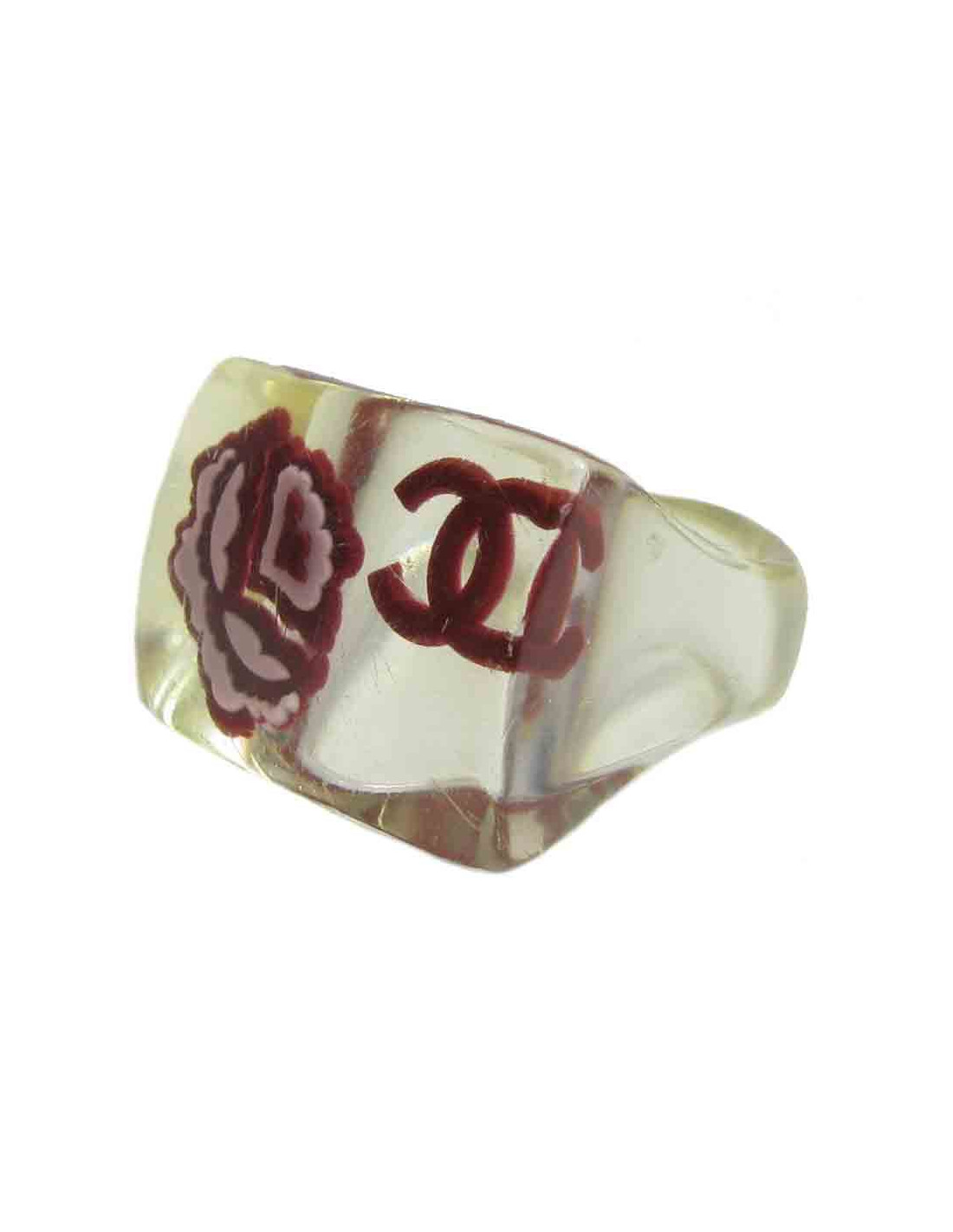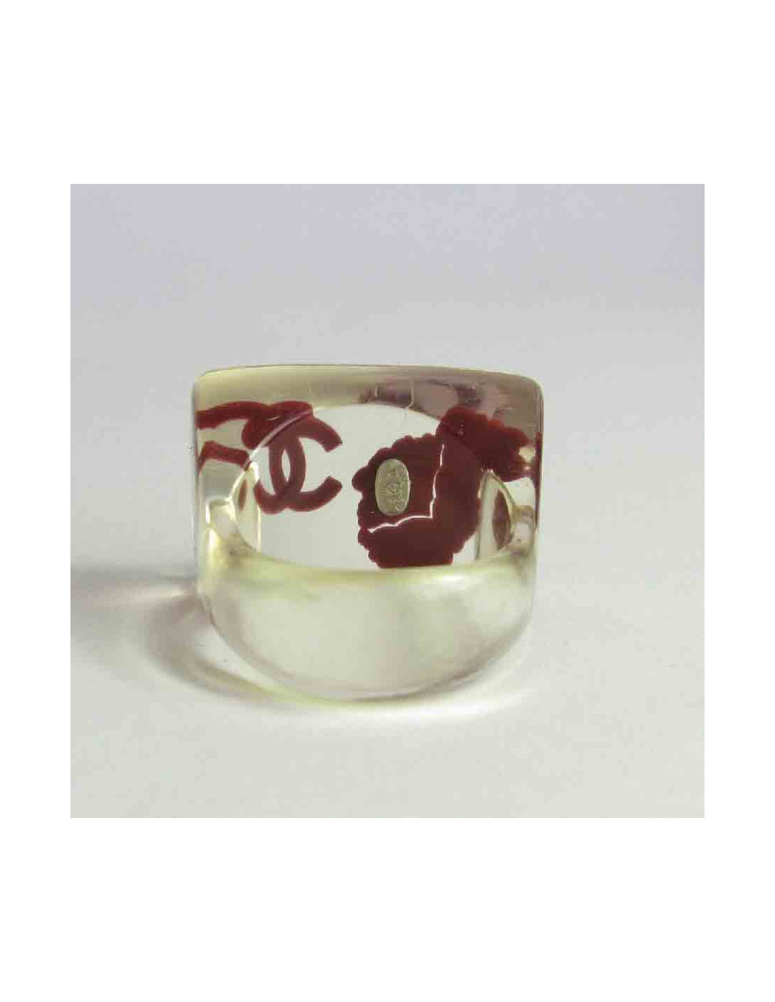 Bague Chanel en plexi transparent, camélia et CC en inclusion sur le dessus.