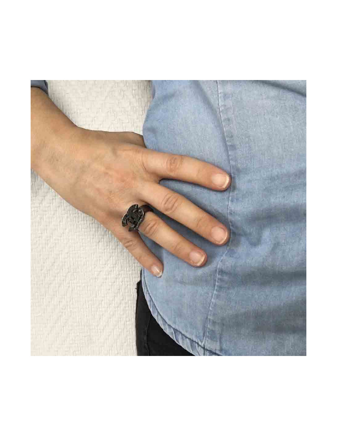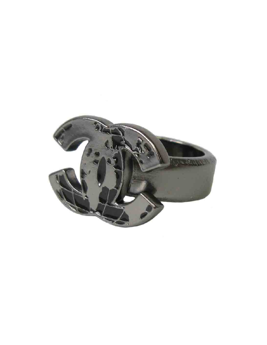 Bague Chanel T52 en métal noir (ruthénium), le CC est recouvert d’une mappemonde