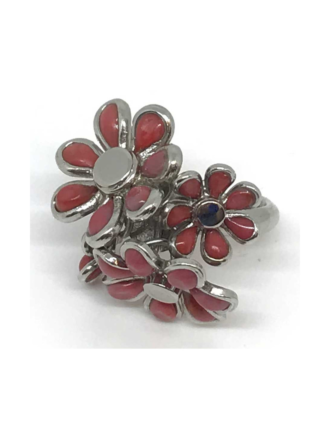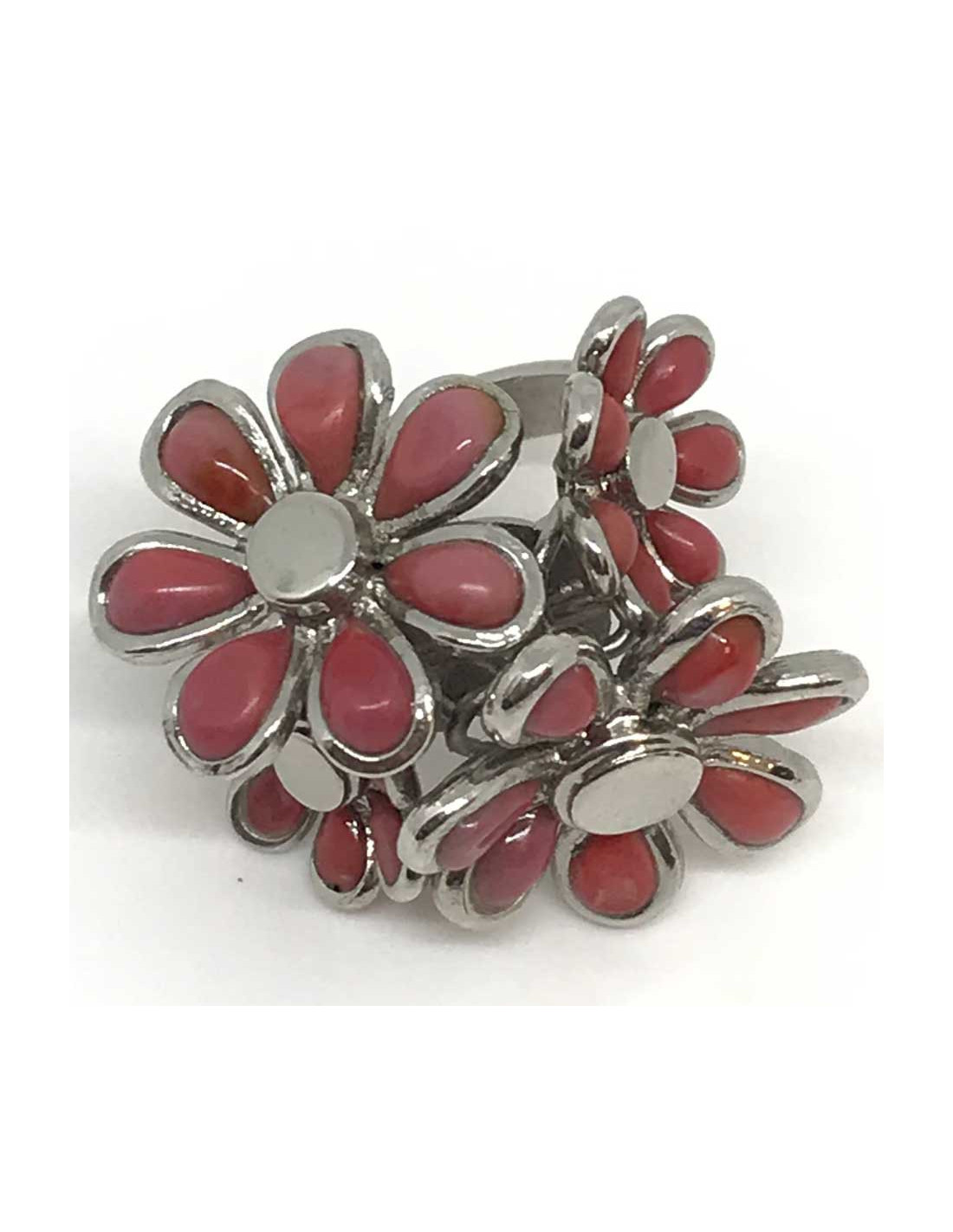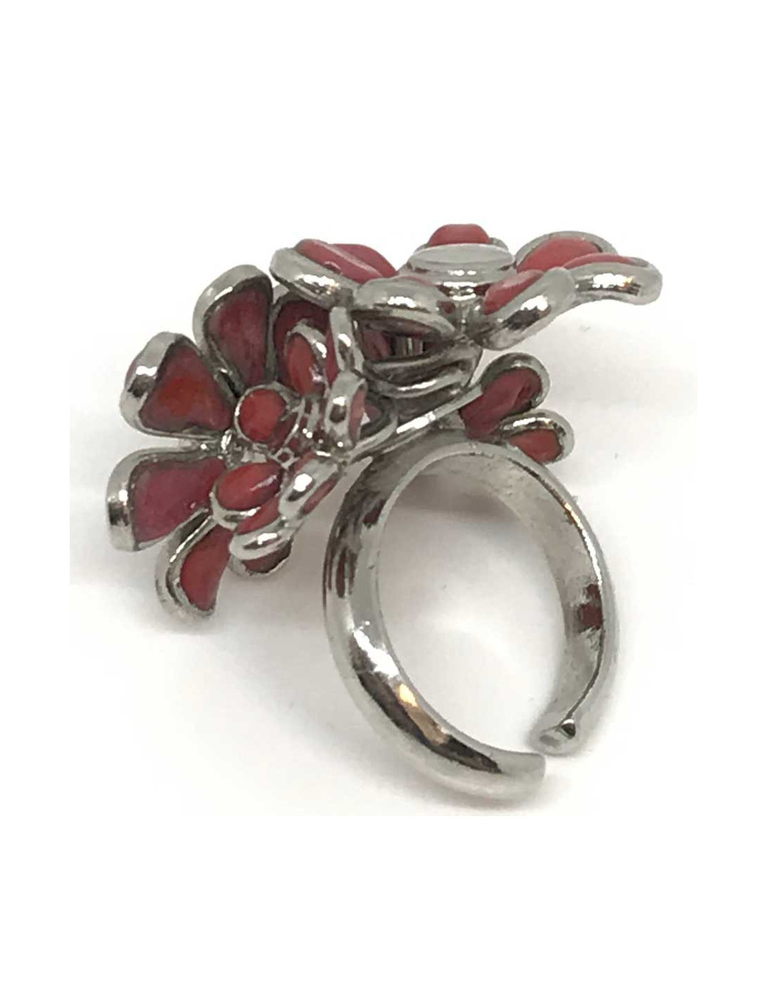Cette bague est un bouquet de quatre fleurs en pâte de verre aux pétales couleur corail.