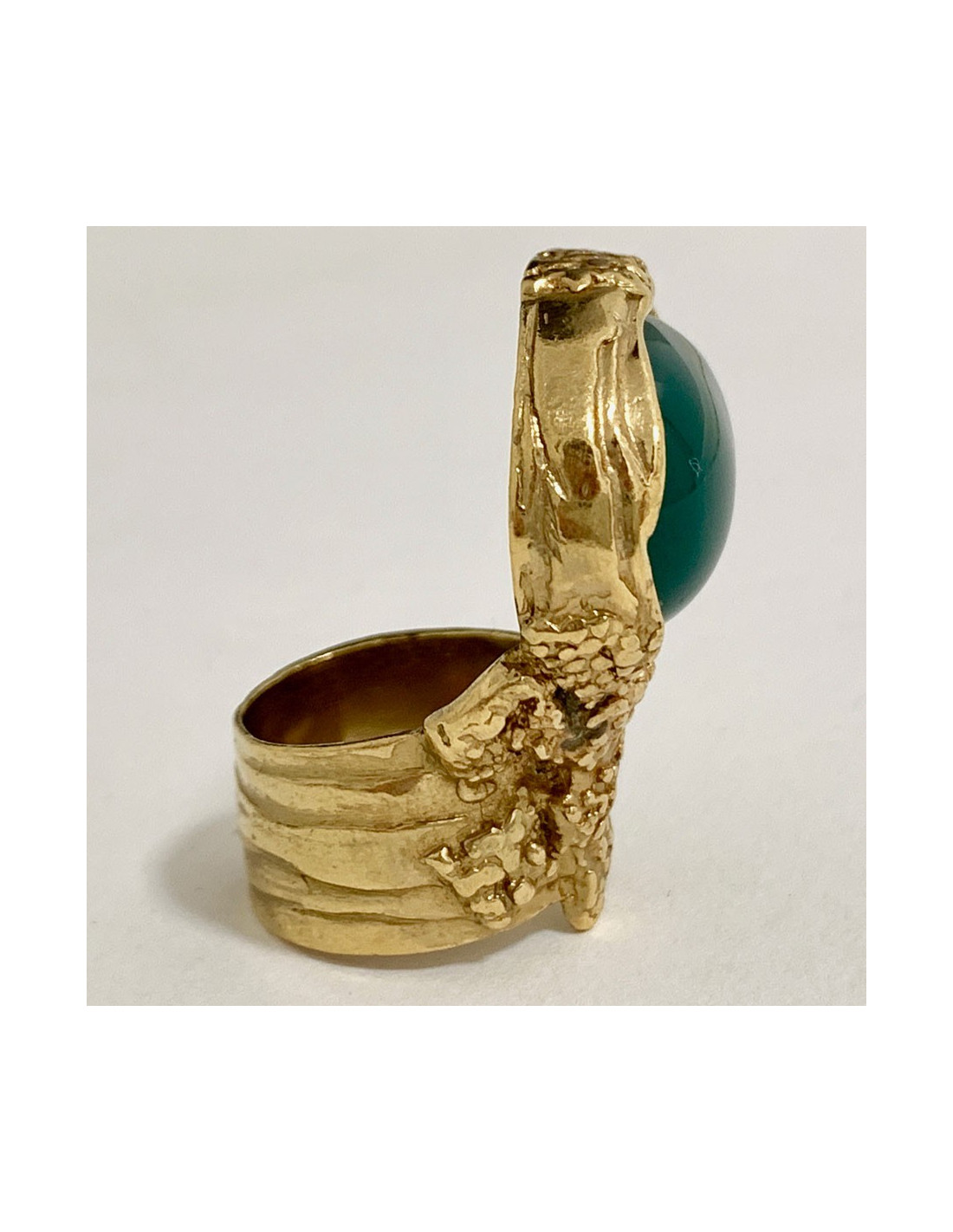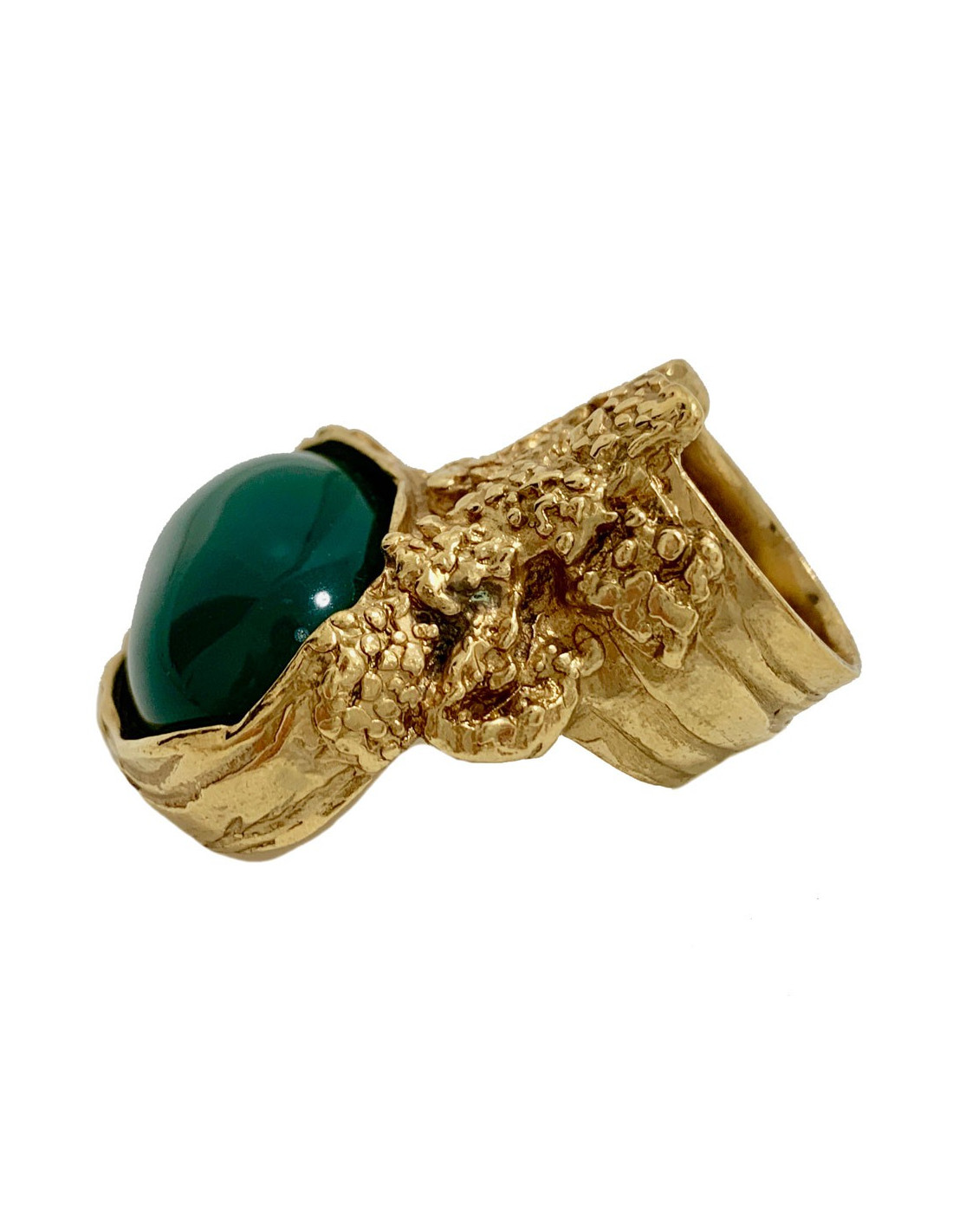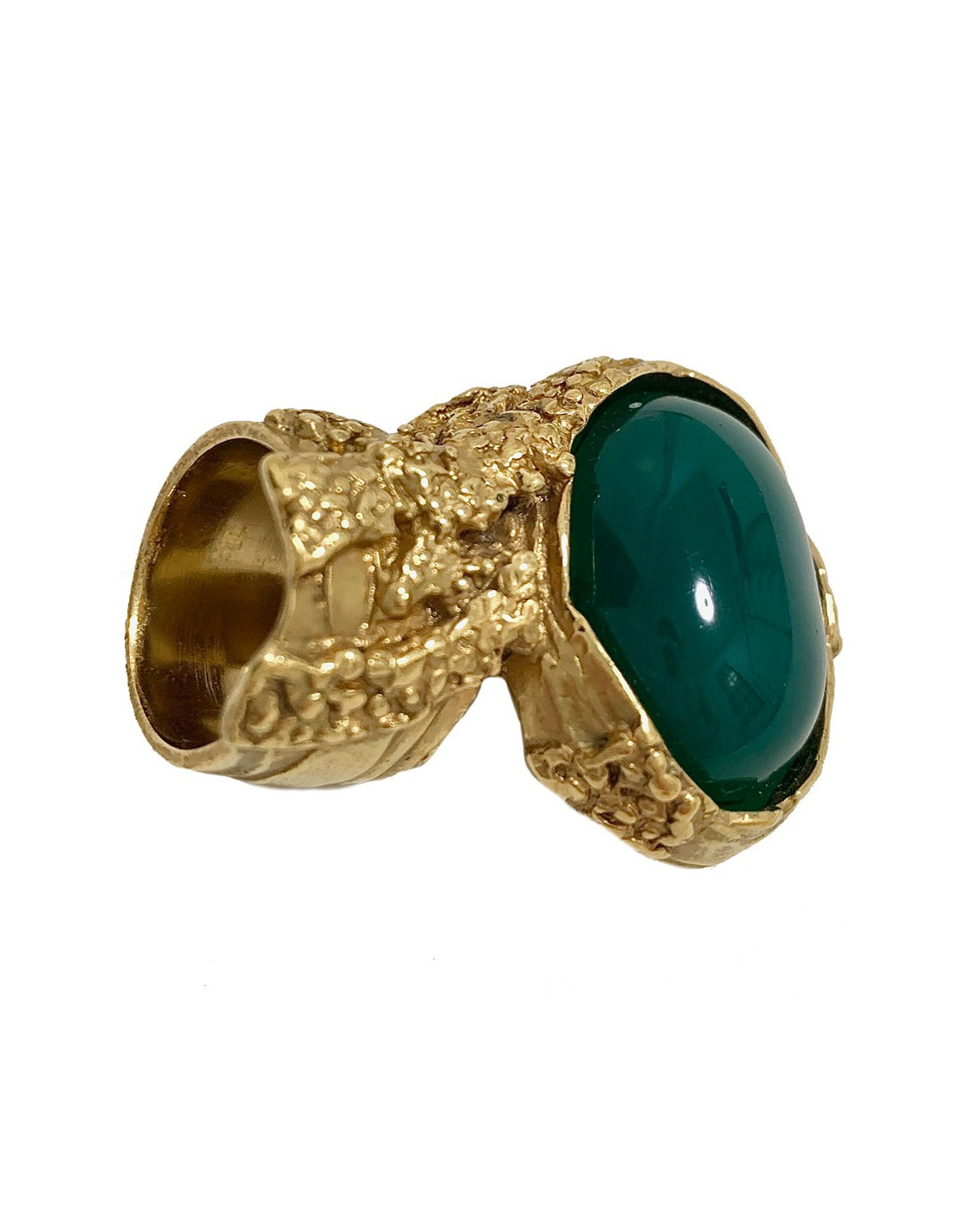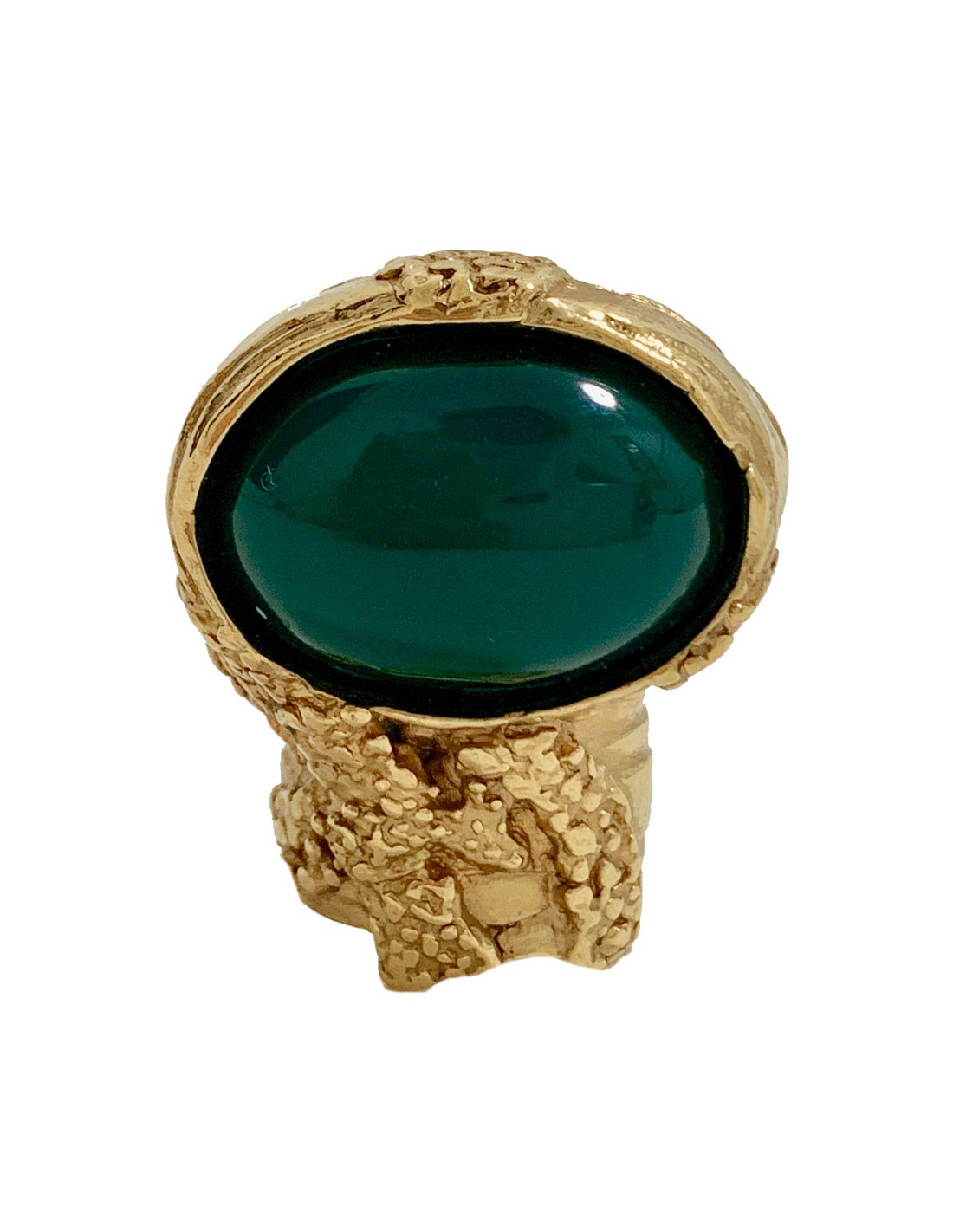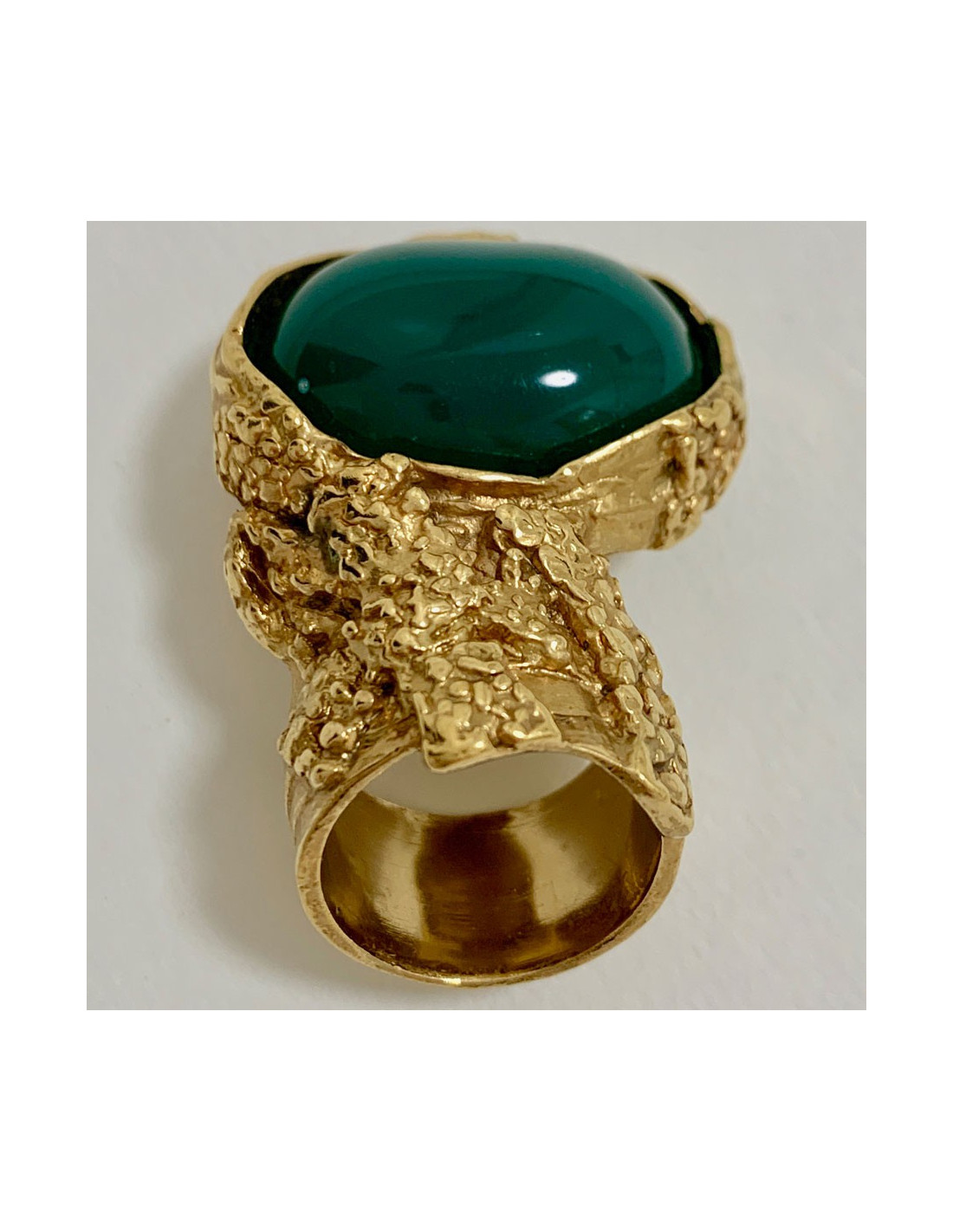 Couture! Bague modèle Arty de la Maison YVES SAINT LAURENT par Stefano Pilati. Imposante bague en métal plaqué or et résine verte. Son design est de toute beauté. La pierre en résine est excentrée de l'anneau.