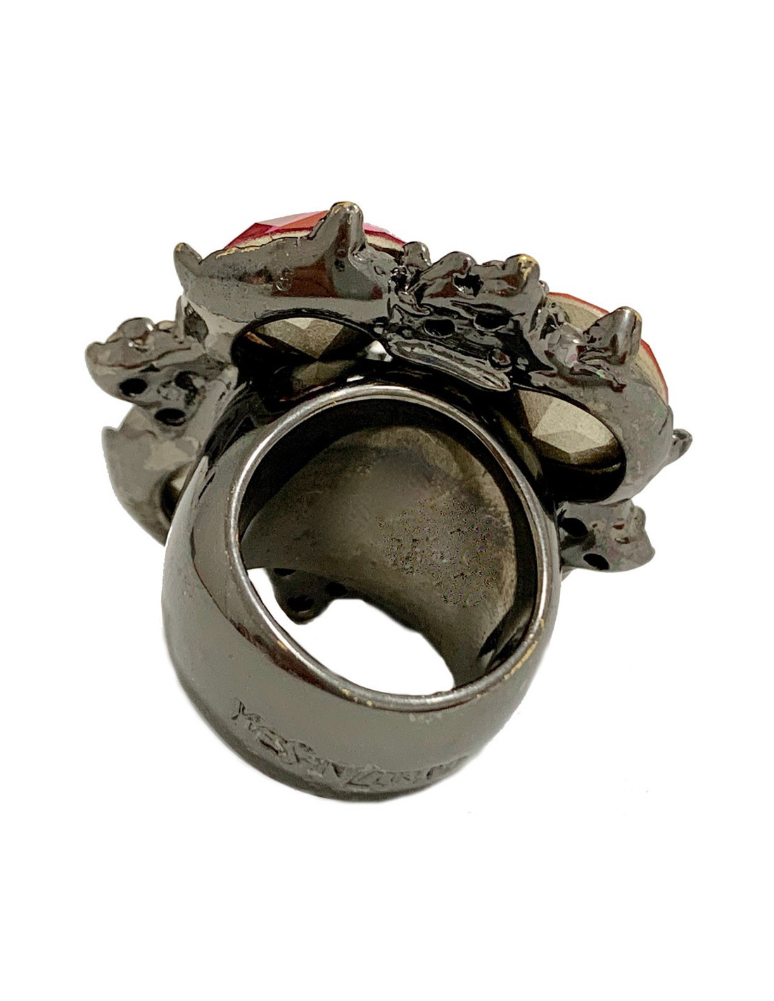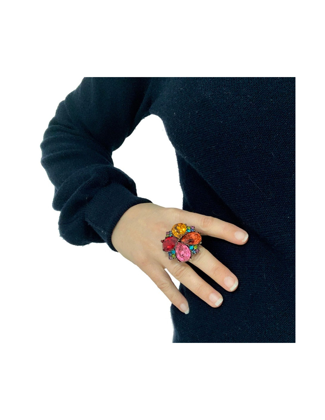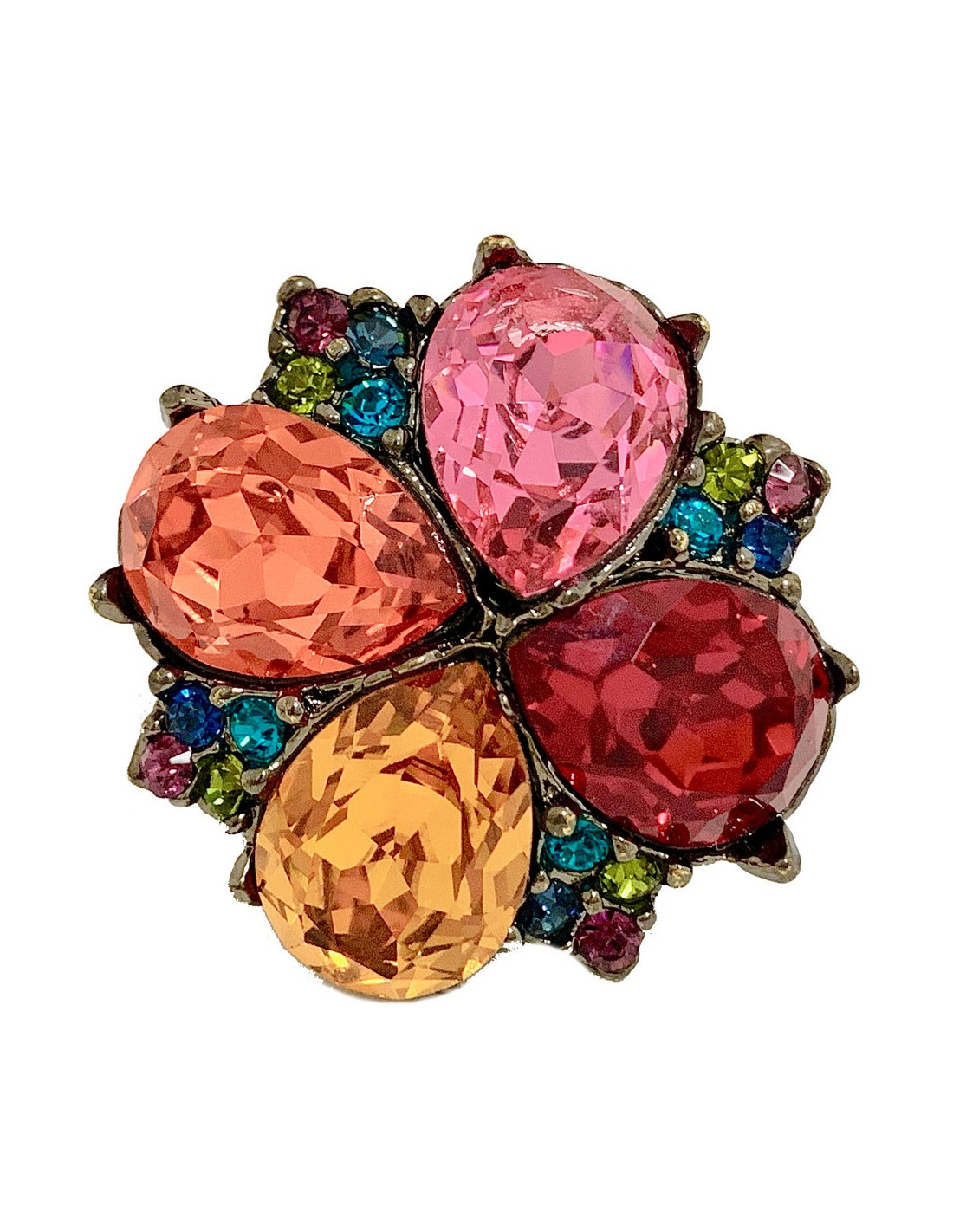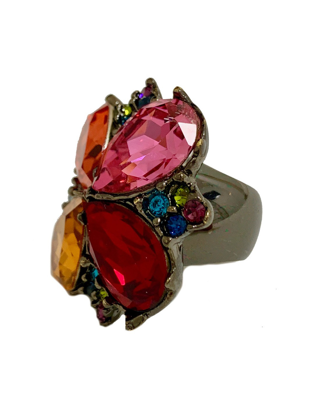 Colorée et superbe bague YVES SAINT LAURENT en métal ruthénium (couleur argent vieilli) serti de strass forme goutte de différentes couleurs (rose, orange, rouge et ambre, ainsi que de petits strass verts, bleus et mauve.