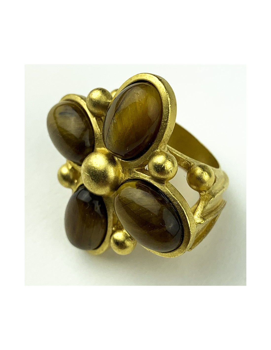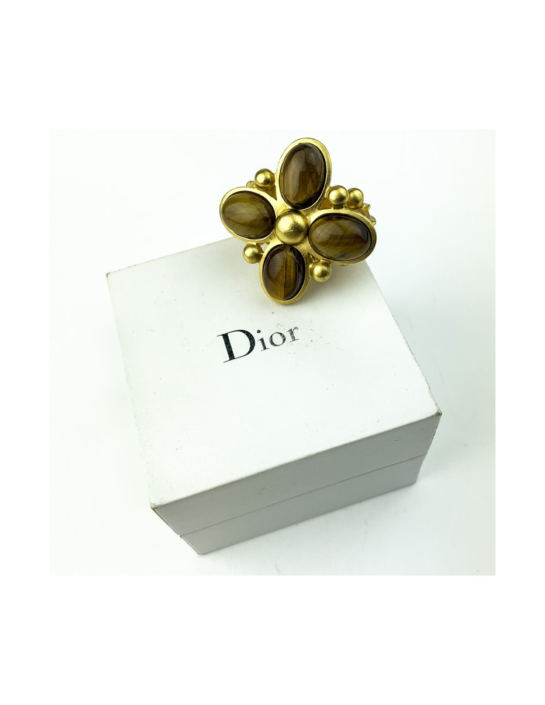 La bague provient de la Maison DIOR. Elle représente une mozaique en métal doré mat, sertie de quatre pierres oeil de tigre.