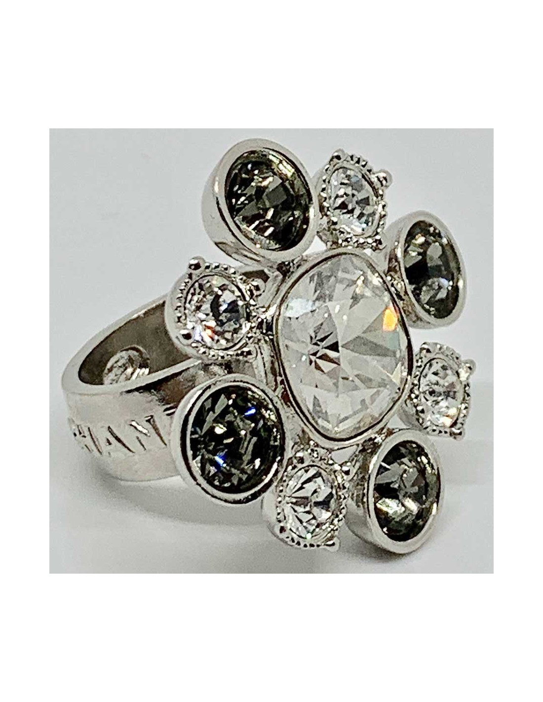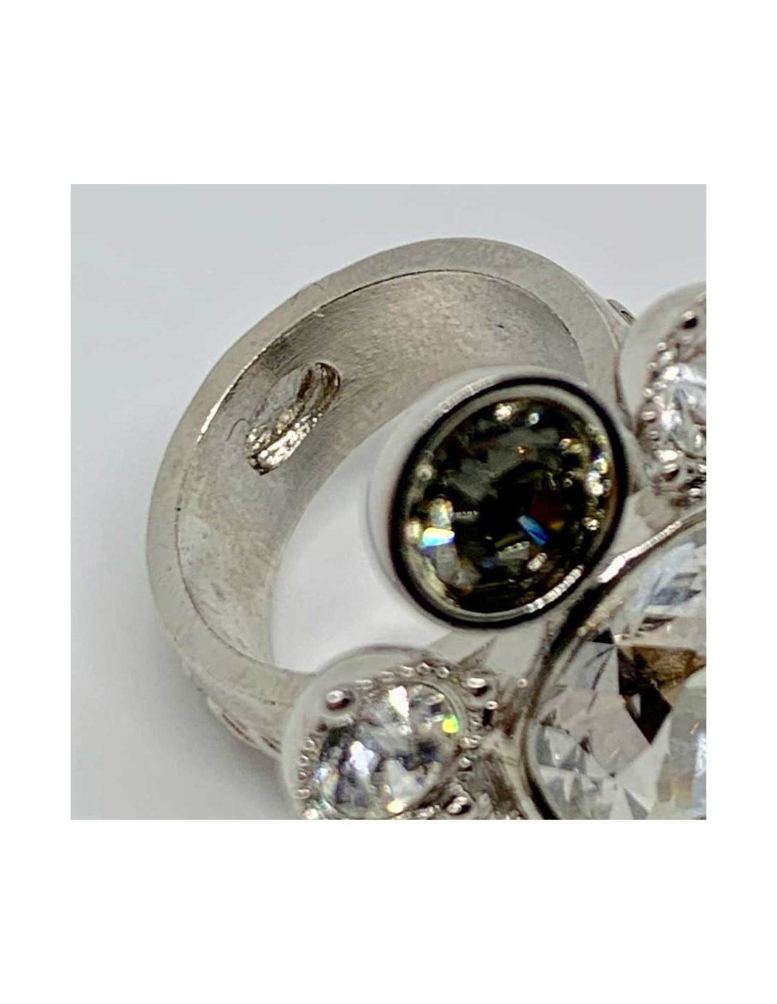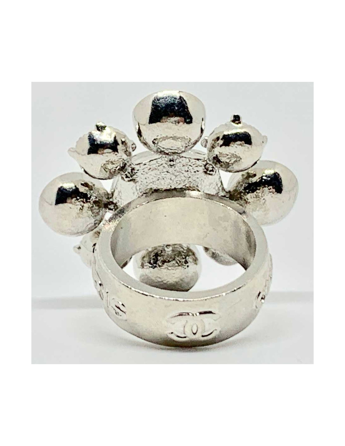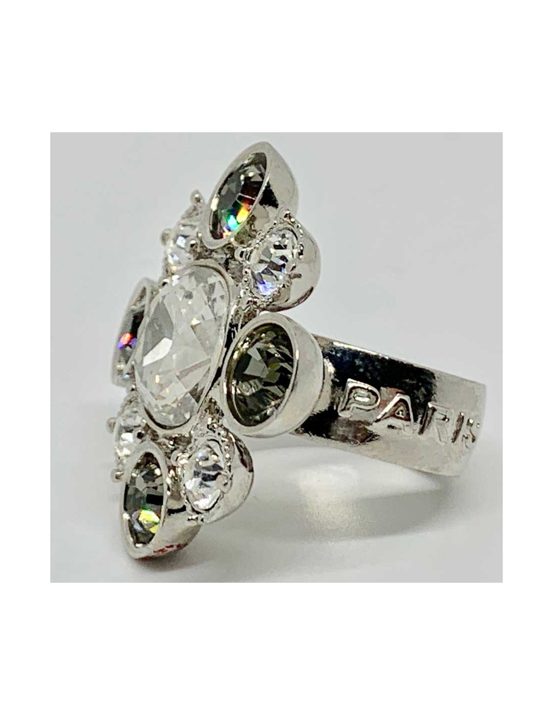 Sublime bague, de forme carré, de la Maison CHANEL sertie de brillants Swarovski blancs et gris. L'anneau est assez large. Il porte l'inscription CHANEL PARIS ainsi qu'un CC.