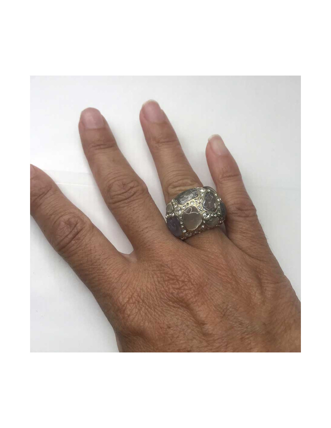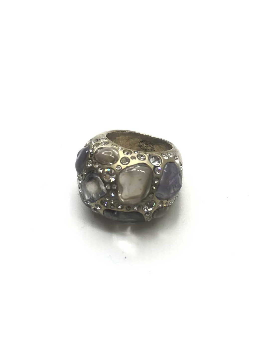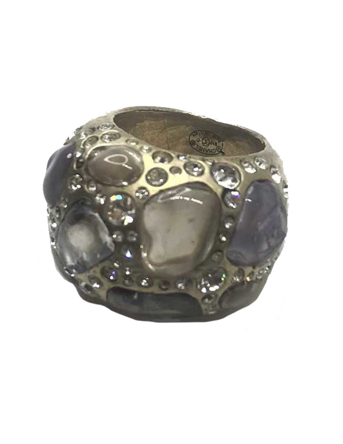 La bague vient de la Maison Chanel, collection 2012. Elle est sertie sur trois centimètres de surface, de strass et de pâte de verre couleur violette et transparente.