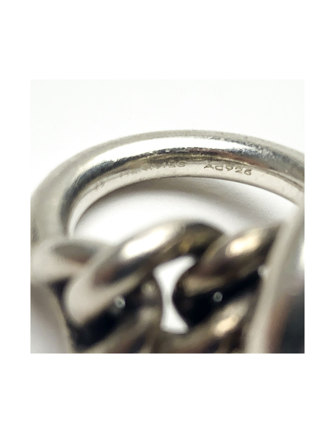 La baque est le modèle "Croisette" de la Maison Hermès. Aux origines, une fermeture 'chaîne d'ancre' imaginée par Robert Dumas, membre de la famille HERMES. Toute une collection de bracelets, colliers et bagues découleront de cette chaîne d'ancre. Ici la bague croisette qui représente un anneau façon cordage en argent 925.
