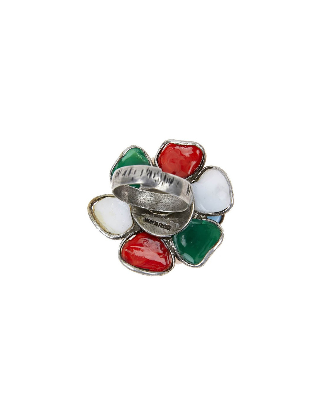 Bague en métal et pâte de verre de couleur blanche, corail, bleue et verte de la Maison Marguerite de Valois.