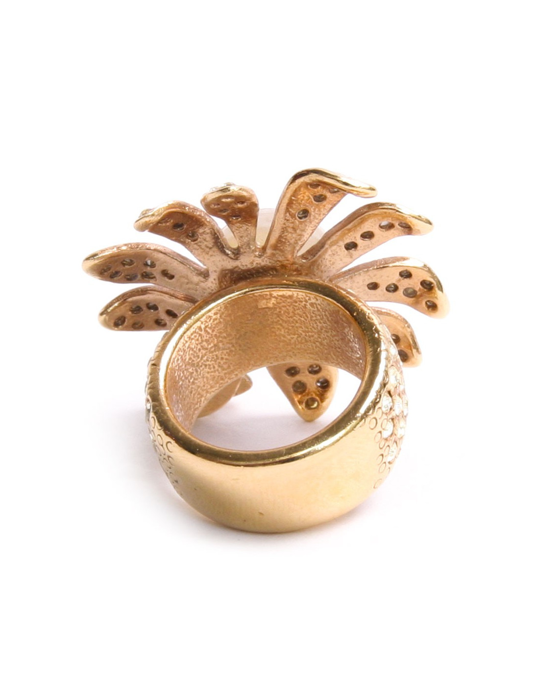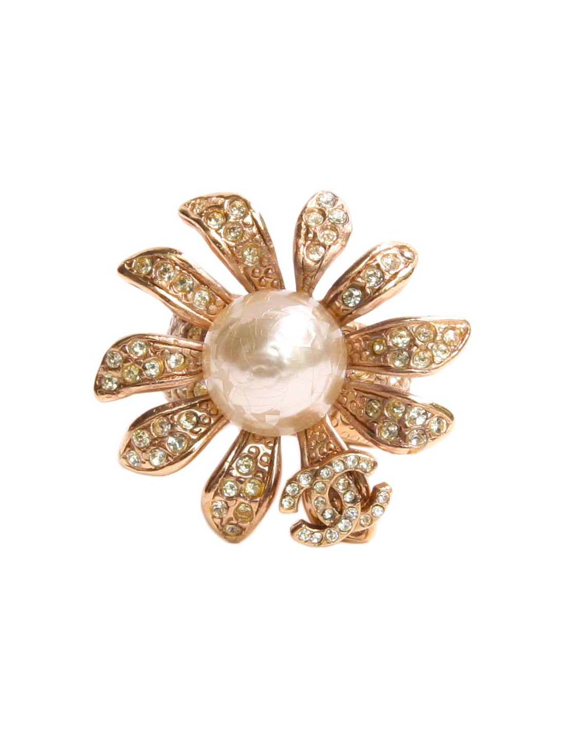 Bague couture Chanel taille 54, collection 05/A (automne 2005), représentant une marguerite dorée et sertie de strass avec un double sur une pétale. Au centre, une demi perle en pâte de verre nacrée. La bague est également sertie de strass. Elle est en très bon état