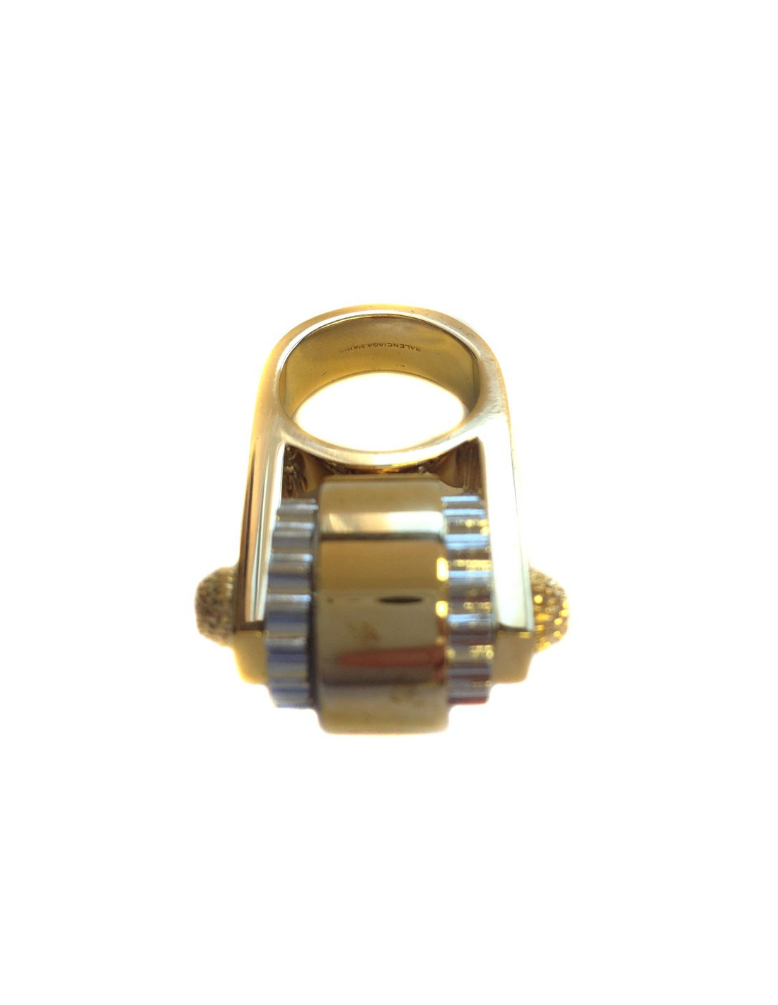 Superbe bague de la maison BALENCIAGA inspirée de la ligne de sacs Arena "giant". Elle a un cylindre central articulé avec des écrous (argentés) et clous sur les côtés. En métal doré.