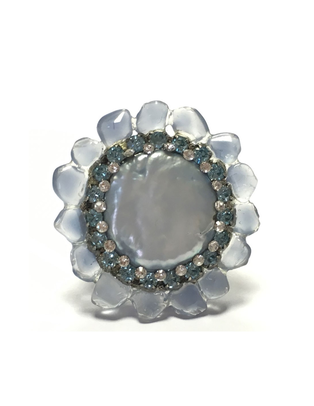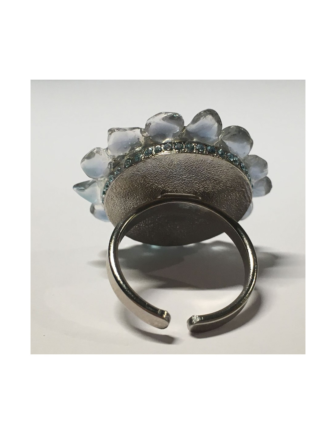 Bague fleur CHANEL haute couture. Centre en résine nacrée bleue entourée de strass bleu. Pétales en petites résines bleues. Contour en métal argenté serti de petits strass blancs. Jamais portée.