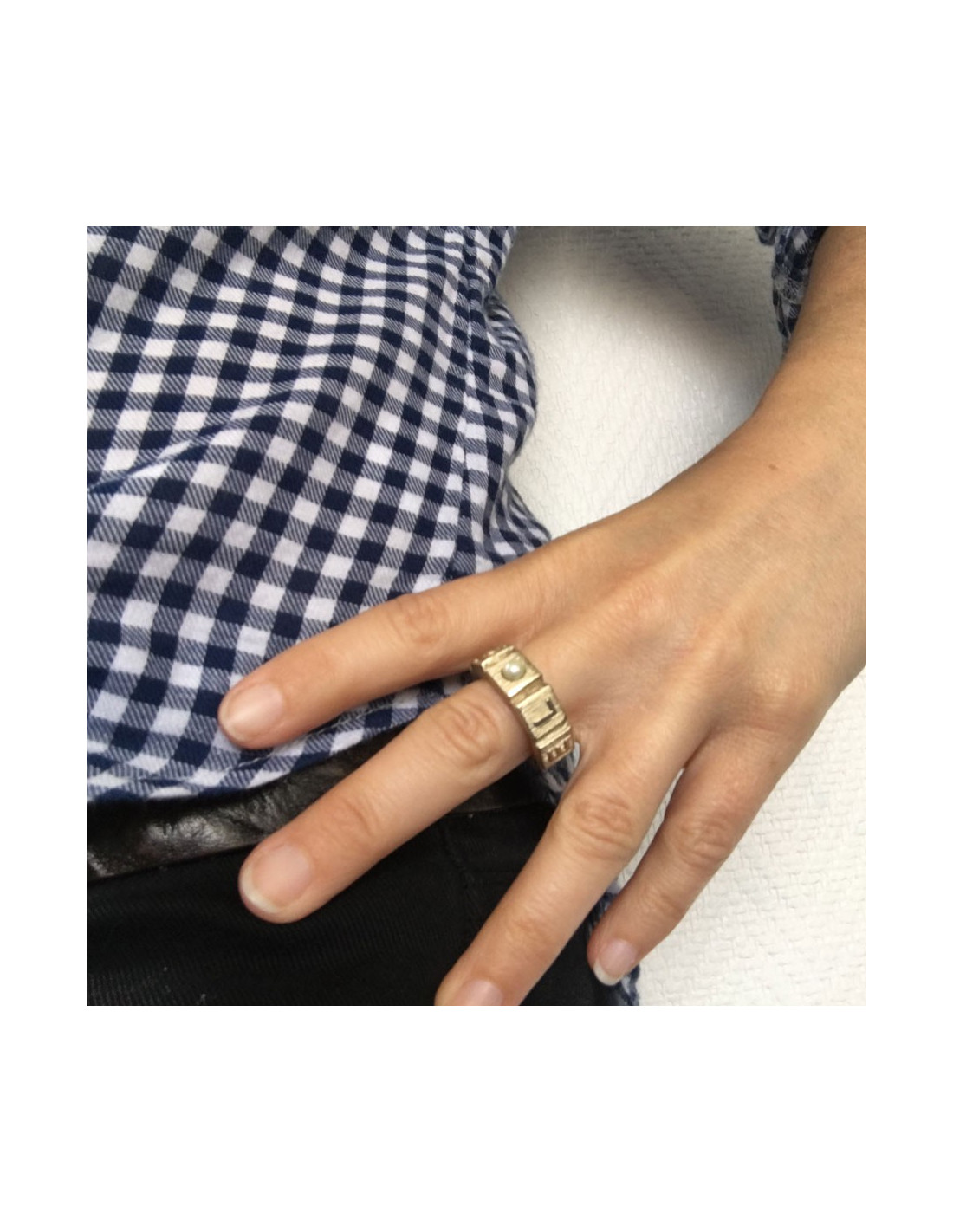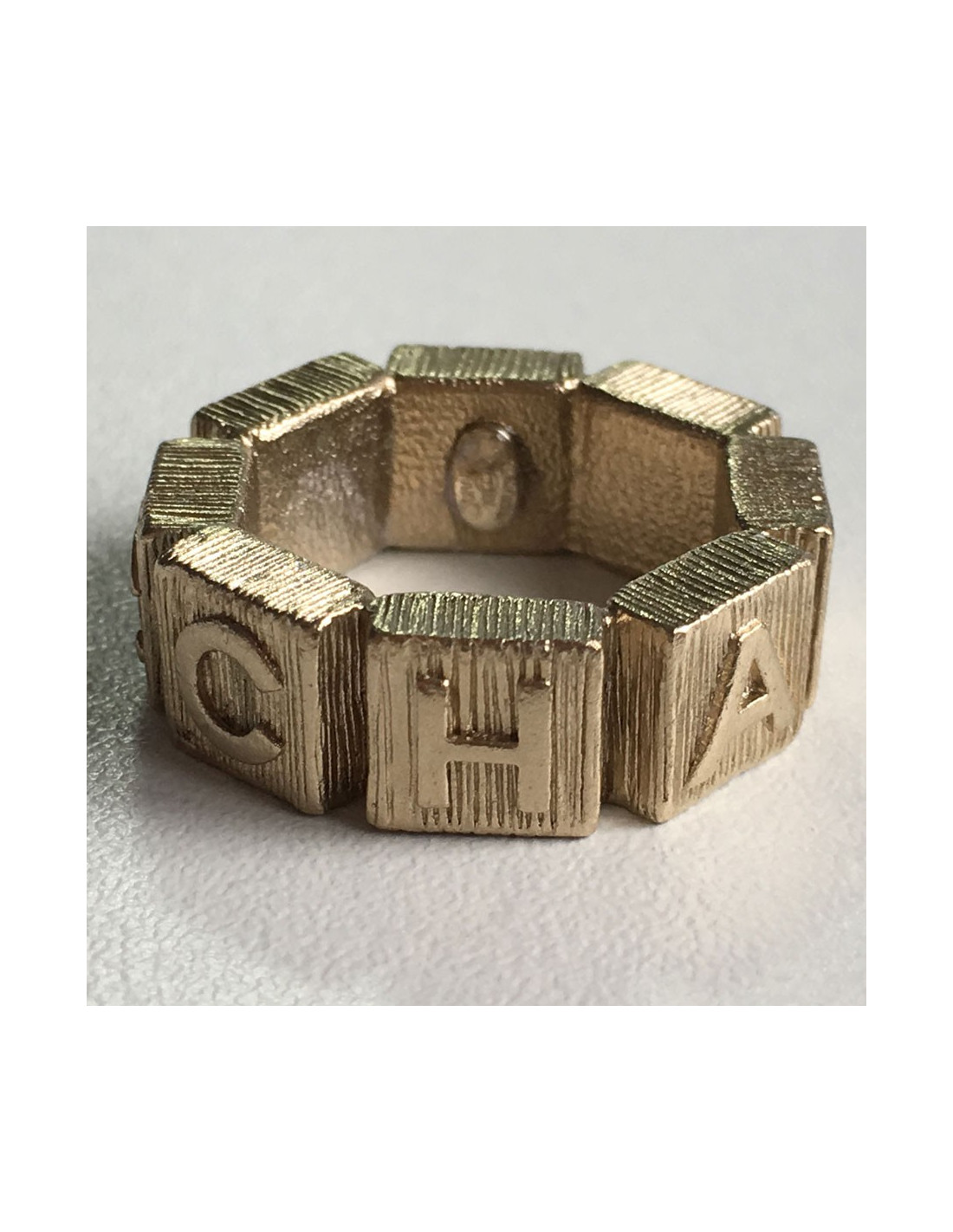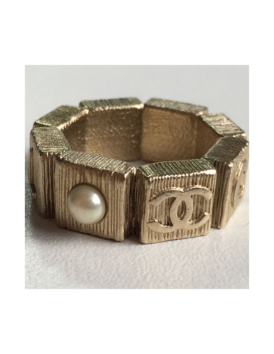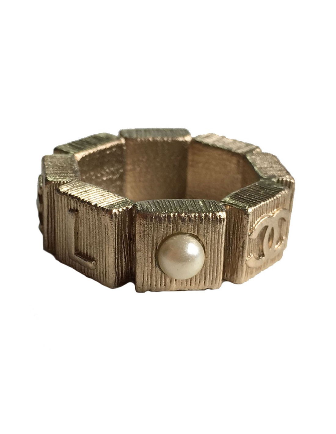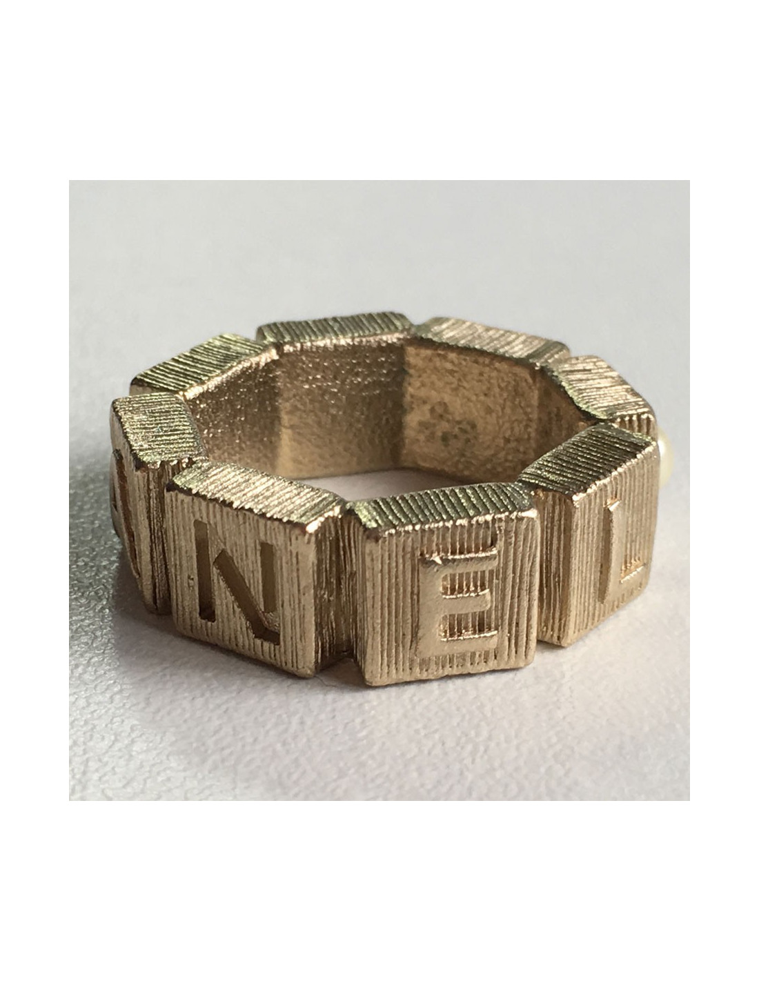 Belle bague CHANEL en métal couleur or pâle martelé sertie d'une petite perle nacrée. Un CC et CHANEL inscrits sur tout le tour de la bague. En très bon état. Pastille de la marque présente.