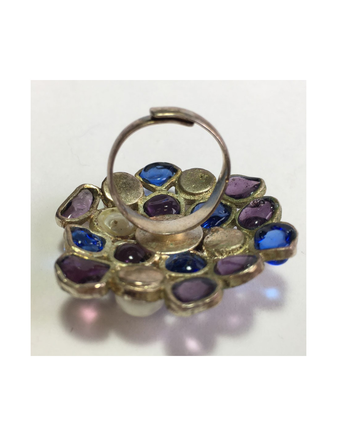 Très belle bague ronde MARGUERITE DE VALOIS en métal doré vieilli à l'or fin, sertie de pierres mauves et bleues en pâte de verre et de perles nacrées.