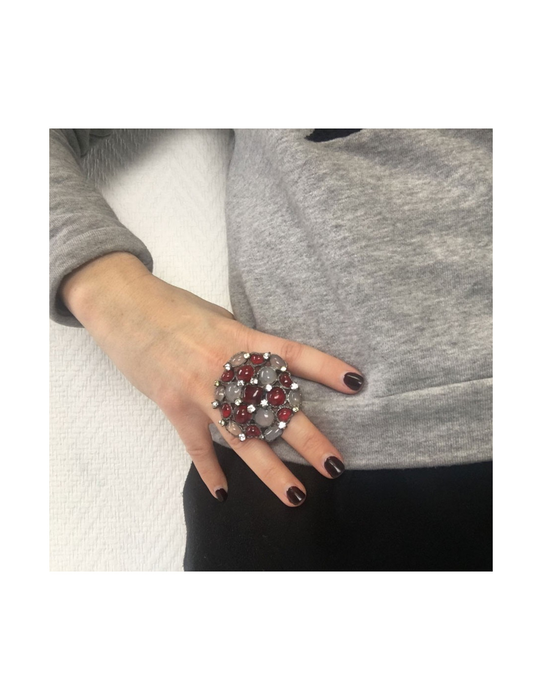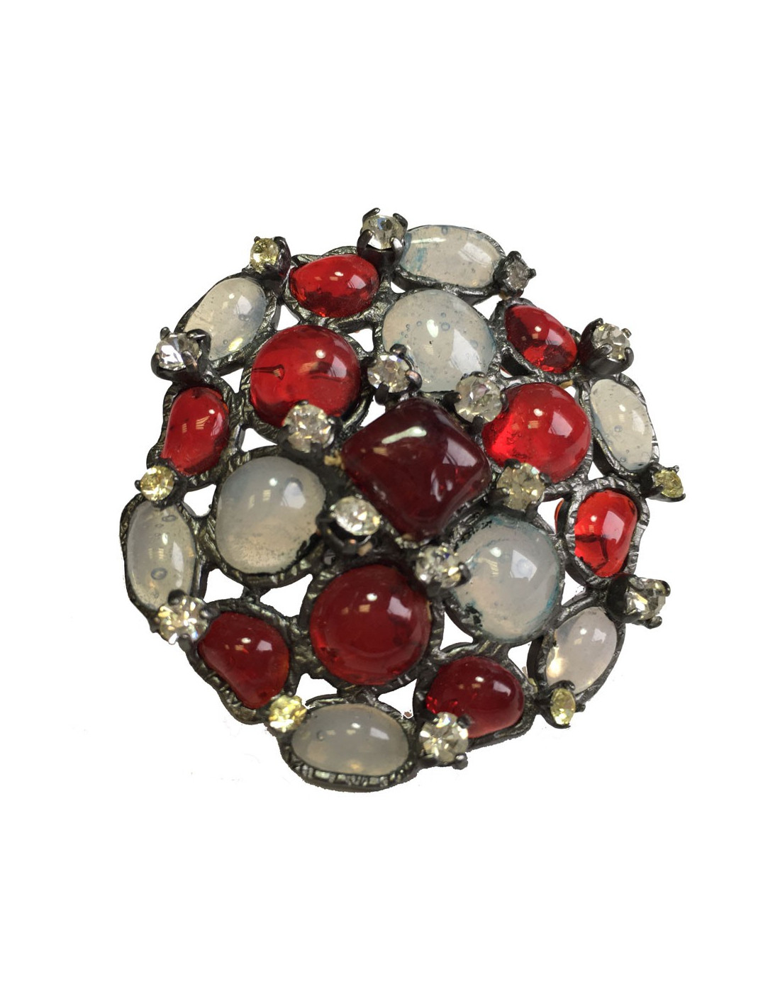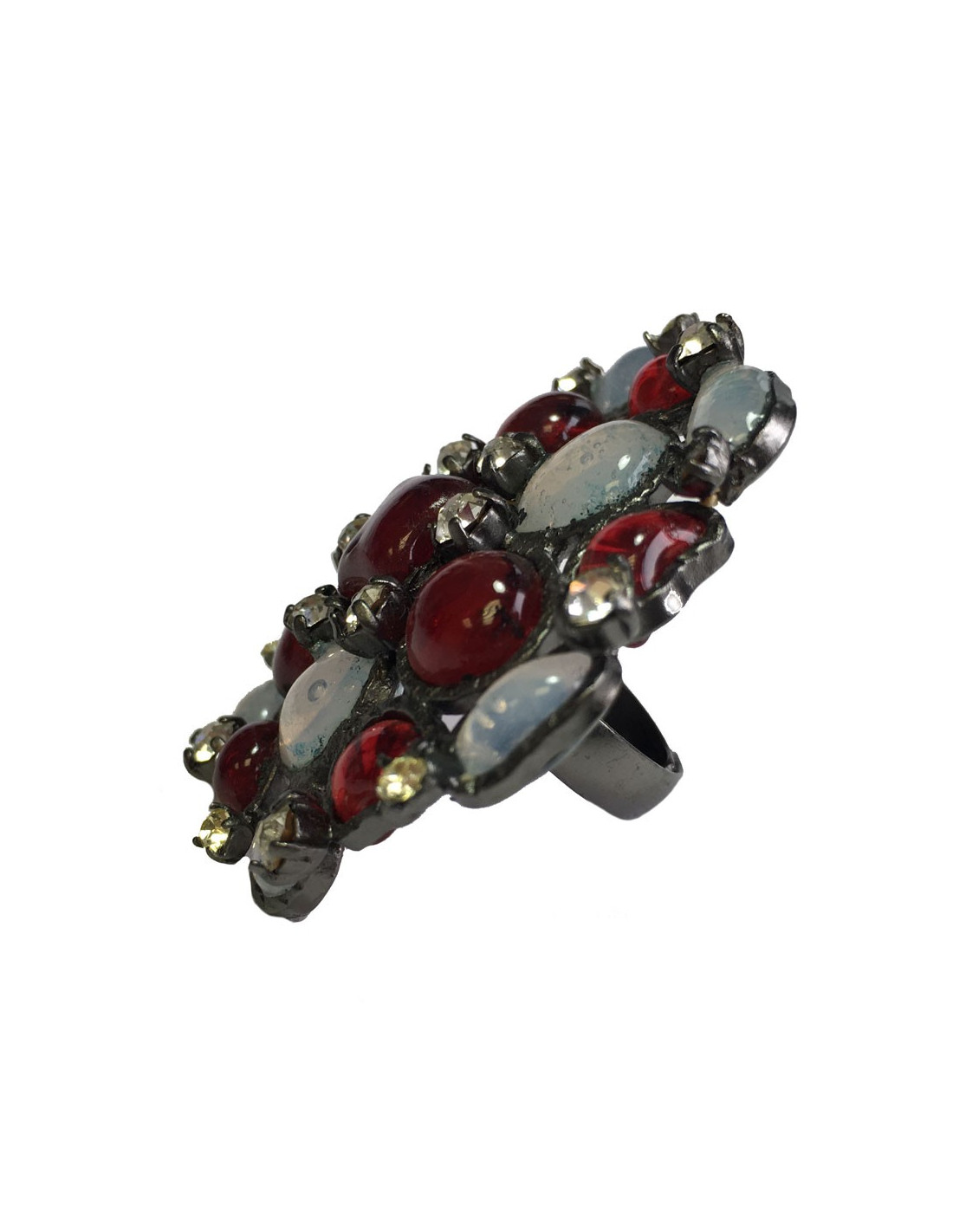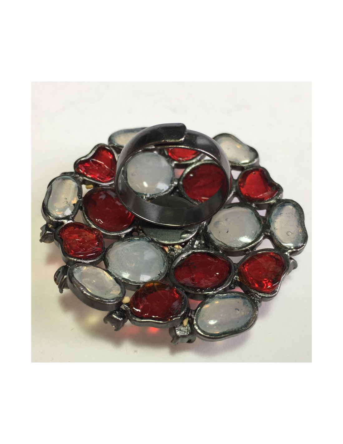 Très belle bague ronde MARGUERITE DE VALOIS en métal argenté et pâte de verre rouge et blanc transparent.