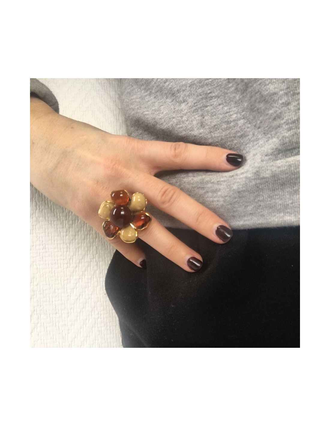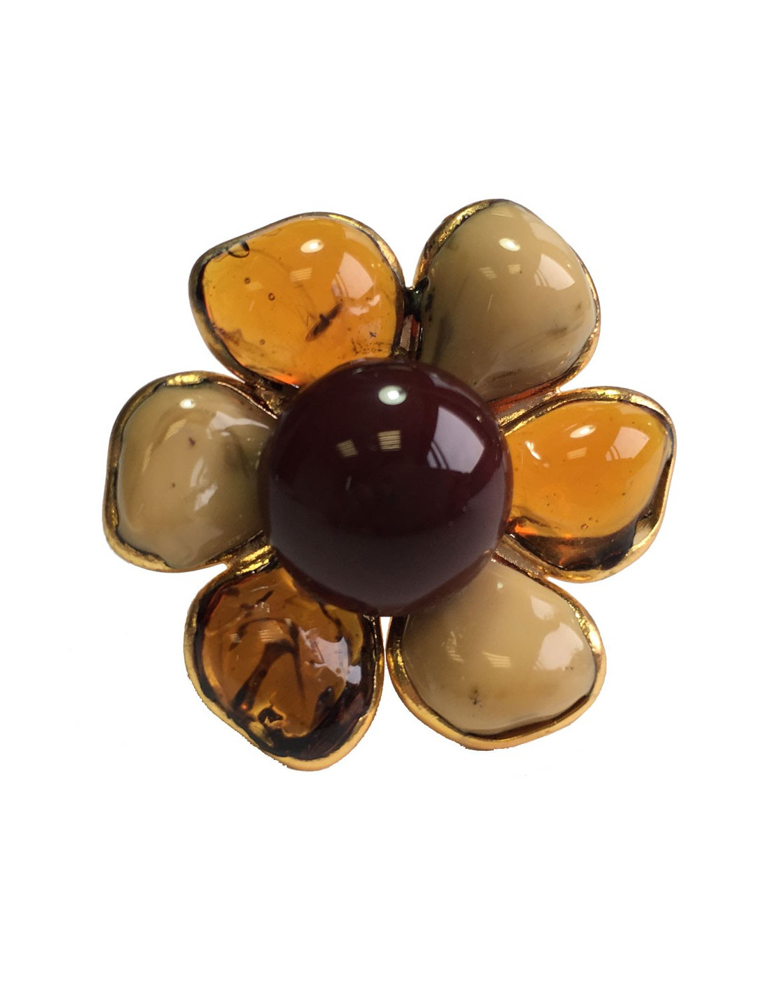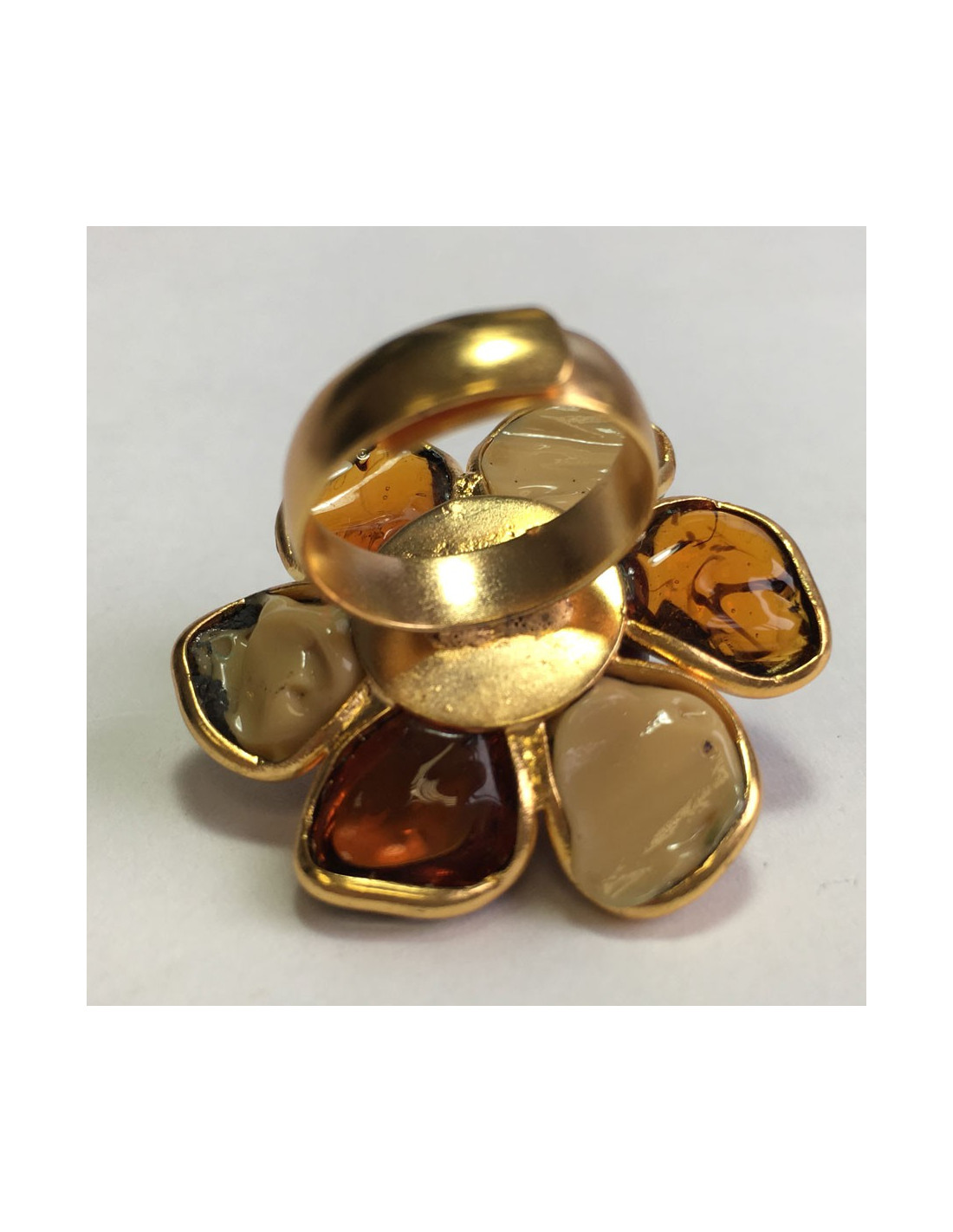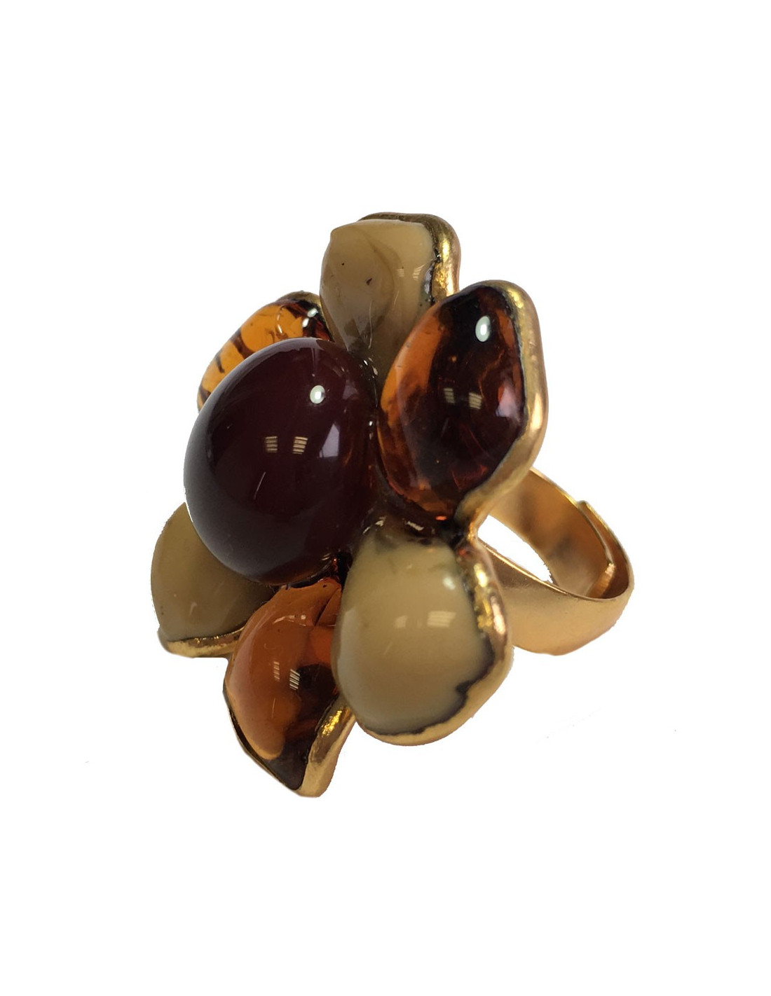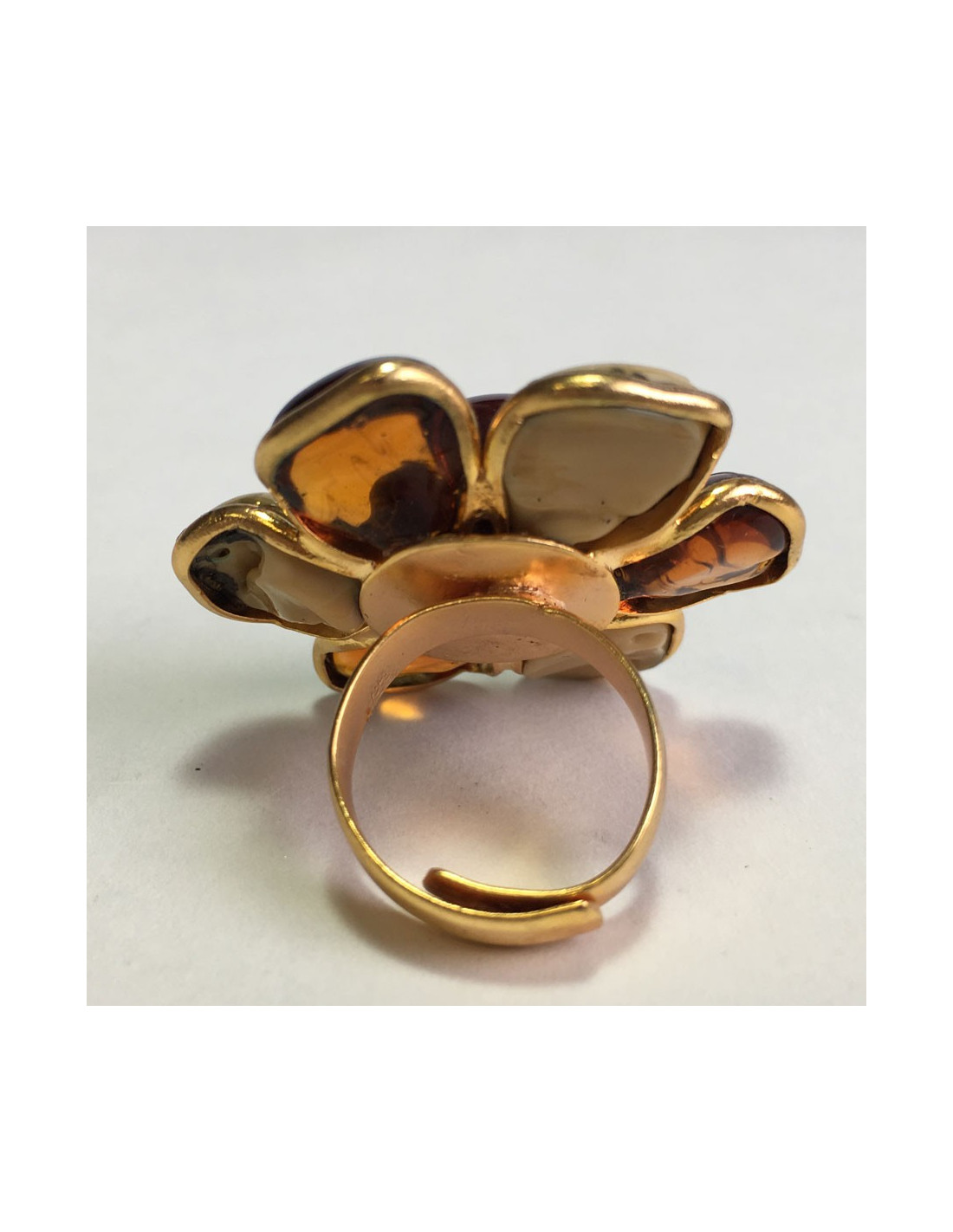 Très belle bague MARGUERITE DE VALOIS fleur en pâte de verre ambre et beige mêlé. Métal doré à l'or fin.