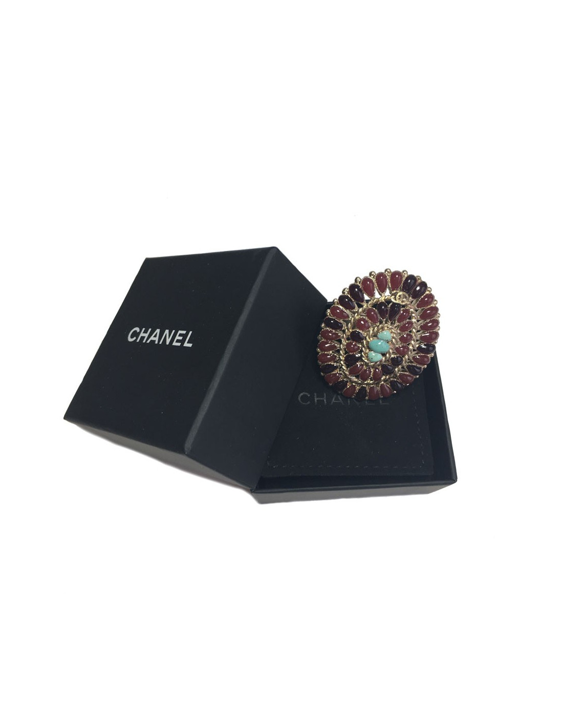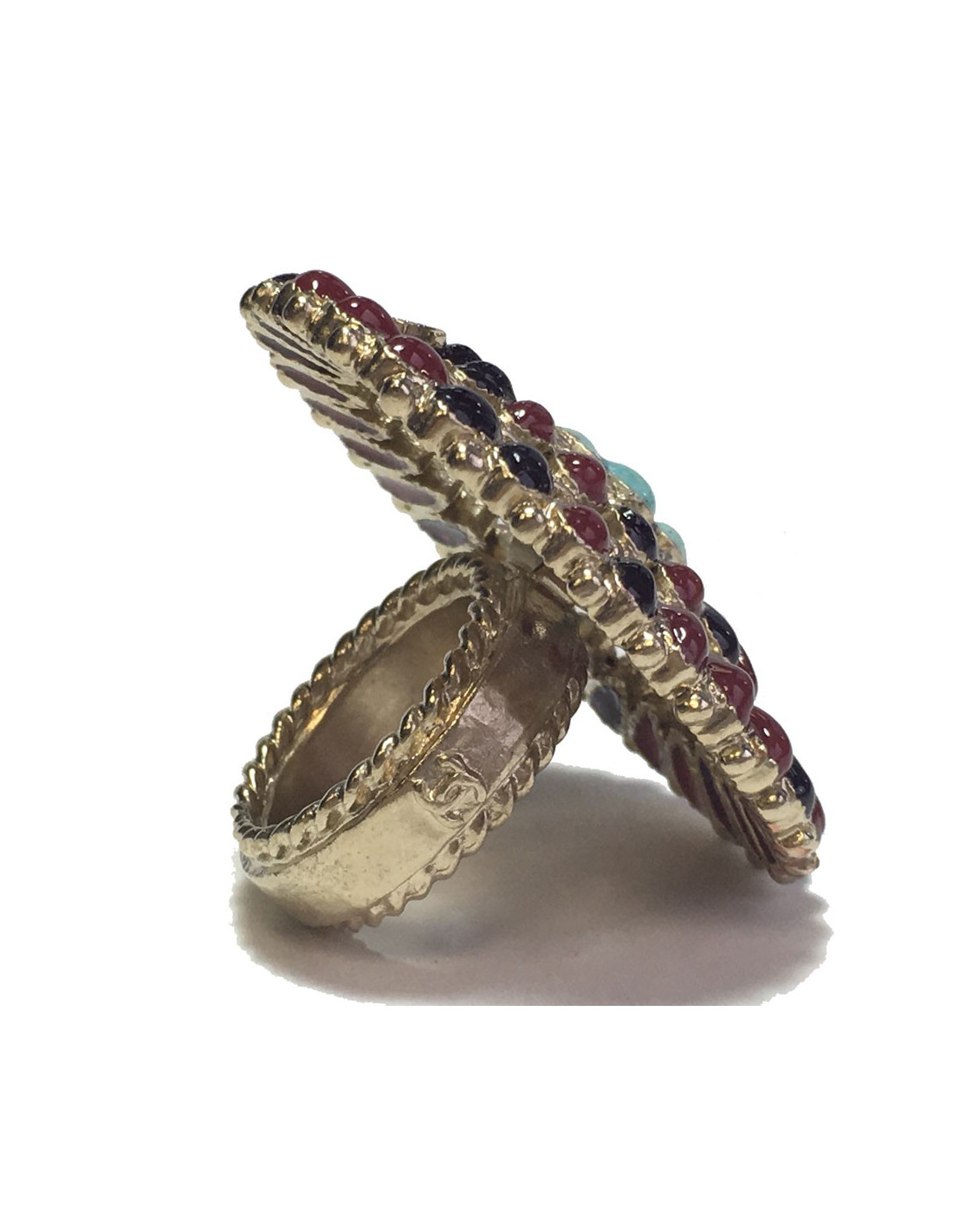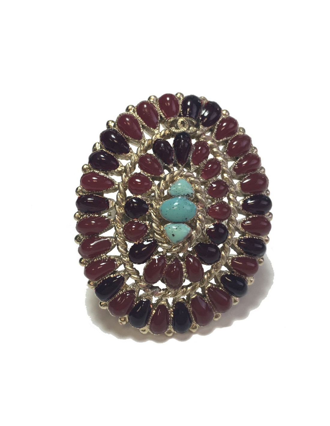Très belle bague Chanel issue la collection des métiers des Arts "Paris-Bombay". En métal doré, pâte de verre bordeaux clair et bordeaux foncé, 3 petites pierres turquoise au centre. Taille 54