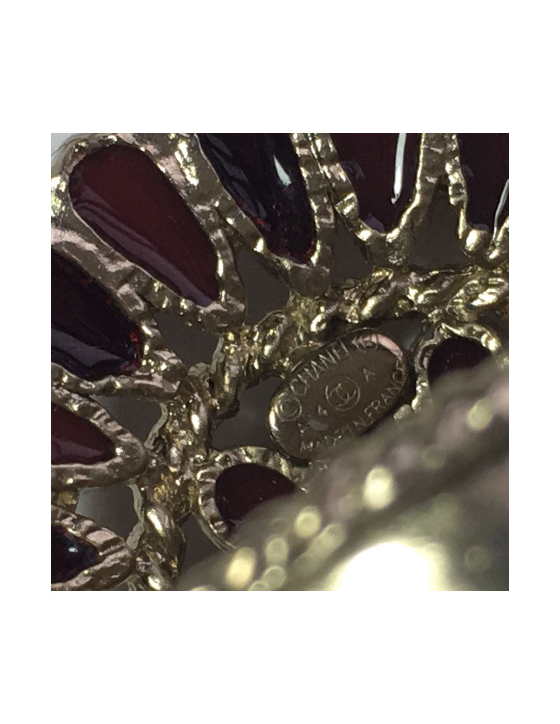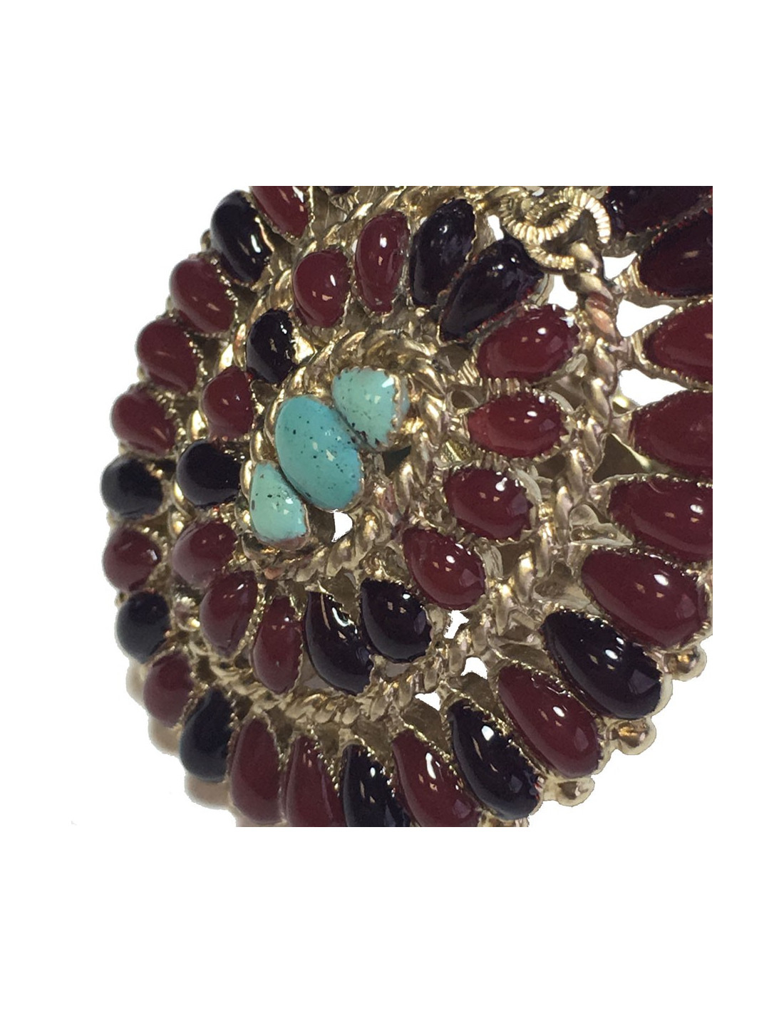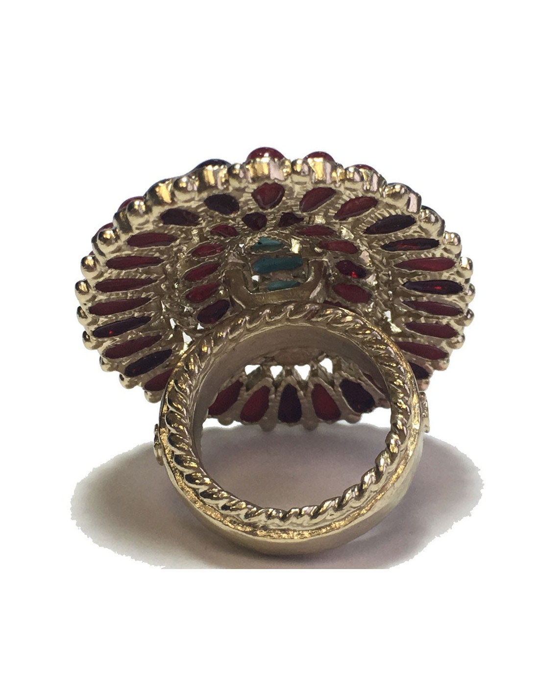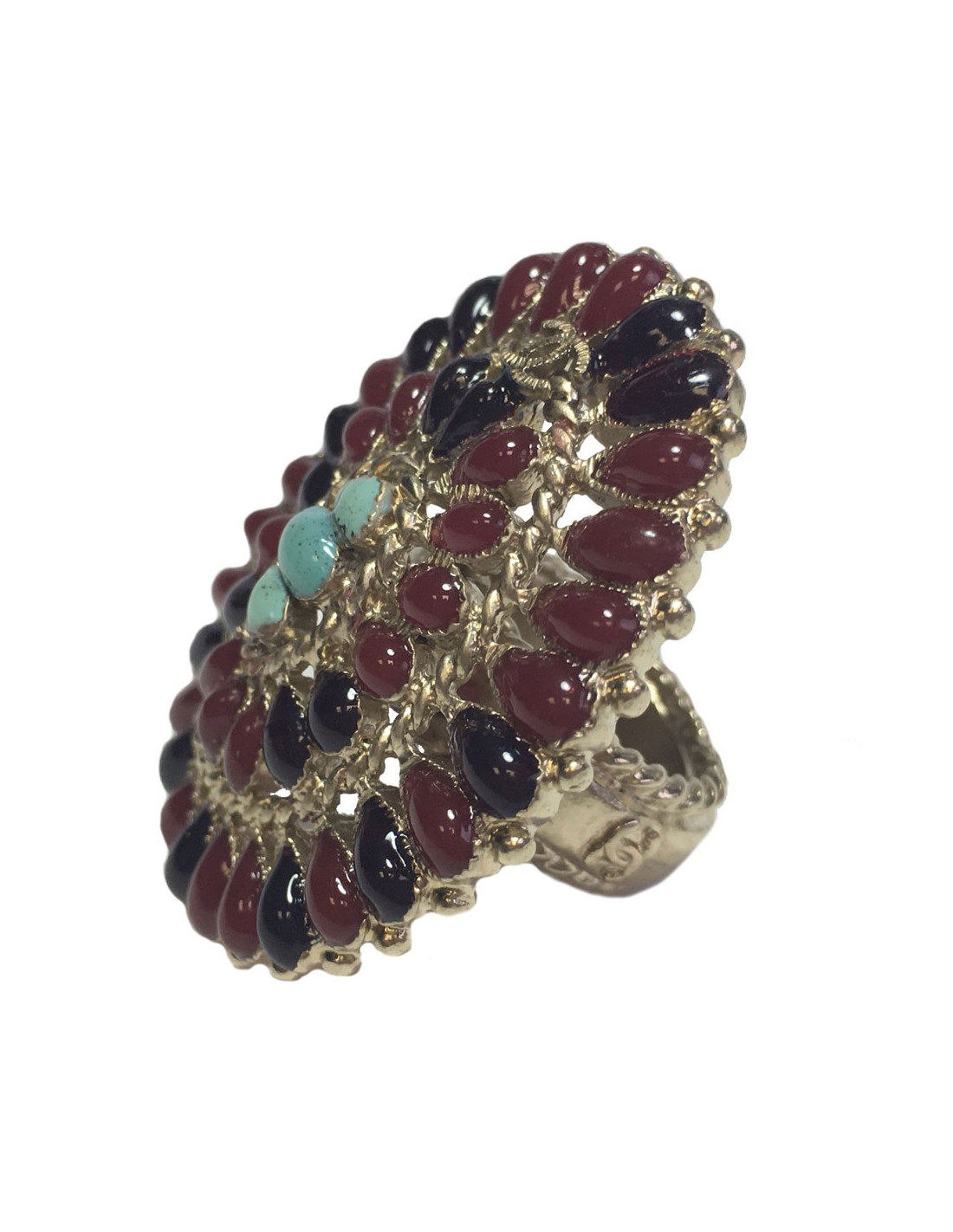 Très belle bague Chanel issue la collection des métiers des Arts "Paris-Bombay". En métal doré, pâte de verre bordeaux clair et bordeaux foncé, 3 petites pierres turquoise au centre. Taille 54
