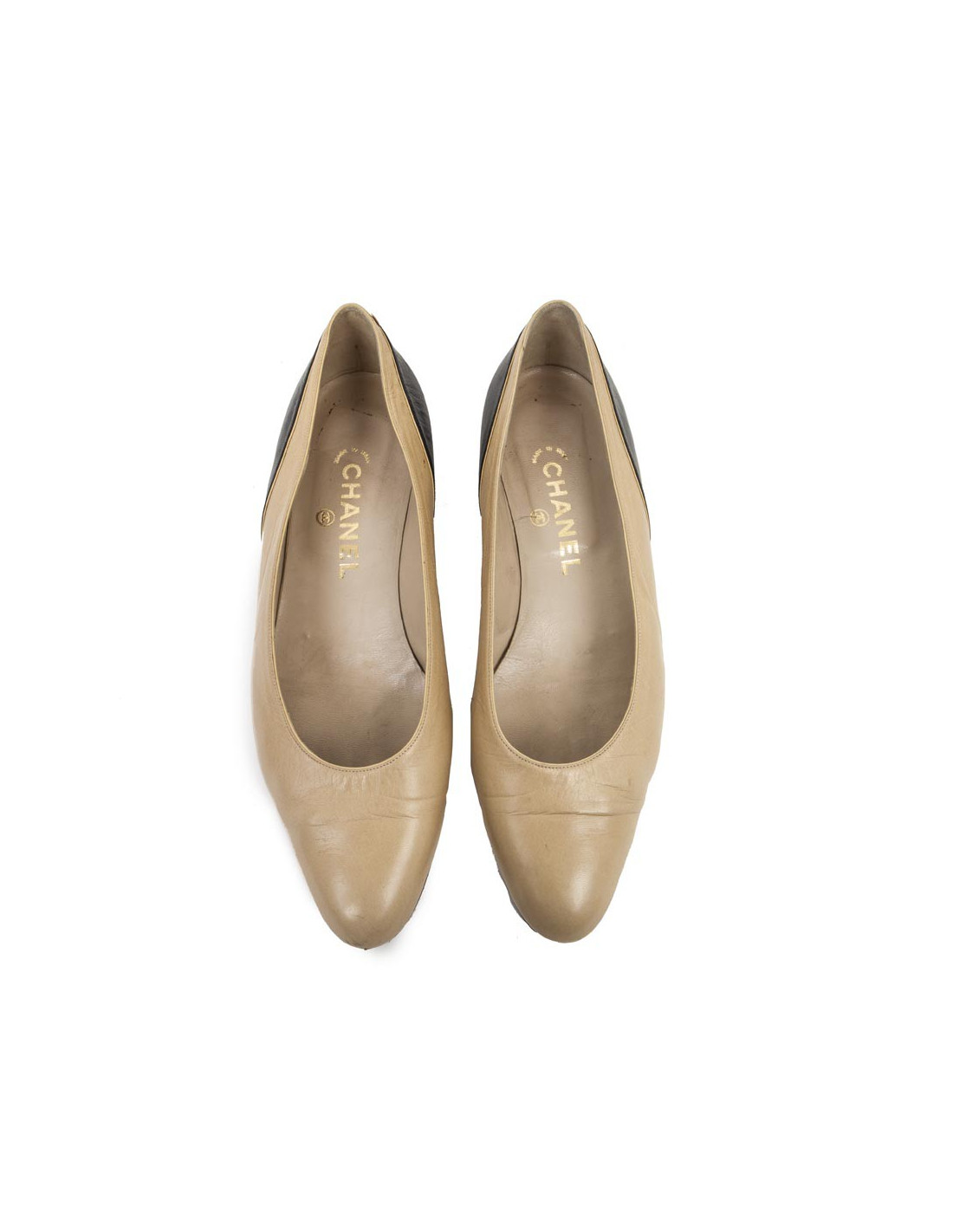 Ballerines CHANEL T 9 US (41FR) en cuir d'agneau lisse bicolore noir et beige.