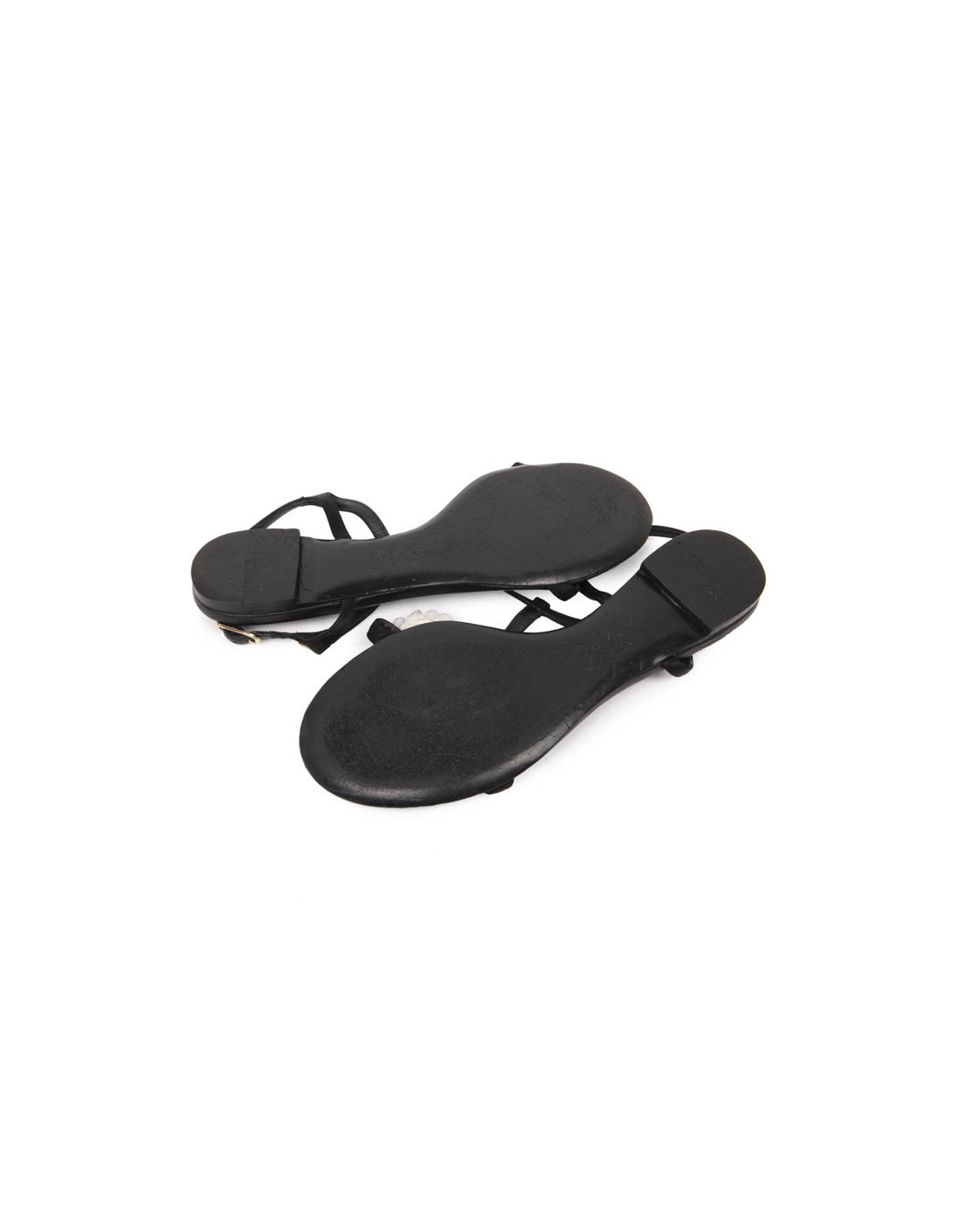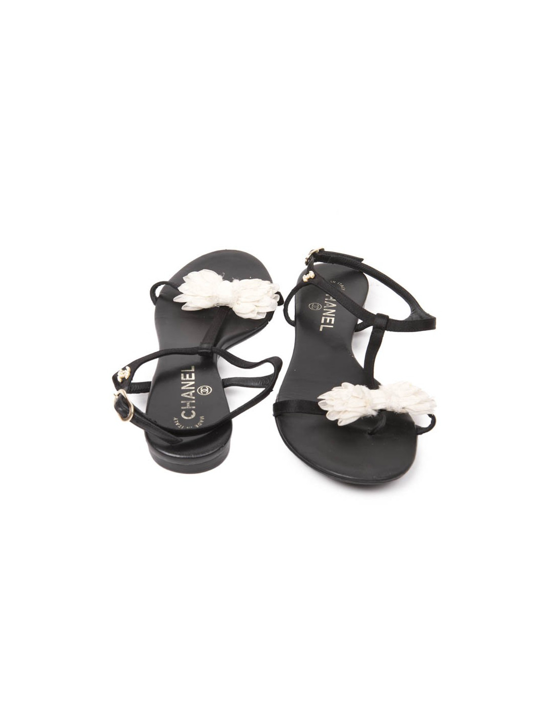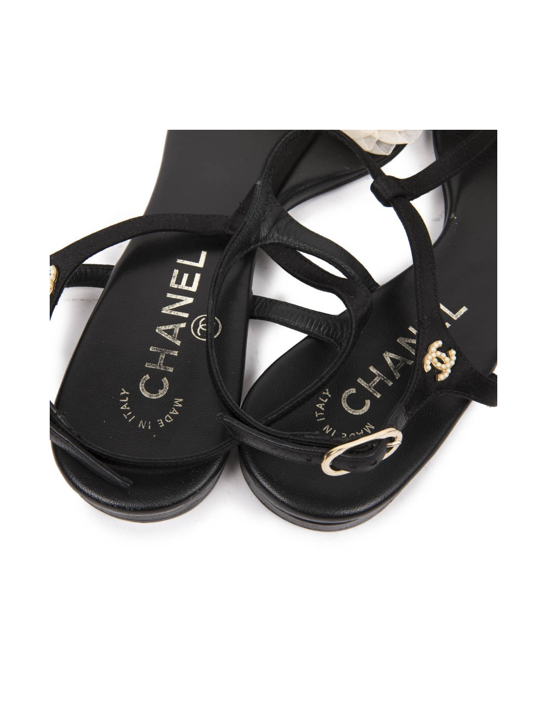 Tongs en cuir noir, taille 38.5 C, Maison Chanel . Les attaches sont en cuir et soie noirs. Le double "C" est perlé et doré.