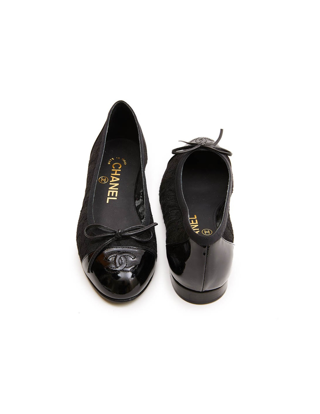 Ballerines T 34 CHANEL en dentelle et cuir noir