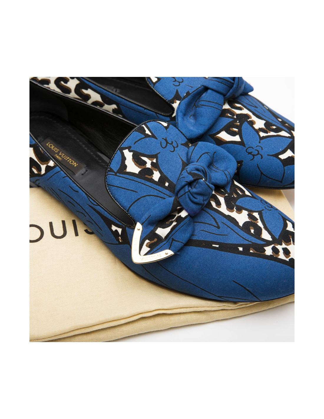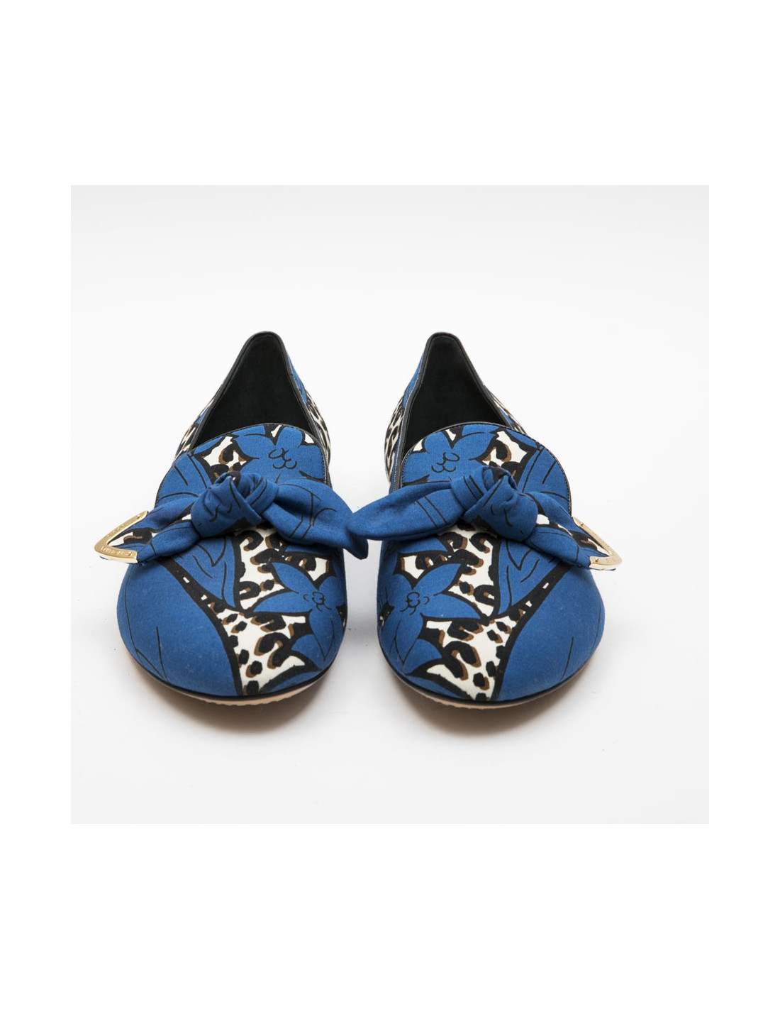 Ballerine " Richelieu" Louis Vuitton bleu et léopard. Noeud en tissu avec signature Louis Vuitton doré.