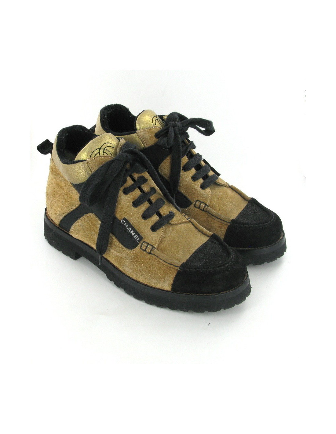 Superbes baskets CHANEL T38.5 bicolores : noir et beige et doré, en daim. Le sigle "CC" est brodé sur la languette. Elles se ferment à l'aide de lacets. La semelle intérieure est en cuir. Elles sont en très bon état, elles ont été portées 1 fois.