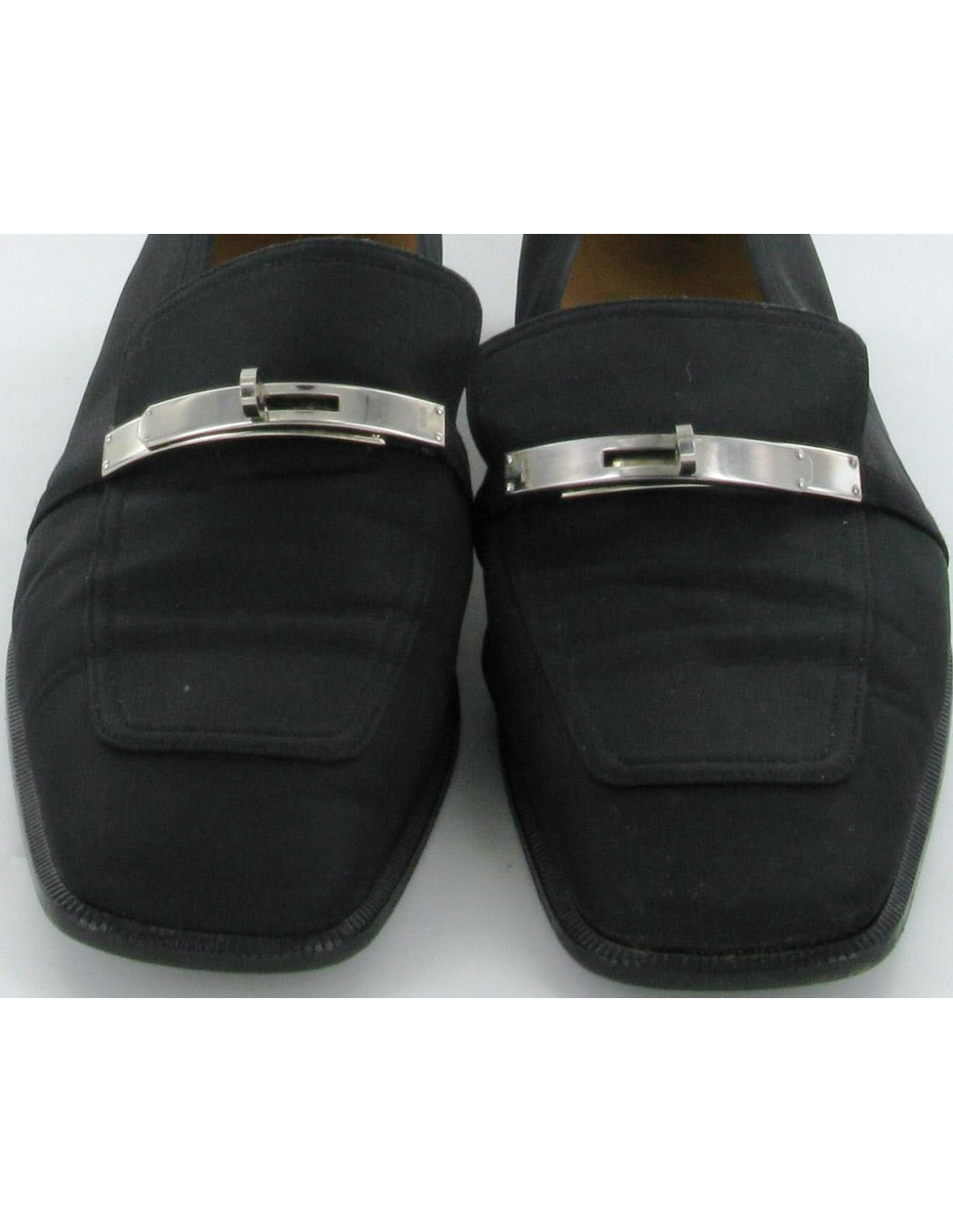 Mocassins HERMES en satin noir et boucle Kelly palladium T 38.