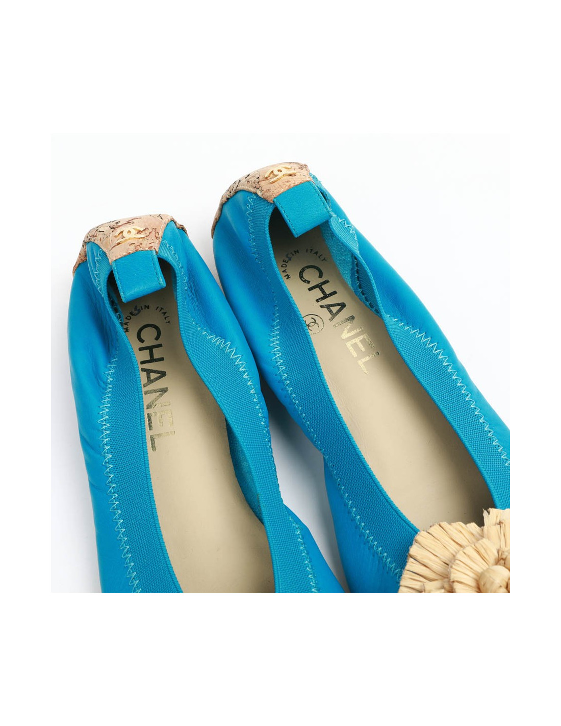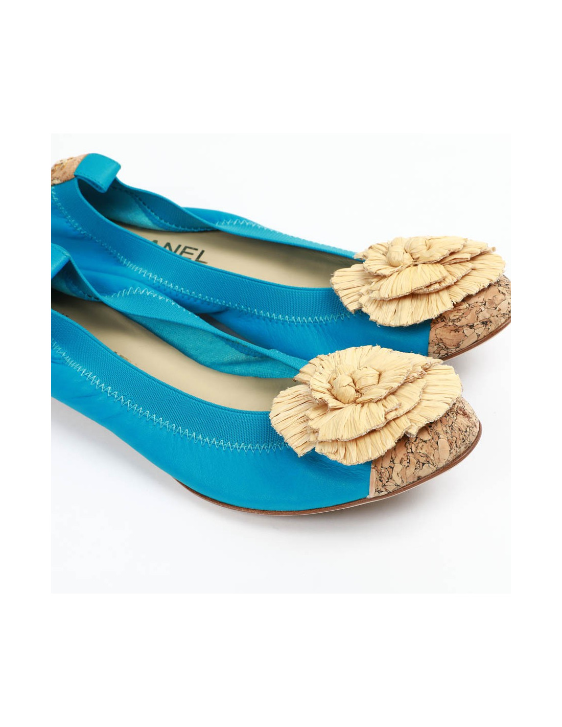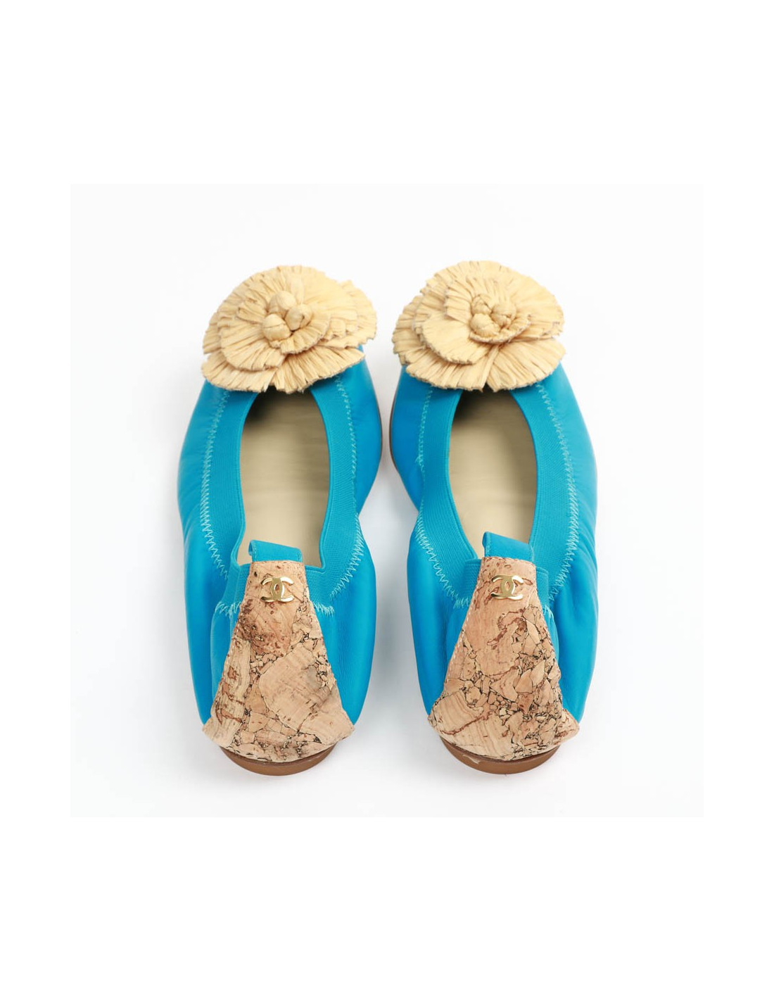 Elles sont en cuir d'agneau bleu électrique. L'arrière et l'avant sont en liège. Une grosse fleur en paille se trouve à l'avant.
