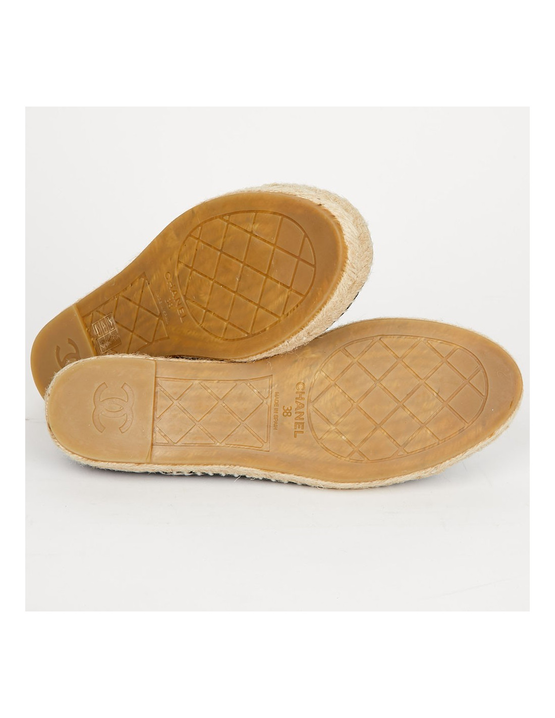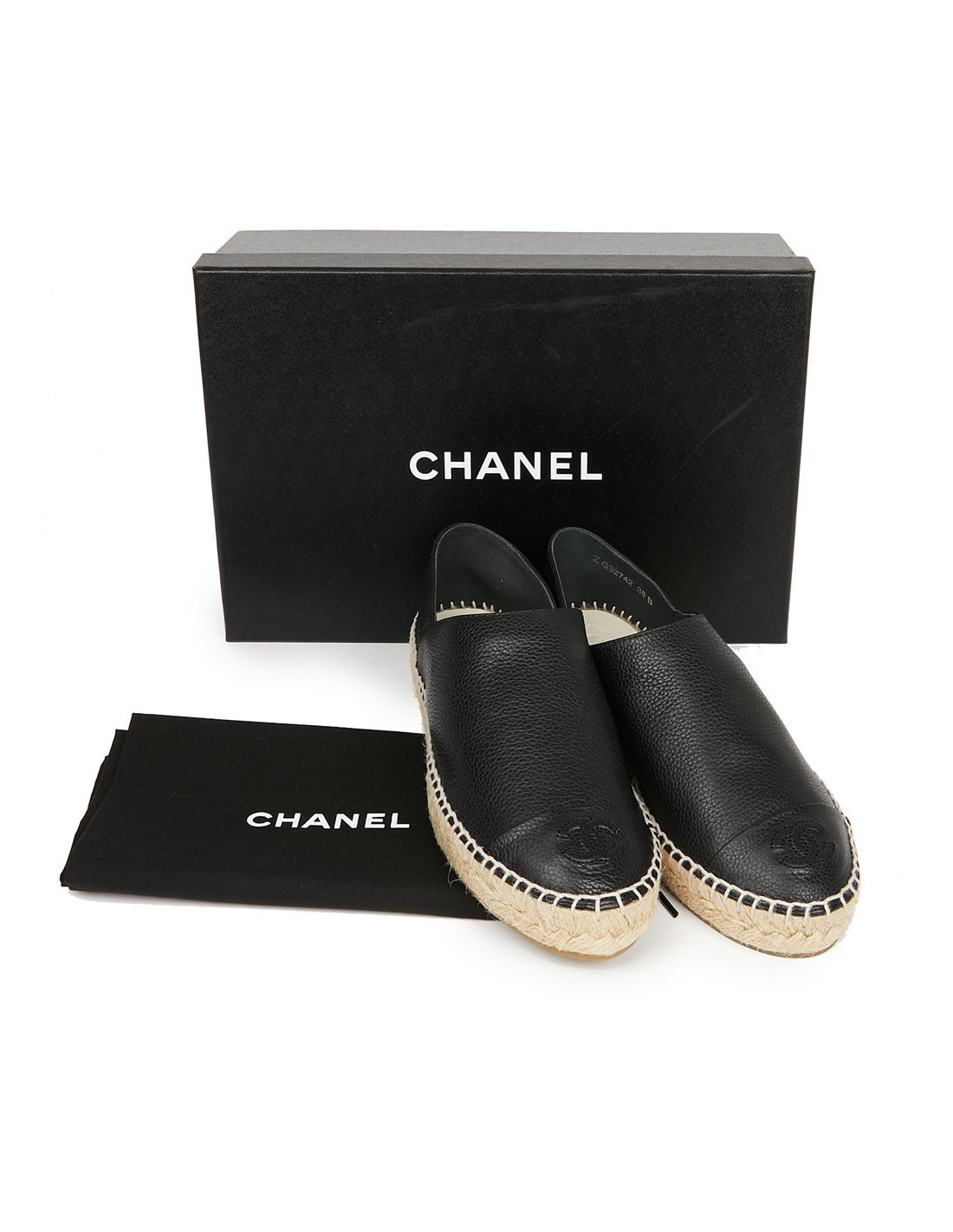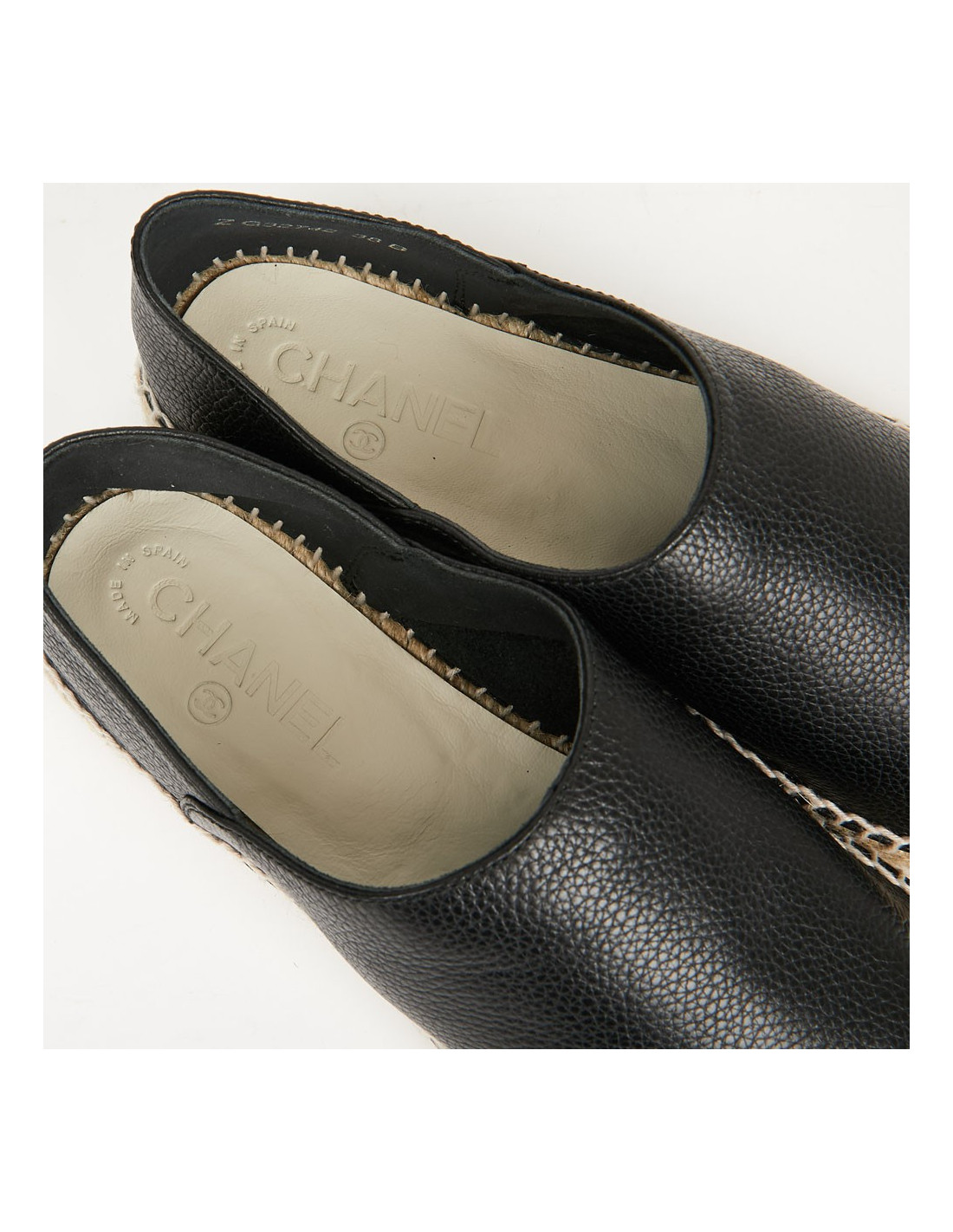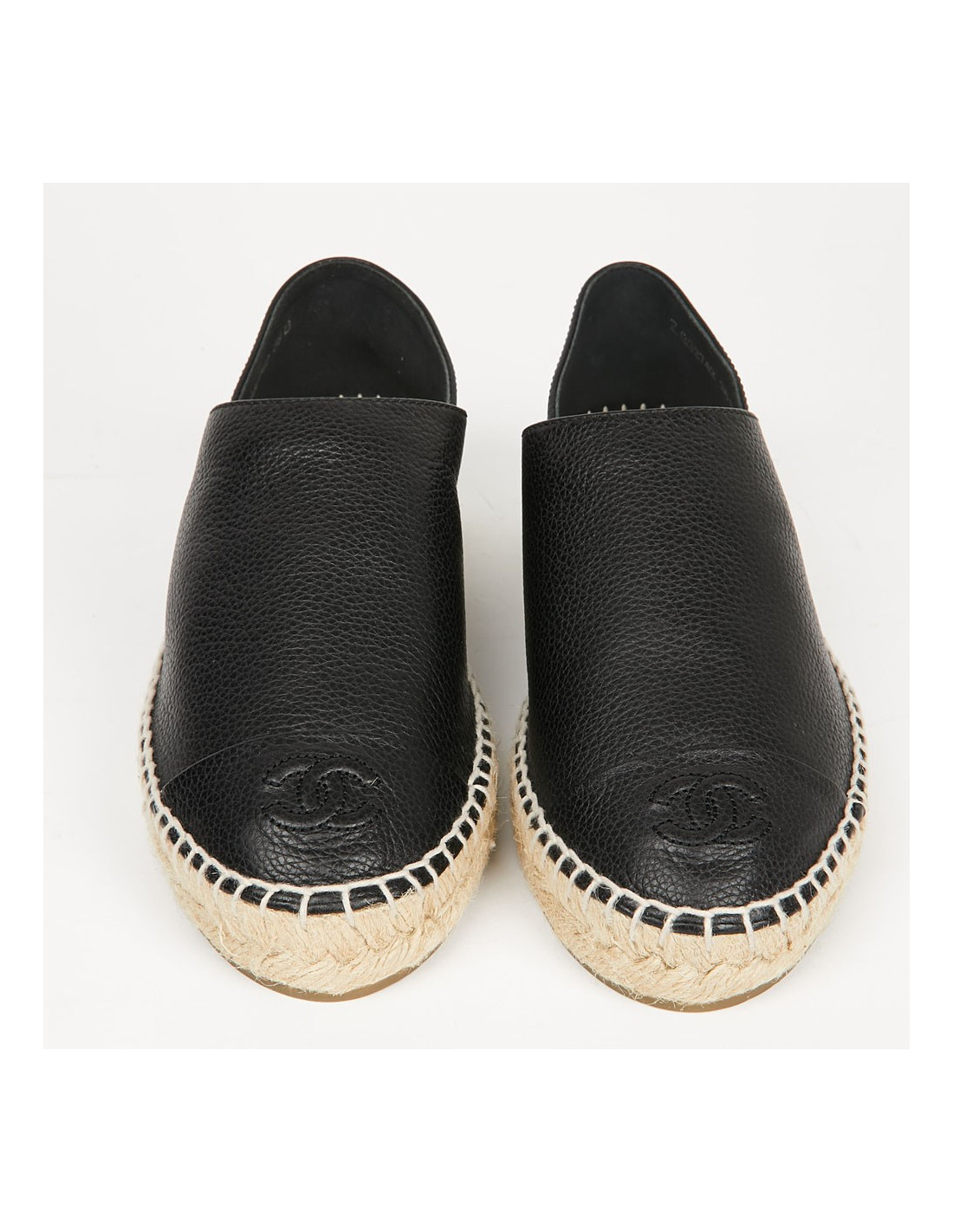 C'est le modèle à avoir dans sa garde robe pour l'été, la paire d'espadrilles Chanel. Grand classique de la Maison celles-ci sont en cuir grainé noir avec à leur bout le logo CC. La semelle est en corde et gomme. Elles n'ont jamais été portées.