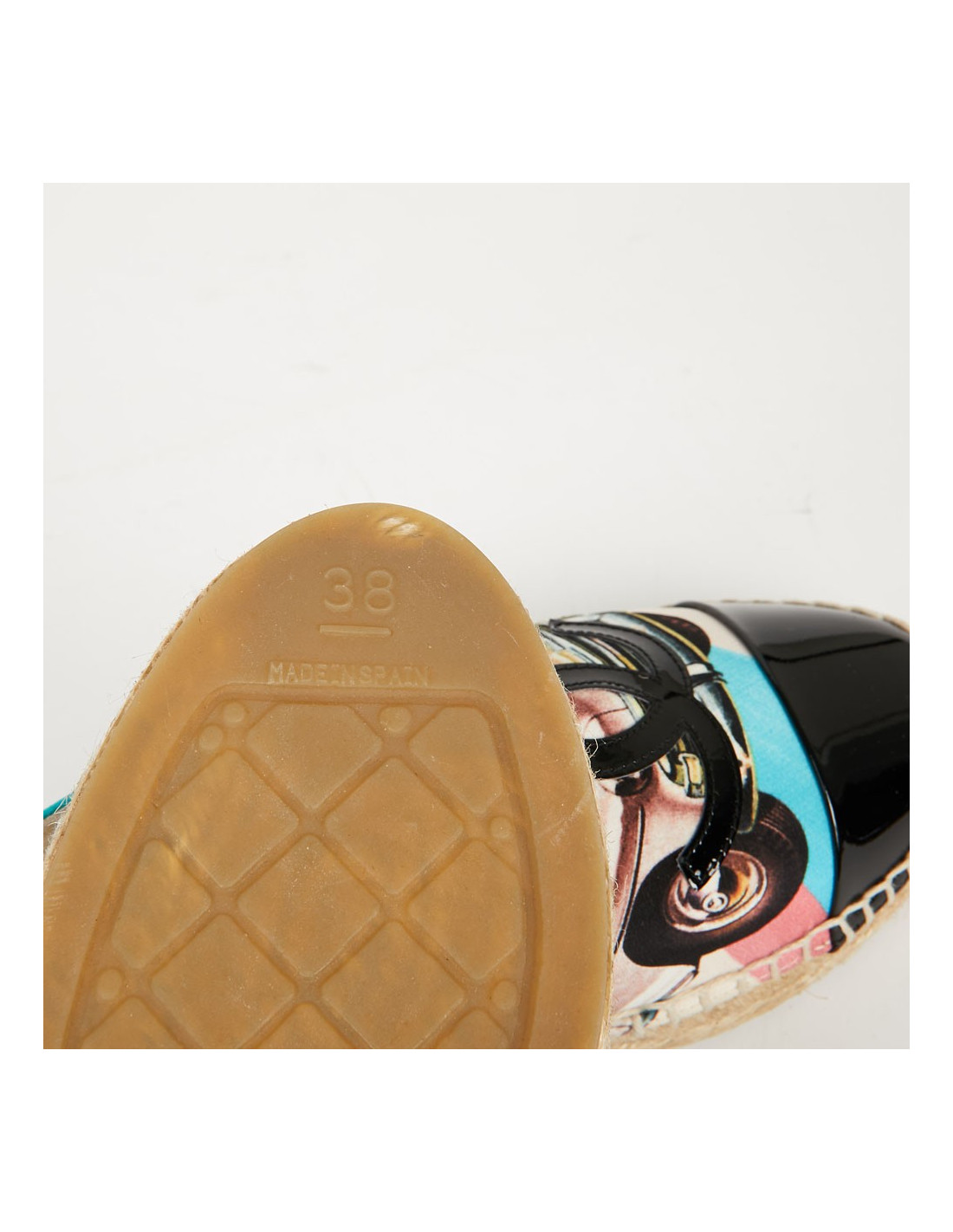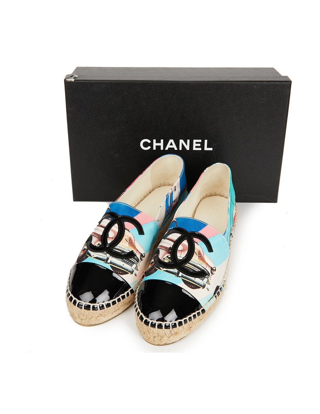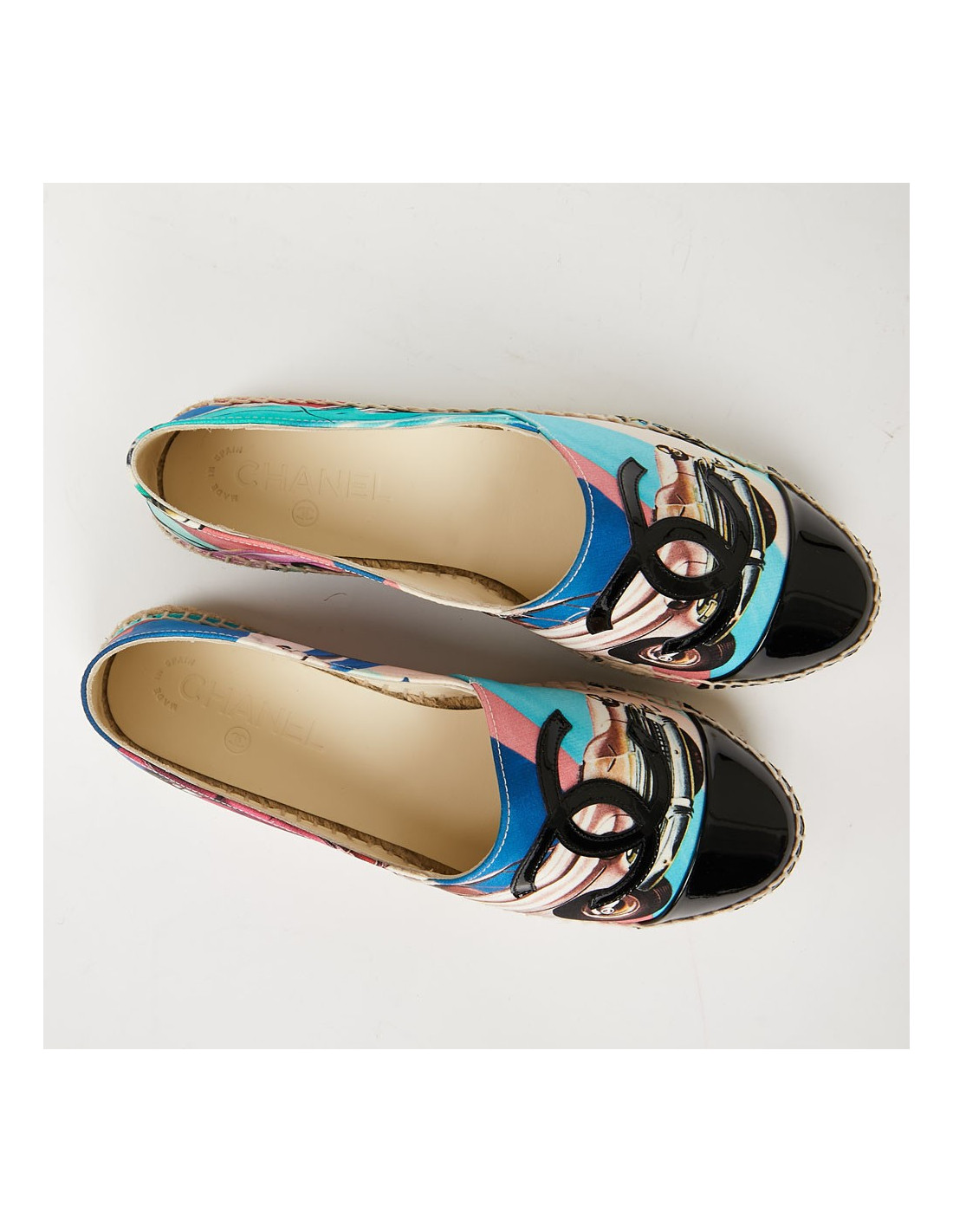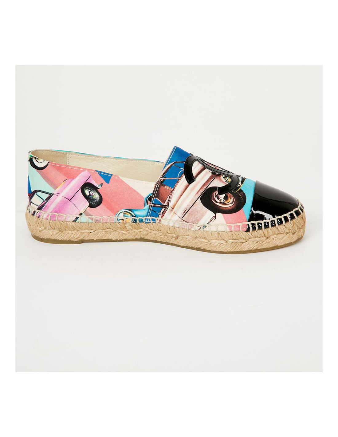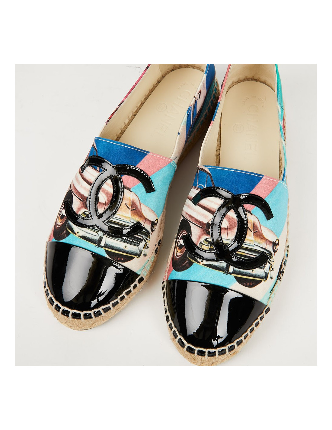 Ces espadrilles de la Maison Chanel sont en satin multicolore représentant une voiture américaine des années 70. Le bout de la chaussure ainsi que le grand CC sont en cuir verni noir. C'est une taille 38 fr. Elles sont doublées de cuir, la semelle est en corde fine et se termine par une couche en gomme estampillée "Chanel". On note : "Chanel, made in Spain" à l'intérieur. Elles n'ont jamais été portées.