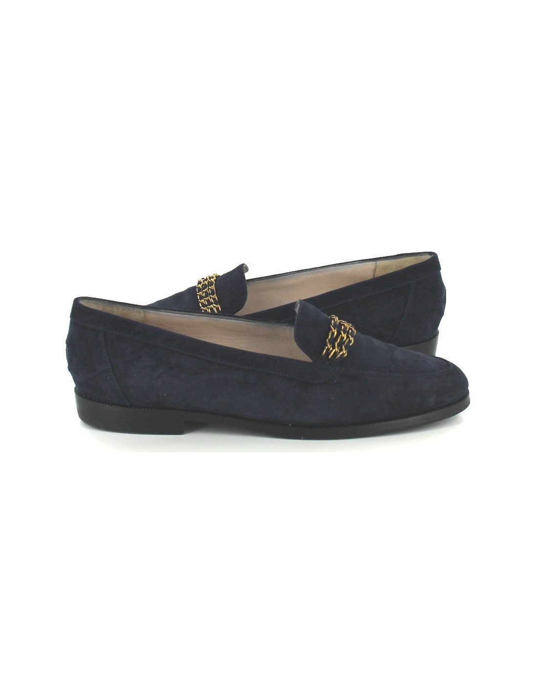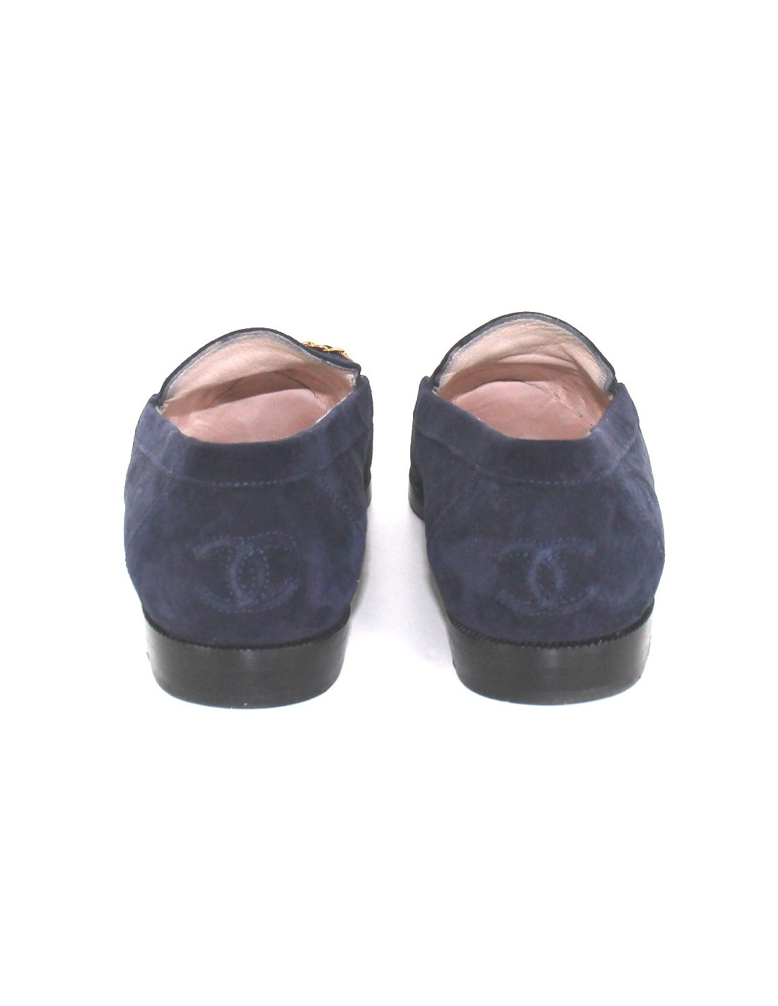 Mocassins CHANEL en veau velours bleu marine, taille 37,5. Collection Automne-Hiver 1994. Sur l'avant du pied, trois chaînes dorées sont brodées pour apporter une touche d'élégance. Signature CC brodée sur l'arrière du pied. Semelles intérieures et extérieures en cuir. Vendues dans leur boîte d'origine. Made in Italy.