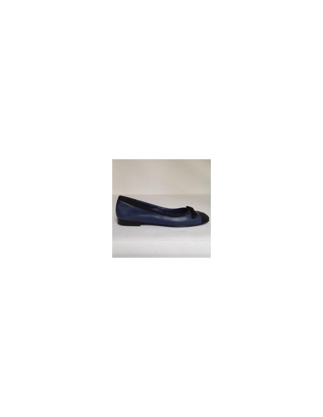 Très jolie paire de ballerines en cuir bicolore bleu foncé et noir Chanel T 37,5. Elles sont mi- cuir, mi- tissu avec un petit noeud à l'avant siglées "CC". En très bon état.
