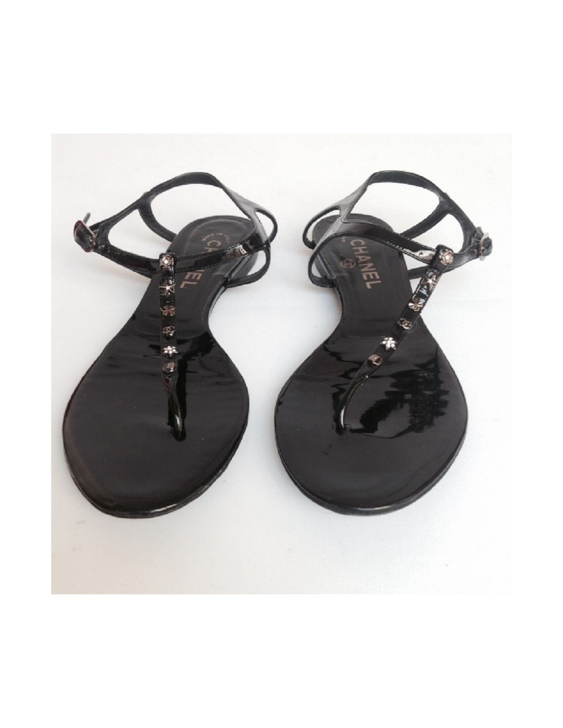 Sandales plates en cuir verni noir CHANEL T39